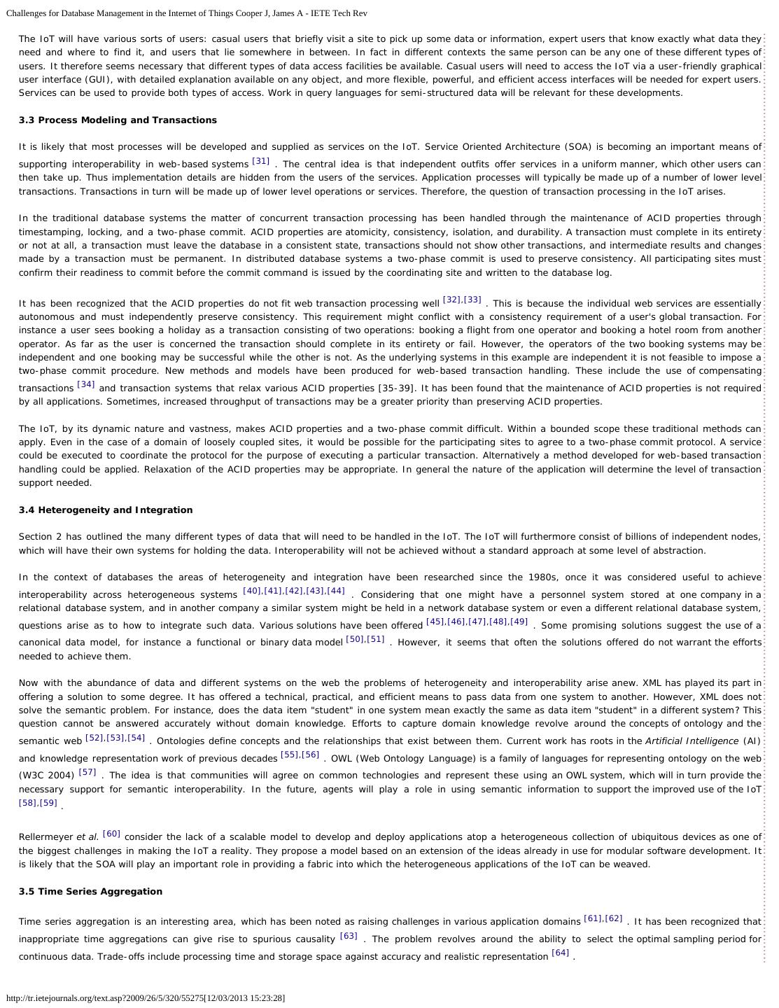 6 .Challenges for Database Management in the Internet of Things Cooper J, James A - IETE Tech Rev The IoT will have various sorts of users: casual users that briefly visit a site to pick up some data or information, expert users that know exactly what data they need and where to find it, and users that lie somewhere in between. In fact in different contexts the same person can be any one of these different types of users. It therefore seems necessary that different types of data access facilities be available. Casual users will need to access the IoT via a user-friendly graphical user interface (GUI), with detailed explanation available on any object, and more flexible, powerful, and efficient access interfaces will be needed for expert users. Services can be used to provide both types of access. Work in query languages for semi-structured data will be relevant for these developments. 3.3 Process Modeling and Transactions It is likely that most processes will be developed and supplied as services on the IoT. Service Oriented Architecture (SOA) is becoming an important means of supporting interoperability in web-based systems [31] . The central idea is that independent outfits offer services in a uniform manner, which other users can then take up. Thus implementation details are hidden from the users of the services. Application processes will typically be made up of a number of lower level transactions. Transactions in turn will be made up of lower level operations or services. Therefore, the question of transaction processing in the IoT arises. In the traditional database systems the matter of concurrent transaction processing has been handled through the maintenance of ACID properties through timestamping, locking, and a two-phase commit. ACID properties are atomicity, consistency, isolation, and durability. A transaction must complete in its entirety or not at all, a transaction must leave the database in a consistent state, transactions should not show other transactions, and intermediate results and changes made by a transaction must be permanent. In distributed database systems a two-phase commit is used to preserve consistency. All participating sites must confirm their readiness to commit before the commit command is issued by the coordinating site and written to the database log. It has been recognized that the ACID properties do not fit web transaction processing well [32],[33] . This is because the individual web services are essentially autonomous and must independently preserve consistency. This requirement might conflict with a consistency requirement of a user's global transaction. For instance a user sees booking a holiday as a transaction consisting of two operations: booking a flight from one operator and booking a hotel room from another operator. As far as the user is concerned the transaction should complete in its entirety or fail. However, the operators of the two booking systems may be independent and one booking may be successful while the other is not. As the underlying systems in this example are independent it is not feasible to impose a two-phase commit procedure. New methods and models have been produced for web-based transaction handling. These include the use of compensating transactions [34] and transaction systems that relax various ACID properties [35-39]. It has been found that the maintenance of ACID properties is not required by all applications. Sometimes, increased throughput of transactions may be a greater priority than preserving ACID properties. The IoT, by its dynamic nature and vastness, makes ACID properties and a two-phase commit difficult. Within a bounded scope these traditional methods can apply. Even in the case of a domain of loosely coupled sites, it would be possible for the participating sites to agree to a two-phase commit protocol. A service could be executed to coordinate the protocol for the purpose of executing a particular transaction. Alternatively a method developed for web-based transaction handling could be applied. Relaxation of the ACID properties may be appropriate. In general the nature of the application will determine the level of transaction support needed. 3.4 Heterogeneity and Integration Section 2 has outlined the many different types of data that will need to be handled in the IoT. The IoT will furthermore consist of billions of independent nodes, which will have their own systems for holding the data. Interoperability will not be achieved without a standard approach at some level of abstraction. In the context of databases the areas of heterogeneity and integration have been researched since the 1980s, once it was considered useful to achieve interoperability across heterogeneous systems [40],[41], [42],[43], [44] . Considering that one might have a personnel system stored at one company in a relational database system, and in another company a similar system might be held in a network database system or even a different relational database system, questions arise as to how to integrate such data. Various solutions have been offered [45],[46],[47],[48],[49] . Some promising solutions suggest the use of a canonical data model, for instance a functional or binary data model [50],[51] . However, it seems that often the solutions offered do not warrant the efforts needed to achieve them. Now with the abundance of data and different systems on the web the problems of heterogeneity and interoperability arise anew. XML has played its part in offering a solution to some degree. It has offered a technical, practical, and efficient means to pass data from one system to another. However, XML does not solve the semantic problem. For instance, does the data item "student" in one system mean exactly the same as data item "student" in a different system? This question cannot be answered accurately without domain knowledge. Efforts to capture domain knowledge revolve around the concepts of ontology and the semantic web [52],[5