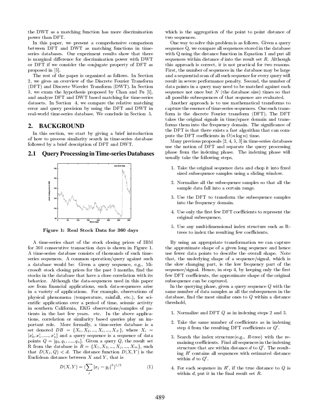 2 .the DWT as a matching function has more discrimination which is the aggregation of the point to point distance of power than DFT. two sequences. In this paper, we present a comprehensive comparison One way to solve this problem is as follows. Given a query between DFT and DWT as matching functions in time- sequence Q, we compare all sequences stored in the database series databases. Our experiment results show that there with Q using the distance function in Equation 1 and put all is marginal di erence for discrimination power with DWT sequences within distance d into the result set R. Although or DFT if we consider the conjugate property of DFT as this approach is correct, it is not practical for two reasons. proposed in 5]. First, the number of sequences in the database may be large The rest of the paper is organized as follows. In Section and a sequential scan of all such sequence for every query will 2, we gives an overview of the Discrete Fourier Transform result in severe performance penalty. Second, the number of (DFT) and Discrete Wavelet Transform (DWT). In Section data points in a query may need to be matched against each 3, we exam the hypothesis proposed by Chan and Fu 1], sequence not once but N (the database size) times so that and analyze DFT and DWT based matching for time-series all possible subsequences of that sequence are evaluated. datasets. In Section 4, we compare the relative matching Another approach is to use mathematical transforms to error and query precision by using the DFT and DWT in capture the essence of time-series sequences. One such trans- real-world time-series database. We conclude in Section 5. form is the discrete Fourier transform (DFT). The DFT takes the original signals in time/space domain and trans- 2. BACKGROUND forms them into the frequency domain. The signi cance of In this section, we start by giving a brief introduction the DFT is that there exists a fast algorithm that can com- of how to process similarity search in time-series database pute the DFT coe cients in O(n log n) time. followed by a brief description of DFT and DWT. Many previous proposals 2, 4, 5, 3] in time-series databases use the notion of DFT and separate the query processing 2.1 Query Processing in Time-series Databases phase from the indexing phase. The indexing phase will usually take the following steps, 180 real stock data 1. Take the original sequence data and chop it into xed sized subsequence samples using a sliding window. 2. Normalize all the subsequence samples so that all the 160 stock closing price in UD$ 140 sample data fall into a certain range. 3. Use the DFT to transform the subsequence samples into the frequency domain. 120 4. Use only the rst few DFT coe cients to represent the 100 80 0 50 100 150 200 250 300 350 original subsequence. time in days 5. Use any multidimensional index structure such as R- Figure 1: Real Stock Data for 360 days trees to index the resulting few coe cients. A time-series chart of the stock closing prices of IBM By using an appropriate transformation we can capture for 360 consecutive transaction days is shown in Figure 1. the approximate shape of a given long sequence and hence A time-series database consists of thousands of such time- use fewer data points to describe the overall shape. Note series sequences. A common operation/query against such that, the underlying shape of a sequence/signal, which is a database would be: Given a query sequence, e.g., Mi- the slow changing part, is the low frequency part of the crosoft stock closing prices for the past 3 months, nd the sequence/signal. Hence, in step 4, by keeping only the rst stocks in the database that have a close correlation with its few DFT coe cients, the approximate shape of the original behavior. Although the data-sequences used in this paper subsequence can be captured. are from nancial applications, such data-sequences arise In the querying phase, given a query sequence Q with the in a variety of applications. For example, observations of same number of data samples as all the subsequences in the physical phenomena (temperature, rainfall, etc.), for sci- database, nd the most similar ones to Q within a distance enti c applications over a period of time, seismic activity threshold, in southern California, EKG observations/samples of pa- tients in the last few years. etc. In the above applica- 1. Normalize and DFT Q as in indexing steps 2 and 3. tions, correlation or similarity based queries play an im- 2. Take the same number of coe cients as in indexing portant role. More formally, a time-series database is a step 4 from the resulting DFT coe cients or Q0 . set denoted DB = fX1 X2 ::: Xi ::: XN g, where Xi = xi0 xi1 :::: xin ] and a query sequence is a sequence of data 3. Search the index structure(e.g., R-tree) with the re- points Q = q0 q1 :::: qn ]. Given a query Q, the result set maining coe cients. Find all sequences in the indexing R from the database is R = fX1 X2 ::: Xj ::: Xm g, such structure that are within distance d to Q0. The result- that D(Xj Q) < d. The distance function D(X Y ) is the ing R0 contains all sequences with estimated distance Euclidean distance between X and Y , that is within d to Q0 . X D(X Y ) = ( jxj ; yj j2 )1=2 (1) 4. For each sequence in R0 , if the true distance to Q is j within d, put it in the nal result set R. 489