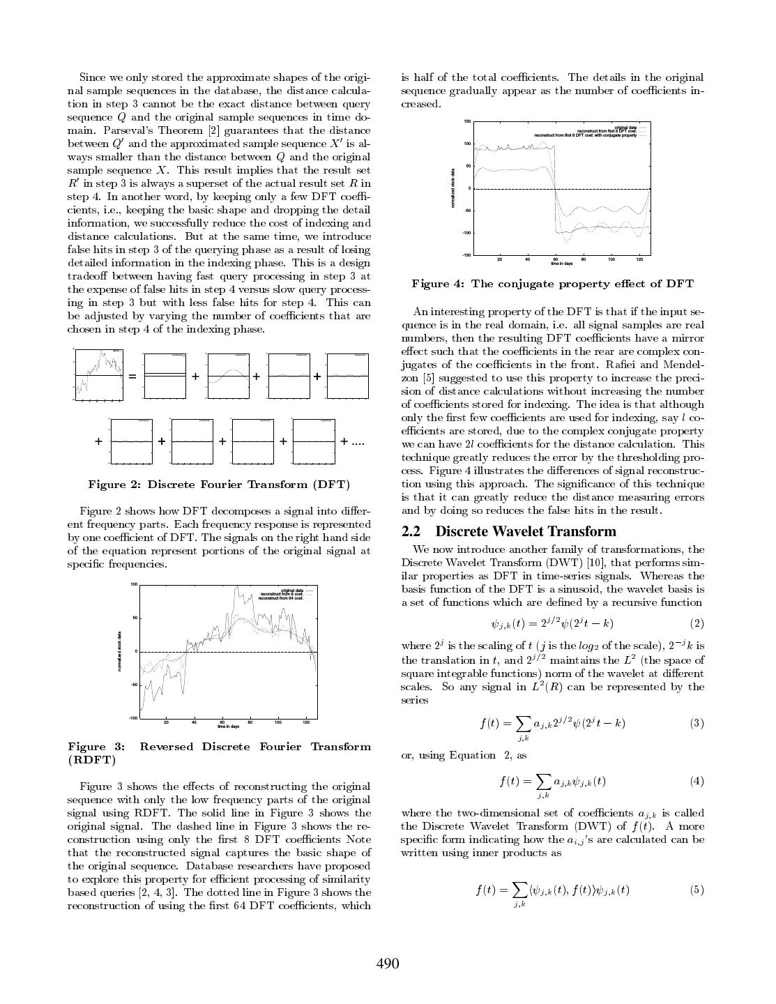 8 . subsequences of di erent lengths in sequence where m^ < m. Then the L2 error between the original databases. In Proceedings of the 16th International function and the thresholded one is given by Conference on Data Engineering, 28 February - 3 March, 2000, San Diego, California, pages 23{32. kf (x) ; f^(^x)k2 = hf (x) ; f^(^x)jf (x) ; f^(^x)i IEEE Computer Society, 2000. = X m X m c (i) c hu i ju j i 9] Chang-Shing Perng, Haixun Wang, Sylvia R. Zhang, j ( ) ( ) ( ) and D. Stott Parker. Landmarks: a new model for i=m^ +1 j =m^ +1 similarity-based pattern querying in time series = Xm (c (i) )2 (17) databases. In Proceedings of the 16th International Conference on Data Engineering, 28 February - 3 i=m^ +1 March, 2000, San Diego, California, pages 33{42. if the basis is orthonormal. In order to minimize this error IEEE Computer Society, 2000. for any give m^ , (i) satis es jc (1) j ::: jc (m) j. The 10] C. Sidney Burrus, Remesh A. Gopinath, and Haitao complete proof can be found in 11]. Guo. Introduction to Wavelets and Wavelet Transforms: A Primer. Prentice-Hall, Inc., 1998. 11] Eric J. Stollnitz, Tony D. Derose, and David H. Salesin. Wavelets for Computer Graphics: Theory and Applications. Morgan Kaufmann Publishers, Inc., 1996. Appendix A: Mathematics for Discrete Fourier Transform (DFT) The n-point DFT of a signal x = xt ] t = 0 ::: n ; 1 is de ned to be a sequence X of n complex numbers Xf f = 0 ::: n ; i, given by p nX Xf = 1= n ; 1 xt e;j 2 ft=n f = 0 1 ::: n ; 1 (10) t=0 p where j is the imaginary unit j = ;1. The signal x can be recovered by the inverse transform: p nX xt = 1= n ; 1 Xf ej 2 ft=n t = 0 1 ::: n ; 1 (11) f =0 Xf is a complex number. If the signal is real, then X0 is real. The energy of Signal x is de ned as the sum of energies at every point of the sequence: E (x) kxk2 X jxj n;1 2 (12) t=0 The Parseval's Theorem X jxij = nX; jXj j n;1 2 1 2 (13) i=0 j =0 we have kx ; yk = kX ; Y k 2 2 (14) Appendix B: Minimizing Thresholding Error Let the original function be f (x) = X m ci ui (x) (15) i=1 and let (i) be a permutation of 1 ::: m and the function after thresholding is X m^ f^(x) = c (i) u (i) (x) (16) i=1 495