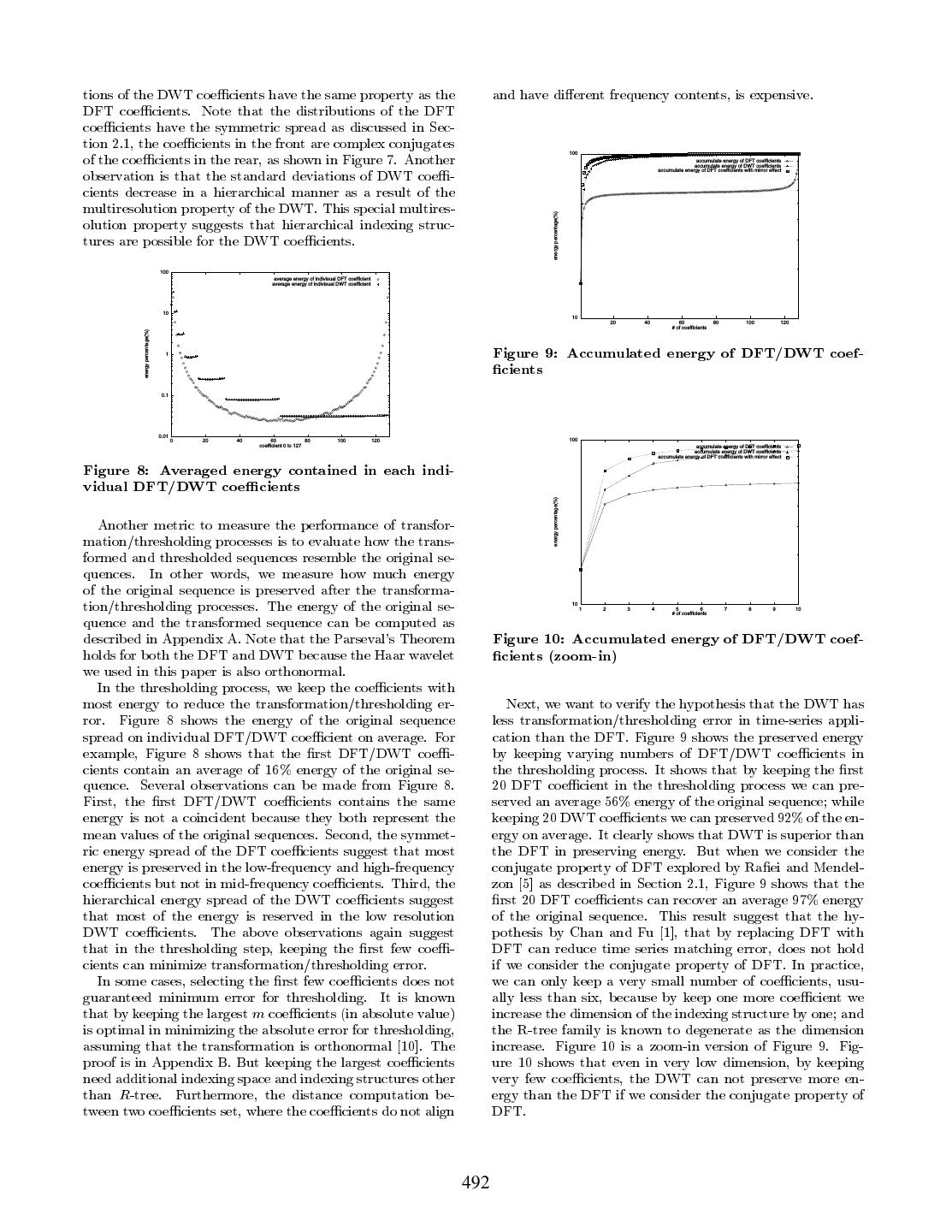 5 .tions of the DWT coe cients have the same property as the and have di erent frequency contents, is expensive. DFT coe cients. Note that the distributions of the DFT coe cients have the symmetric spread as discussed in Sec- tion 2.1, the coe cients in the front are complex conjugates of the coe cients in the rear, as shown in Figure 7. Another 100 accumulate energy of DFT coefficients observation is that the standard deviations of DWT coe - accumulate energy of DWT coefficients accumulate energy of DFT coefficients with mirror effect cients decrease in a hierarchical manner as a result of the multiresolution property of the DWT. This special multires- olution property suggests that hierarchical indexing struc- energy percentage(%) tures are possible for the DWT coe cients. 100 average energy of indivisual DFT coefficient average energy of indivisual DWT coefficient 10 10 20 40 60 80 100 120 # of coefficients energy percentage(%) Figure 9: Accumulated energy of DFT/DWT coef- cients 1 0.1 0.01 0 20 40 60 80 100 120 100 coefficient 0 to 127 accumulate energy of DFT coefficients accumulate energy of DWT coefficients Figure 8: Averaged energy contained in each indi- accumulate energy of DFT coefficients with mirror effect vidual DFT/DWT coe cients energy percentage(%) Another metric to measure the performance of transfor- mation/thresholding processes is to evaluate how the trans- formed and thresholded sequences resemble the original se- quences. In other words, we measure how much energy of the original sequence is preserved after the transforma- tion/thresholding processes. The energy of the original se- 10 1 2 3 4 5 6 7 8 9 10 quence and the transformed sequence can be computed as # of coefficients described in Appendix A. Note that the Parseval's Theorem Figure 10: Accumulated energy of DFT/DWT coef- holds for both the DFT and DWT because the Haar wavelet cients (zoom-in) we used in this paper is also orthonormal. In the thresholding process, we keep the coe cients with most energy to reduce the transformation/thresholding er- Next, we want to verify the hypothesis that the DWT has ror. Figure 8 shows the energy of the original sequence less transformation/thresholding error in time-series appli- spread on individual DFT/DWT coe cient on average. For cation than the DFT. Figure 9 shows the preserved energy example, Figure 8 shows that the rst DFT/DWT coe - by keeping varying numbers of DFT/DWT coe cients in cients contain an average of 16% energy of the original se- the thresholding process. It shows that by keeping the rst quence. Several observations can be made from Figure 8. 20 DFT coe cient in the thresholding process we can pre- First, the rst DFT/DWT coe cients contains the same served an average 56% energy of the original sequence while energy is not a coincident because they both represent the keeping 20 DWT coe cients we can preserved 92% of the en- mean values of the original sequences. Second, the symmet- ergy on average. It clearly shows that DWT is superior than ric energy spread of the DFT coe cients suggest that most the DFT in preserving energy. But when we consider the energy is preserved in the low-frequency and high-frequency conjugate property of DFT explored by Ra ei and Mendel- coe cients but not in mid-frequency coe cients. Third, the zon 5] as described in Section 2.1, Figure 9 shows that the hierarchical energy spread of the DWT coe cients suggest rst 20 DFT coe cients can recover an average 97% energy that most of the energy is reserved in the low resolution of the original sequence. This result suggest that the hy- DWT coe cients. The above observations again suggest pothesis by Chan and Fu 1], that by replacing DFT with that in the thresholding step, keeping the rst few coe - DFT can reduce time series matching error, does not hold cients can minimize transformation/thresholding error. if we consider the conjugate property of DFT. In practice, In some cases, selecting the rst few coe cients does not we can only keep a very small number of coe cients, usu- guaranteed minimum error for thresholding. It is known ally less than six, because by keep one more coe cient we that by keeping the largest m coe cients (in absolute value) increase the dimension of the indexing structure by one and is optimal in minimizing the absolute error for thresholding, the R-tree family is known to degenerate as the dimension assuming that the transformation is orthonormal 10]. The increase. Figure 10 is a zoom-in version of Figure 9. Fig- proof is in Appendix B. But keeping the largest coe cients ure 10 shows that even in very low dimension, by keeping need additional indexing space and indexing structures other very few coe cients, the DWT can not preserve more en- than R-tree. Furthermore, the distance computation be- ergy than the DFT if we consider the conjugate property of tween two coe cients set, where the coe cients do not align DFT. 492