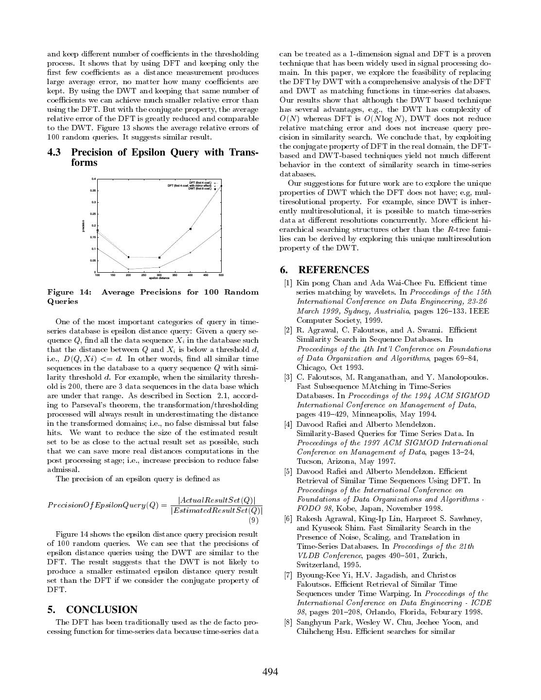 7 .and keep di erent number of coe cients in the thresholding can be treated as a 1-dimension signal and DFT is a proven process. It shows that by using DFT and keeping only the technique that has been widely used in signal processing do- rst few coe cients as a distance measurement produces main. In this paper, we explore the feasibility of replacing large average error, no matter how many coe cients are the DFT by DWT with a comprehensive analysis of the DFT kept. By using the DWT and keeping that same number of and DWT as matching functions in time-series databases. coe cients we can achieve much smaller relative error than Our results show that although the DWT based technique using the DFT. But with the conjugate property, the average has several advantages, e.g., the DWT has complexity of relative error of the DFT is greatly reduced and comparable O(N ) whereas DFT is O(N log N ), DWT does not reduce to the DWT. Figure 13 shows the average relative errors of relative matching error and does not increase query pre- 100 random queries. It suggests similar result. cision in similarity search. We conclude that, by exploiting the conjugate property of DFT in the real domain, the DFT- 4.3 Precision of Epsilon Query with Trans- based and DWT-based techniques yield not much di erent forms behavior in the context of similarity search in time-series databases. Our suggestions for future work are to explore the unique 0.4 DFT (first 4 coef.) properties of DWT which the DFT does not have e.g, mul- DFT (first 4 coef. with mirror effect) DWT (first 8 coef.) 0.35 0.3 tiresolutional property. For example, since DWT is inher- ently multiresolutional, it is possible to match time-series data at di erent resolutions concurrently. More e cient hi- 0.25 precision 0.2 erarchical searching structures other than the R-tree fami- 0.15 lies can be derived by exploring this unique multiresolution 0.1 property of the DWT. 0.05 0 100 150 200 250 300 350 400 450 500 6. REFERENCES 1] Kin pong Chan and Ada Wai-Chee Fu. E cient time epsilon distance Figure 14: Average Precisions for 100 Random series matching by wavelets. In Proceedings of the 15th Queries International Conference on Data Engineering, 23-26 March 1999, Sydney, Austrialia, pages 126{133. IEEE One of the most important categories of query in time- Computer Society, 1999. series database is epsilon distance query: Given a query se- 2] R. Agrawal, C. Faloutsos, and A. Swami. E cient quence Q, nd all the data sequence Xi in the database such Similarity Search in Sequence Databases. In that the distance between Q and Xi is below a threshold d, Proceedings of the 4th Int'l Conference on Foundations i.e., D(Q Xi) <= d. In other words, nd all similar time of Data Organization and Algorithms, pages 69{84, sequences in the database to a query sequence Q with simi- Chicago, Oct 1993. larity threshold d. For example, when the similarity thresh- 3] C. Faloutsos, M. Ranganathan, and Y. Manolopoulos. old is 200, there are 3 data sequences in the data base which Fast Subsequence MAtching in Time-Series are under that range. As described in Section 2.1, accord- Databases. In Proceedings of the 1994 ACM SIGMOD ing to Parseval's theorem, the transformation/thresholding International Conference on Management of Data, processed will always result in underestimating the distance pages 419{429, Minneapolis, May 1994. in the transformed domains i.e., no false dismissal but false 4] Davood Ra ei and Alberto Mendelzon. hits. We want to reduce the size of the estimated result Similarity-Based Queries for Time Series Data. In set to be as close to the actual result set as possible, such Proceedings of the 1997 ACM SIGMOD International that we can save more real distances computations in the Conference on Management of Data, pages 13{24, post processing stage i.e., increase precision to reduce false Tucson, Arizona, May 1997. admissal. 5] Davood Ra ei and Alberto Mendelzon. E cient The precision of an epsilon query is de ned as Retrieval of Similar Time Sequences Using DFT. In Proceedings of the International Conference on jActualResultSet(Q)j PrecisionOfEpsilonQuery(Q) = jEstimatedResultSet Foundations of Data Organizations and Algorithms - (Q)j FODO 98, Kobe, Japan, November 1998. (9) 6] Rakesh Agrawal, King-Ip Lin, Harpreet S. Sawhney, and Kyuseok Shim. Fast Similarity Search in the Figure 14 shows the epsilon distance query precision result Presence of Noise, Scaling, and Translation in of 100 random queries. We can see that the precisions of Time-Series Databases. In Proceedings of the 21th epsilon distance queries using the DWT are similar to the VLDB Conference, pages 490{501, Zurich, DFT. The result suggests that the DWT is not likely to Switzerland, 1995. produce a smaller estimated epsilon distance query result 7] Byoung-Kee Yi, H.V. Jagadish, and Christos set than the DFT if we consider the conjugate property of Faloutsos. E cient Retrieval of Similar Time DFT. Sequences under Time Warping. In Proceedings of the International Conference on Data Engineering - ICDE 5. CONCLUSION 98, pages 201{208, Orlando, Florida, Feburary 1998. The DFT has been traditionally used as the de facto pro- 8] Sanghyun Park, Wesley W. Chu, Jeehee Yoon, and cessing function for time-series data because time-series data Chihcheng Hsu. E cient searches for similar 494