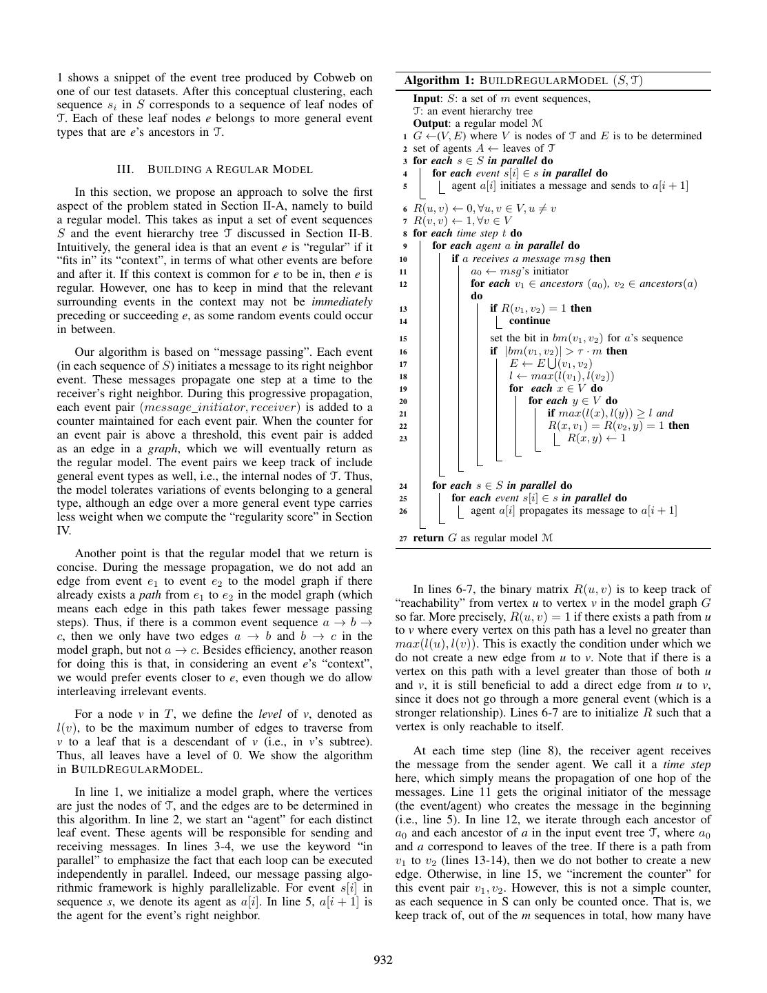 3 .1 shows a snippet of the event tree produced by Cobweb on Algorithm 1: B UILD R EGULAR M ODEL (S, T) one of our test datasets. After this conceptual clustering, each Input: S: a set of m event sequences, sequence si in S corresponds to a sequence of leaf nodes of T: an event hierarchy tree T. Each of these leaf nodes e belongs to more general event Output: a regular model M types that are e’s ancestors in T. 1 G ←(V, E) where V is nodes of T and E is to be determined 2 set of agents A ← leaves of T 3 for each s ∈ S in parallel do III. B UILDING A R EGULAR M ODEL 4 for each event s[i] ∈ s in parallel do 5 agent a[i] initiates a message and sends to a[i + 1] In this section, we propose an approach to solve the first aspect of the problem stated in Section II-A, namely to build 6 R(u, v) ← 0, ∀u, v ∈ V, u = v a regular model. This takes as input a set of event sequences 7 R(v, v) ← 1, ∀v ∈ V S and the event hierarchy tree T discussed in Section II-B. 8 for each time step t do Intuitively, the general idea is that an event e is “regular” if it 9 for each agent a in parallel do “fits in” its “context”, in terms of what other events are before 10 if a receives a message msg then and after it. If this context is common for e to be in, then e is 11 a0 ← msg’s initiator regular. However, one has to keep in mind that the relevant 12 for each v1 ∈ ancestors (a0 ), v2 ∈ ancestors(a) do surrounding events in the context may not be immediately 13 if R(v1 , v2 ) = 1 then preceding or succeeding e, as some random events could occur 14 continue in between. 15 set the bit in bm(v1 , v2 ) for a’s sequence Our algorithm is based on “message passing”. Each event 16 if |bm(v1 , v2 )| > τ · m then (in each sequence of S) initiates a message to its right neighbor 17 E ← E (v1 , v2 ) event. These messages propagate one step at a time to the 18 l ← max(l(v1 ), l(v2 )) receiver’s right neighbor. During this progressive propagation, 19 for each x ∈ V do 20 for each y ∈ V do each event pair (message initiator, receiver) is added to a 21 if max(l(x), l(y)) ≥ l and counter maintained for each event pair. When the counter for 22 R(x, v1 ) = R(v2 , y) = 1 then an event pair is above a threshold, this event pair is added 23 R(x, y) ← 1 as an edge in a graph, which we will eventually return as the regular model. The event pairs we keep track of include general event types as well, i.e., the internal nodes of T. Thus, the model tolerates variations of events belonging to a general 24 for each s ∈ S in parallel do type, although an edge over a more general event type carries 25 for each event s[i] ∈ s in parallel do 26 agent a[i] propagates its message to a[i + 1] less weight when we compute the “regularity score” in Section IV. 27 return G as regular model M Another point is that the regular model that we return is concise. During the message propagation, we do not add an edge from event e1 to event e2 to the model graph if there already exists a path from e1 to e2 in the model graph (which In lines 6-7, the binary matrix R(u, v) is to keep track of means each edge in this path takes fewer message passing “reachability” from vertex u to vertex v in the model graph G steps). Thus, if there is a common event sequence a → b → so far. More precisely, R(u, v) = 1 if there exists a path from u c, then we only have two edges a → b and b → c in the to v where every vertex on this path has a level no greater than model graph, but not a → c. Besides efficiency, another reason max(l(u), l(v)). This is exactly the condition under which we for doing this is that, in considering an event e’s “context”, do not create a new edge from u to v. Note that if there is a we would prefer events closer to e, even though we do allow vertex on this path with a level greater than those of both u interleaving irrelevant events. and v, it is still beneficial to add a direct edge from u to v, since it does not go through a more general event (which is a For a node v in T , we define the level of v, denoted as stronger relationship). Lines 6-7 are to initialize R such that a l(v), to be the maximum number of edges to traverse from vertex is only reachable to itself. v to a leaf that is a descendant of v (i.e., in v’s subtree). Thus, all leaves have a level of 0. We show the algorithm At each time step (line 8), the receiver agent receives in B UILD R EGULAR M ODEL. the message from the sender agent. We call it a time step here, which simply means the propagation of one hop of the In line 1, we initialize a model graph, where the vertices messages. Line 11 gets the original initiator of the message are just the nodes of T, and the edges are to be determined in (the event/agent) who creates the message in the beginning this algorithm. In line 2, we start an “agent” for each distinct (i.e., line 5). In line 12, we iterate through each ancestor of leaf event. These agents will be responsible for sending and a0 and each ancestor of a in the input event tree T, where a0 receiving messages. In lines 3-4, we use the keyword “in and a correspond to leaves of the tree. If there is a path from parallel” to emphasize the fact that each loop can be executed v1 to v2 (lines 13-14), then we do not bother to create a new independently in parallel. Indeed, our message passing algo- edge. Otherwise, in line 15, we “increment the counter” for rithmic framework is highly parallelizable. For event s[i] in this event pair v1 , v2 . However, this is not a simple counter, sequence s, we denote its agent as a[i]. In line 5, a[i + 1] is as each sequence in S can only be counted once. That is, we the agent for the event’s right neighbor. keep track of, out of the m sequences in total, how many have 932