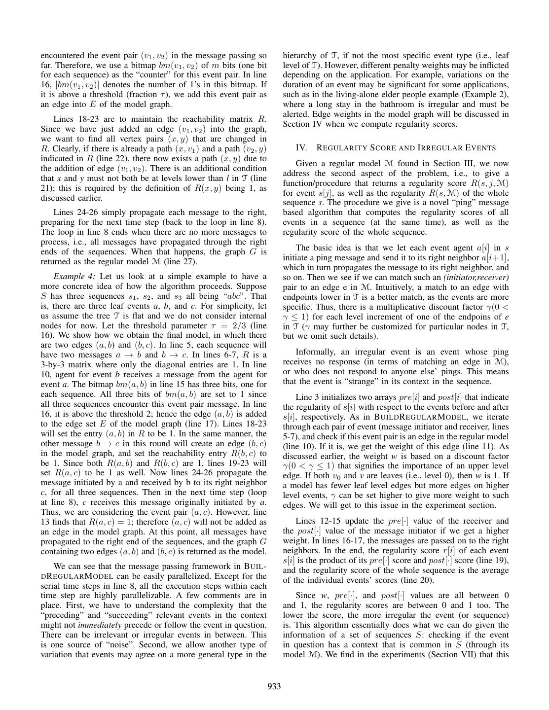 4 .encountered the event pair (v1 , v2 ) in the message passing so hierarchy of T, if not the most specific event type (i.e., leaf far. Therefore, we use a bitmap bm(v1 , v2 ) of m bits (one bit level of T). However, different penalty weights may be inflicted for each sequence) as the “counter” for this event pair. In line depending on the application. For example, variations on the 16, |bm(v1 , v2 )| denotes the number of 1’s in this bitmap. If duration of an event may be significant for some applications, it is above a threshold (fraction τ ), we add this event pair as such as in the living-alone elder people example (Example 2), an edge into E of the model graph. where a long stay in the bathroom is irregular and must be alerted. Edge weights in the model graph will be discussed in Lines 18-23 are to maintain the reachability matrix R. Section IV when we compute regularity scores. Since we have just added an edge (v1 , v2 ) into the graph, we want to find all vertex pairs (x, y) that are changed in R. Clearly, if there is already a path (x, v1 ) and a path (v2 , y) IV. R EGULARITY S CORE AND I RREGULAR E VENTS indicated in R (line 22), there now exists a path (x, y) due to Given a regular model M found in Section III, we now the addition of edge (v1 , v2 ). There is an additional condition address the second aspect of the problem, i.e., to give a that x and y must not both be at levels lower than l in T (line function/procedure that returns a regularity score R(s, j, M) 21); this is required by the definition of R(x, y) being 1, as for event s[j], as well as the regularity R(s, M) of the whole discussed earlier. sequence s. The procedure we give is a novel “ping” message Lines 24-26 simply propagate each message to the right, based algorithm that computes the regularity scores of all preparing for the next time step (back to the loop in line 8). events in a sequence (at the same time), as well as the The loop in line 8 ends when there are no more messages to regularity score of the whole sequence. process, i.e., all messages have propagated through the right ends of the sequences. When that happens, the graph G is The basic idea is that we let each event agent a[i] in s returned as the regular model M (line 27). initiate a ping message and send it to its right neighbor a[i+1], which in turn propagates the message to its right neighbor, and Example 4: Let us look at a simple example to have a so on. Then we see if we can match such an (initiator,receiver) more concrete idea of how the algorithm proceeds. Suppose pair to an edge e in M. Intuitively, a match to an edge with S has three sequences s1 , s2 , and s3 all being “abc”. That endpoints lower in T is a better match, as the events are more is, there are three leaf events a, b, and c. For simplicity, let specific. Thus, there is a multiplicative discount factor γ(0 < us assume the tree T is flat and we do not consider internal γ ≤ 1) for each level increment of one of the endpoins of e nodes for now. Let the threshold parameter τ = 2/3 (line in T (γ may further be customized for particular nodes in T, 16). We show how we obtain the final model, in which there but we omit such details). are two edges (a, b) and (b, c). In line 5, each sequence will have two messages a → b and b → c. In lines 6-7, R is a Informally, an irregular event is an event whose ping 3-by-3 matrix where only the diagonal entries are 1. In line receives no response (in terms of matching an edge in M), 10, agent for event b receives a message from the agent for or who does not respond to anyone else’ pings. This means event a. The bitmap bm(a, b) in line 15 has three bits, one for that the event is “strange” in its context in the sequence. each sequence. All three bits of bm(a, b) are set to 1 since Line 3 initializes two arrays pre[i] and post[i] that indicate all three sequences encounter this event pair message. In line the regularity of s[i] with respect to the events before and after 16, it is above the threshold 2; hence the edge (a, b) is added s[i], respectively. As in B UILD R EGULAR M ODEL, we iterate to the edge set E of the model graph (line 17). Lines 18-23 through each pair of event (message initiator and receiver, lines will set the entry (a, b) in R to be 1. In the same manner, the 5-7), and check if this event pair is an edge in the regular model other message b → c in this round will create an edge (b, c) (line 10). If it is, we get the weight of this edge (line 11). As in the model graph, and set the reachability entry R(b, c) to discussed earlier, the weight w is based on a discount factor be 1. Since both R(a, b) and R(b, c) are 1, lines 19-23 will γ(0 < γ ≤ 1) that signifies the importance of an upper level set R(a, c) to be 1 as well. Now lines 24-26 propagate the edge. If both v0 and v are leaves (i.e., level 0), then w is 1. If message initiated by a and received by b to its right neighbor a model has fewer leaf level edges but more edges on higher c, for all three sequences. Then in the next time step (loop level events, γ can be set higher to give more weight to such at line 8), c receives this message originally initiated by a. edges. We will get to this issue in the experiment section. Thus, we are considering the event pair (a, c). However, line 13 finds that R(a, c) = 1; therefore (a, c) will not be added as Lines 12-15 update the pre[·] value of the receiver and an edge in the model graph. At this point, all messages have the post[·] value of the message initiator if we get a higher propagated to the right end of the sequences, and the graph G weight. In lines 16-17, the messages are passed on to the right containing two edges (a, b) and (b, c) is returned as the model. neighbors. In the end, the regularity score r[i] of each event s[i] is the product of its pre[·] score and post[·] score (line 19), We can see that the message passing framework in B UIL - and the regularity score of the who