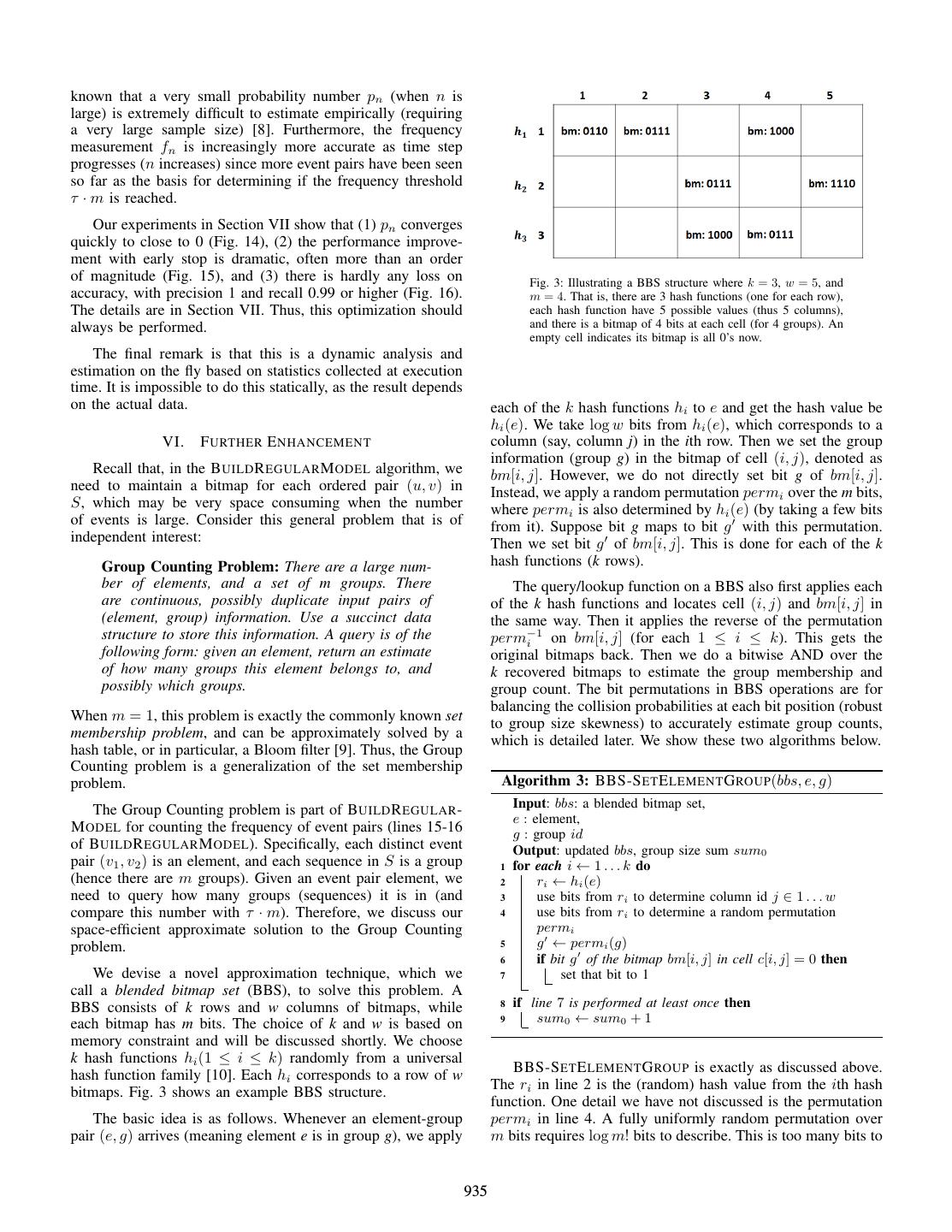6 .known that a very small probability number pn (when n is large) is extremely difficult to estimate empirically (requiring a very large sample size) [8]. Furthermore, the frequency measurement fn is increasingly more accurate as time step progresses (n increases) since more event pairs have been seen so far as the basis for determining if the frequency threshold τ · m is reached. Our experiments in Section VII show that (1) pn converges quickly to close to 0 (Fig. 14), (2) the performance improve- ment with early stop is dramatic, often more than an order of magnitude (Fig. 15), and (3) there is hardly any loss on Fig. 3: Illustrating a BBS structure where k = 3, w = 5, and accuracy, with precision 1 and recall 0.99 or higher (Fig. 16). m = 4. That is, there are 3 hash functions (one for each row), The details are in Section VII. Thus, this optimization should each hash function have 5 possible values (thus 5 columns), always be performed. and there is a bitmap of 4 bits at each cell (for 4 groups). An empty cell indicates its bitmap is all 0’s now. The final remark is that this is a dynamic analysis and estimation on the fly based on statistics collected at execution time. It is impossible to do this statically, as the result depends on the actual data. each of the k hash functions hi to e and get the hash value be hi (e). We take log w bits from hi (e), which corresponds to a VI. F URTHER E NHANCEMENT column (say, column j) in the ith row. Then we set the group information (group g) in the bitmap of cell (i, j), denoted as Recall that, in the B UILD R EGULAR M ODEL algorithm, we bm[i, j]. However, we do not directly set bit g of bm[i, j]. need to maintain a bitmap for each ordered pair (u, v) in Instead, we apply a random permutation permi over the m bits, S, which may be very space consuming when the number where permi is also determined by hi (e) (by taking a few bits of events is large. Consider this general problem that is of from it). Suppose bit g maps to bit g with this permutation. independent interest: Then we set bit g of bm[i, j]. This is done for each of the k Group Counting Problem: There are a large num- hash functions (k rows). ber of elements, and a set of m groups. There The query/lookup function on a BBS also first applies each are continuous, possibly duplicate input pairs of of the k hash functions and locates cell (i, j) and bm[i, j] in (element, group) information. Use a succinct data the same way. Then it applies the reverse of the permutation structure to store this information. A query is of the perm−1i on bm[i, j] (for each 1 ≤ i ≤ k). This gets the following form: given an element, return an estimate original bitmaps back. Then we do a bitwise AND over the of how many groups this element belongs to, and k recovered bitmaps to estimate the group membership and possibly which groups. group count. The bit permutations in BBS operations are for balancing the collision probabilities at each bit position (robust When m = 1, this problem is exactly the commonly known set to group size skewness) to accurately estimate group counts, membership problem, and can be approximately solved by a which is detailed later. We show these two algorithms below. hash table, or in particular, a Bloom filter [9]. Thus, the Group Counting problem is a generalization of the set membership problem. Algorithm 3: BBS-S ET E LEMENT G ROUP(bbs, e, g) The Group Counting problem is part of B UILD R EGULAR - Input: bbs: a blended bitmap set, e : element, M ODEL for counting the frequency of event pairs (lines 15-16 g : group id of B UILD R EGULAR M ODEL). Specifically, each distinct event Output: updated bbs, group size sum sum0 pair (v1 , v2 ) is an element, and each sequence in S is a group 1 for each i ← 1 . . . k do (hence there are m groups). Given an event pair element, we 2 ri ← hi (e) need to query how many groups (sequences) it is in (and 3 use bits from ri to determine column id j ∈ 1 . . . w compare this number with τ · m). Therefore, we discuss our 4 use bits from ri to determine a random permutation space-efficient approximate solution to the Group Counting permi problem. 5 g ← permi (g) 6 if bit g of the bitmap bm[i, j] in cell c[i, j] = 0 then We devise a novel approximation technique, which we 7 set that bit to 1 call a blended bitmap set (BBS), to solve this problem. A BBS consists of k rows and w columns of bitmaps, while 8 if line 7 is performed at least once then each bitmap has m bits. The choice of k and w is based on 9 sum0 ← sum0 + 1 memory constraint and will be discussed shortly. We choose k hash functions hi (1 ≤ i ≤ k) randomly from a universal hash function family [10]. Each hi corresponds to a row of w BBS-S ET E LEMENT G ROUP is exactly as discussed above. bitmaps. Fig. 3 shows an example BBS structure. The ri in line 2 is the (random) hash value from the ith hash function. One detail we have not discussed is the permutation The basic idea is as follows. Whenever an element-group permi in line 4. A fully uniformly random permutation over pair (e, g) arrives (meaning element e is in group g), we apply m bits requires log m! bits to describe. This is too many bits to 935