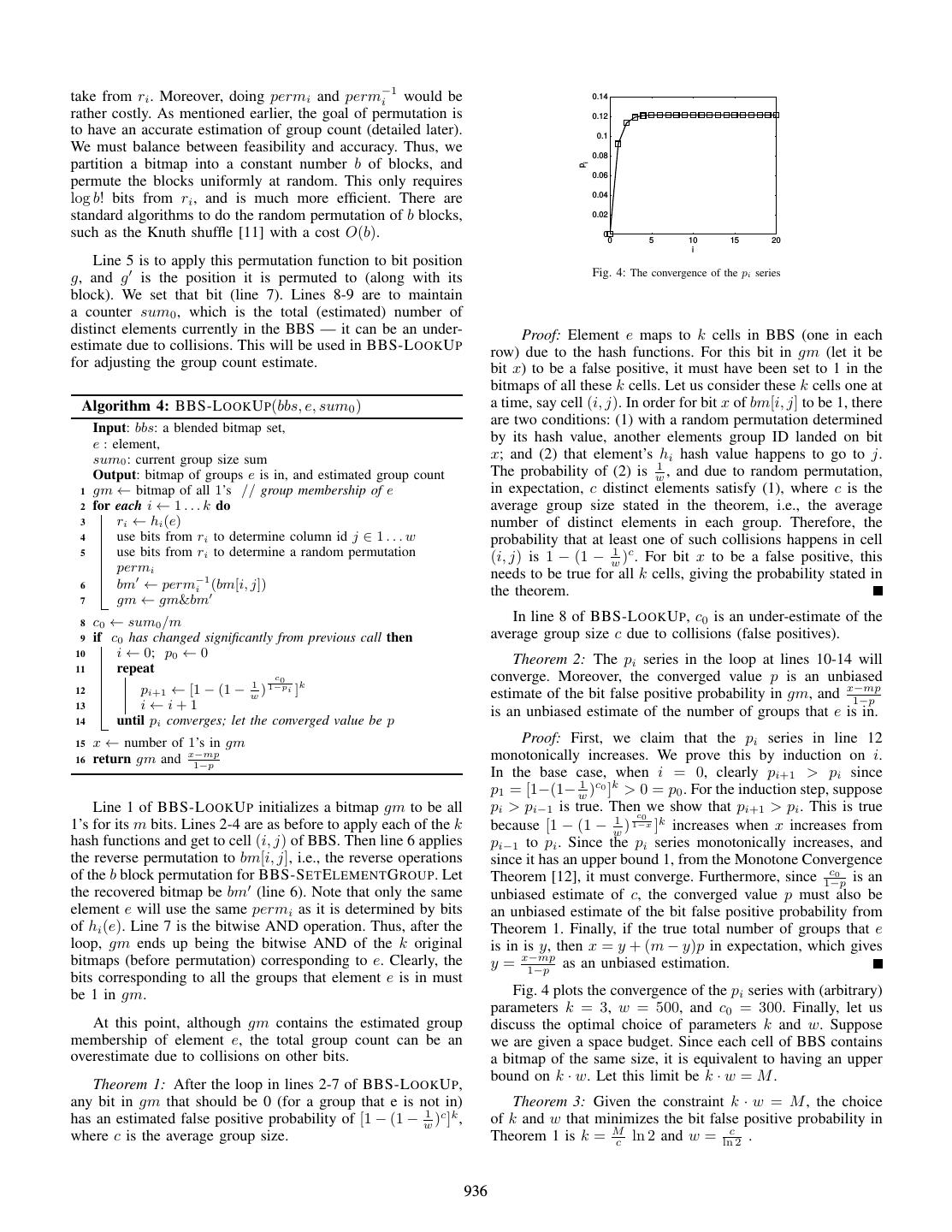7 .take from ri . Moreover, doing permi and perm−1 i would be 0.14 rather costly. As mentioned earlier, the goal of permutation is 0.12 to have an accurate estimation of group count (detailed later). 0.1 We must balance between feasibility and accuracy. Thus, we 0.08 partition a bitmap into a constant number b of blocks, and pi 0.06 permute the blocks uniformly at random. This only requires 0.04 log b! bits from ri , and is much more efficient. There are standard algorithms to do the random permutation of b blocks, 0.02 such as the Knuth shuffle [11] with a cost O(b). 0 0 5 10 15 20 i Line 5 is to apply this permutation function to bit position g, and g is the position it is permuted to (along with its Fig. 4: The convergence of the pi series block). We set that bit (line 7). Lines 8-9 are to maintain a counter sum0 , which is the total (estimated) number of distinct elements currently in the BBS — it can be an under- Proof: Element e maps to k cells in BBS (one in each estimate due to collisions. This will be used in BBS-L OOK U P row) due to the hash functions. For this bit in gm (let it be for adjusting the group count estimate. bit x) to be a false positive, it must have been set to 1 in the bitmaps of all these k cells. Let us consider these k cells one at Algorithm 4: BBS-L OOK U P(bbs, e, sum0 ) a time, say cell (i, j). In order for bit x of bm[i, j] to be 1, there are two conditions: (1) with a random permutation determined Input: bbs: a blended bitmap set, e : element, by its hash value, another elements group ID landed on bit sum0 : current group size sum x; and (2) that element’s hi hash value happens to go to j. Output: bitmap of groups e is in, and estimated group count The probability of (2) is w1 , and due to random permutation, 1 gm ← bitmap of all 1’s // group membership of e in expectation, c distinct elements satisfy (1), where c is the 2 for each i ← 1 . . . k do average group size stated in the theorem, i.e., the average 3 ri ← hi (e) number of distinct elements in each group. Therefore, the 4 use bits from ri to determine column id j ∈ 1 . . . w probability that at least one of such collisions happens in cell 5 use bits from ri to determine a random permutation (i, j) is 1 − (1 − w1 )c . For bit x to be a false positive, this permi needs to be true for all k cells, giving the probability stated in 6 bm ← perm−1 i (bm[i, j]) the theorem. 7 gm ← gm&bm 8 c0 ← sum0 /m In line 8 of BBS-L OOK U P, c0 is an under-estimate of the 9 if c0 has changed significantly from previous call then average group size c due to collisions (false positives). 10 i ← 0; p0 ← 0 Theorem 2: The pi series in the loop at lines 10-14 will 11 repeat c0 converge. Moreover, the converged value p is an unbiased 12 pi+1 ← [1 − (1 − w1 ) 1−pi ]k estimate of the bit false positive probability in gm, and x−mp 1−p 13 i←i+1 is an unbiased estimate of the number of groups that e is in. 14 until pi converges; let the converged value be p 15 x ← number of 1’s in gm Proof: First, we claim that the pi series in line 12 16 return gm and x−mp monotonically increases. We prove this by induction on i. 1−p In the base case, when i = 0, clearly pi+1 > pi since p1 = [1−(1− w1 )c0 ]k > 0 = p0 . For the induction step, suppose Line 1 of BBS-L OOK U P initializes a bitmap gm to be all pi > pi−1 is true. Thenc we show that pi+1 > pi . This is true 0 1’s for its m bits. Lines 2-4 are as before to apply each of the k because [1 − (1 − w1 ) 1−x ]k increases when x increases from hash functions and get to cell (i, j) of BBS. Then line 6 applies pi−1 to pi . Since the pi series monotonically increases, and the reverse permutation to bm[i, j], i.e., the reverse operations since it has an upper bound 1, from the Monotone Convergence of the b block permutation for BBS-S ET E LEMENT G ROUP. Let c0 Theorem [12], it must converge. Furthermore, since 1−p is an the recovered bitmap be bm (line 6). Note that only the same unbiased estimate of c, the converged value p must also be element e will use the same permi as it is determined by bits an unbiased estimate of the bit false positive probability from of hi (e). Line 7 is the bitwise AND operation. Thus, after the Theorem 1. Finally, if the true total number of groups that e loop, gm ends up being the bitwise AND of the k original is in is y, then x = y + (m − y)p in expectation, which gives bitmaps (before permutation) corresponding to e. Clearly, the y = x−mp 1−p as an unbiased estimation. bits corresponding to all the groups that element e is in must be 1 in gm. Fig. 4 plots the convergence of the pi series with (arbitrary) parameters k = 3, w = 500, and c0 = 300. Finally, let us At this point, although gm contains the estimated group discuss the optimal choice of parameters k and w. Suppose membership of element e, the total group count can be an we are given a space budget. Since each cell of BBS contains overestimate due to collisions on other bits. a bitmap of the same size, it is equivalent to having an upper bound on k · w. Let this limit be k · w = M . Theorem 1: After the loop in lines 2-7 of BBS-L OOK U P, any bit in gm that should be 0 (for a group that e is not in) Theorem 3: Given the constraint k · w = M , the choice has an estimated false positive probability of [1 − (1 − w1 )c ]k , of k and w that minimizes the bit false positive probability in where c is the average group size. Theorem 1 is k = M c c ln 2 and w = ln 2 . 936
