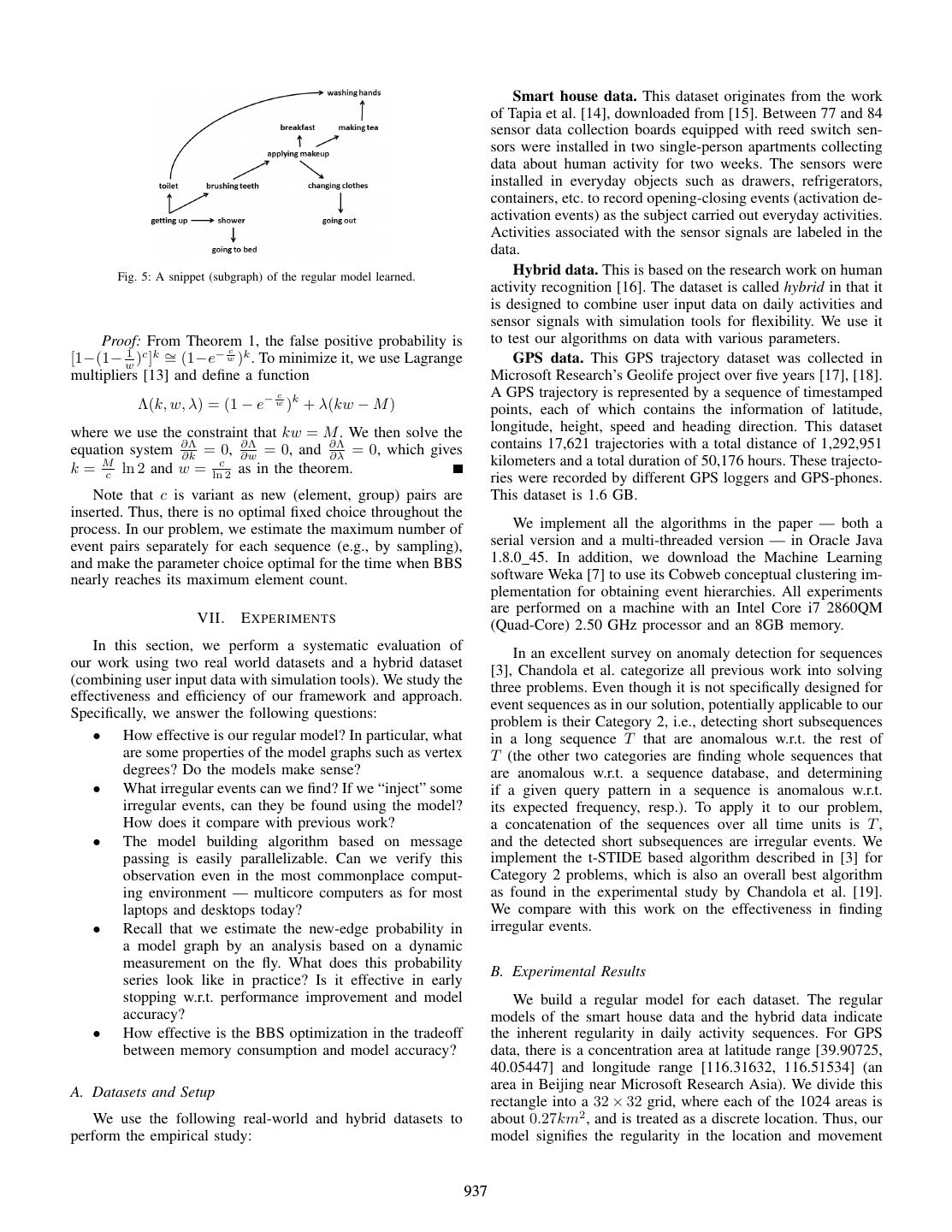 8 . Smart house data. This dataset originates from the work of Tapia et al. [14], downloaded from [15]. Between 77 and 84 sensor data collection boards equipped with reed switch sen- sors were installed in two single-person apartments collecting data about human activity for two weeks. The sensors were installed in everyday objects such as drawers, refrigerators, containers, etc. to record opening-closing events (activation de- activation events) as the subject carried out everyday activities. Activities associated with the sensor signals are labeled in the data. Fig. 5: A snippet (subgraph) of the regular model learned. Hybrid data. This is based on the research work on human activity recognition [16]. The dataset is called hybrid in that it is designed to combine user input data on daily activities and sensor signals with simulation tools for flexibility. We use it Proof: From Theorem 1, the false positive probability is to test our algorithms on data with various parameters. [1−(1− w1 )c ]k ∼ c = (1−e− w )k . To minimize it, we use Lagrange GPS data. This GPS trajectory dataset was collected in multipliers [13] and define a function Microsoft Research’s Geolife project over five years [17], [18]. c A GPS trajectory is represented by a sequence of timestamped Λ(k, w, λ) = (1 − e− w )k + λ(kw − M ) points, each of which contains the information of latitude, where we use the constraint that kw = M . We then solve the longitude, height, speed and heading direction. This dataset equation system ∂Λ ∂Λ ∂Λ contains 17,621 trajectories with a total distance of 1,292,951 ∂k = 0, ∂w = 0, and ∂λ = 0, which gives M c k = c ln 2 and w = ln 2 as in the theorem. kilometers and a total duration of 50,176 hours. These trajecto- ries were recorded by different GPS loggers and GPS-phones. Note that c is variant as new (element, group) pairs are This dataset is 1.6 GB. inserted. Thus, there is no optimal fixed choice throughout the process. In our problem, we estimate the maximum number of We implement all the algorithms in the paper — both a event pairs separately for each sequence (e.g., by sampling), serial version and a multi-threaded version — in Oracle Java and make the parameter choice optimal for the time when BBS 1.8.0 45. In addition, we download the Machine Learning nearly reaches its maximum element count. software Weka [7] to use its Cobweb conceptual clustering im- plementation for obtaining event hierarchies. All experiments are performed on a machine with an Intel Core i7 2860QM VII. E XPERIMENTS (Quad-Core) 2.50 GHz processor and an 8GB memory. In this section, we perform a systematic evaluation of In an excellent survey on anomaly detection for sequences our work using two real world datasets and a hybrid dataset [3], Chandola et al. categorize all previous work into solving (combining user input data with simulation tools). We study the three problems. Even though it is not specifically designed for effectiveness and efficiency of our framework and approach. event sequences as in our solution, potentially applicable to our Specifically, we answer the following questions: problem is their Category 2, i.e., detecting short subsequences • How effective is our regular model? In particular, what in a long sequence T that are anomalous w.r.t. the rest of are some properties of the model graphs such as vertex T (the other two categories are finding whole sequences that degrees? Do the models make sense? are anomalous w.r.t. a sequence database, and determining • What irregular events can we find? If we “inject” some if a given query pattern in a sequence is anomalous w.r.t. irregular events, can they be found using the model? its expected frequency, resp.). To apply it to our problem, How does it compare with previous work? a concatenation of the sequences over all time units is T , • The model building algorithm based on message and the detected short subsequences are irregular events. We passing is easily parallelizable. Can we verify this implement the t-STIDE based algorithm described in [3] for observation even in the most commonplace comput- Category 2 problems, which is also an overall best algorithm ing environment — multicore computers as for most as found in the experimental study by Chandola et al. [19]. laptops and desktops today? We compare with this work on the effectiveness in finding • Recall that we estimate the new-edge probability in irregular events. a model graph by an analysis based on a dynamic measurement on the fly. What does this probability B. Experimental Results series look like in practice? Is it effective in early stopping w.r.t. performance improvement and model We build a regular model for each dataset. The regular accuracy? models of the smart house data and the hybrid data indicate • How effective is the BBS optimization in the tradeoff the inherent regularity in daily activity sequences. For GPS between memory consumption and model accuracy? data, there is a concentration area at latitude range [39.90725, 40.05447] and longitude range [116.31632, 116.51534] (an A. Datasets and Setup area in Beijing near Microsoft Research Asia). We divide this rectangle into a 32 × 32 grid, where each of the 1024 areas is We use the following real-world and hybrid datasets to about 0.27km2 , and is treated as a discrete location. Thus, our perform the empirical study: model signifies the regularity in the location and movement 937