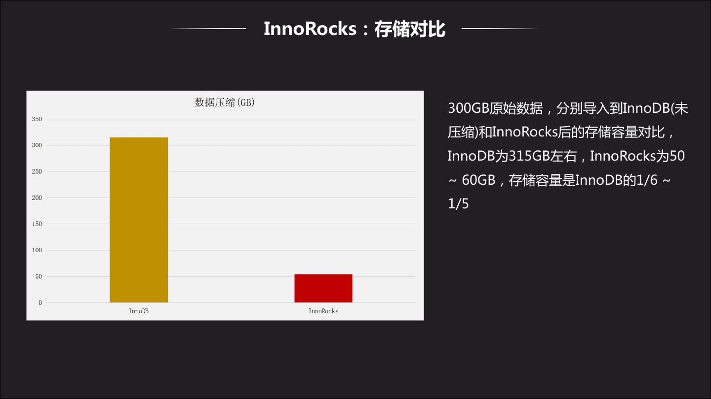 11 .InnoRocks:存储对比 300GB原始数据,分别导入到InnoDB(未 压缩)和InnoRocks后的存储容量对比, InnoDB为315GB左右,InnoRocks为50 ~ 60GB,存储容量是InnoDB的1/6 ~ 1/5