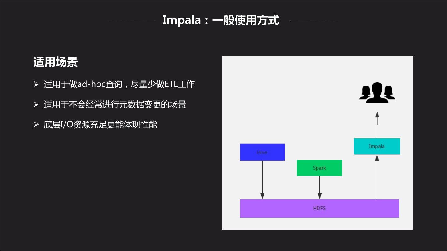 24 . Impala:一般使用方式 适用场景 Ø 适用于做ad-hoc查询,尽量少做ETL工作 Ø 适用于不会经常进行元数据变更的场景 Ø 底层I/O资源充足更能体现性能