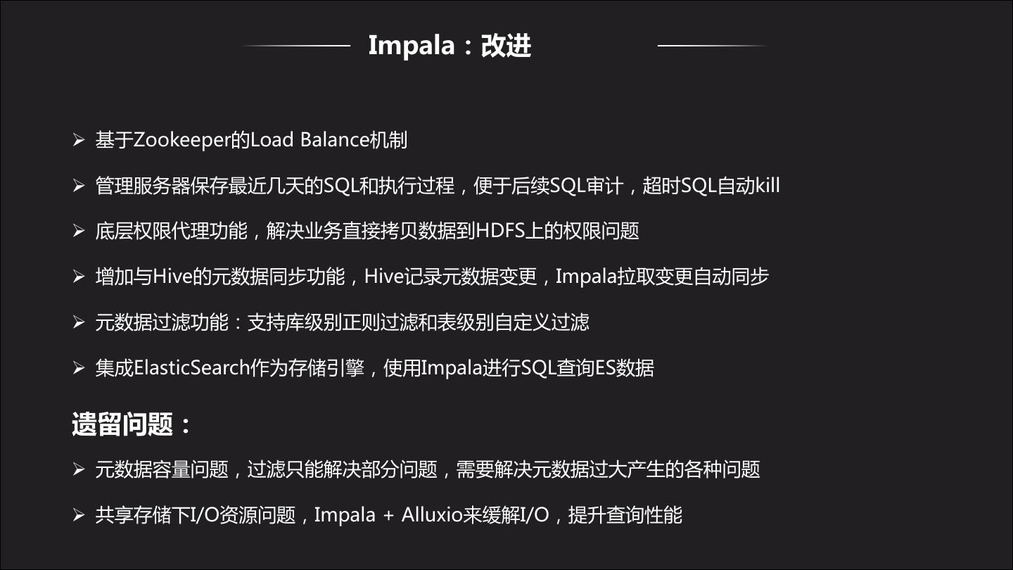 26 . Impala:改进 Ø 基于Zookeeper的Load Balance机制 Ø 管理服务器保存最近几天的SQL和执行过程,便于后续SQL审计,超时SQL自动kill Ø 底层权限代理功能,解决业务直接拷贝数据到HDFS上的权限问题 Ø 增加与Hive的元数据同步功能,Hive记录元数据变更,Impala拉取变更自动同步 Ø 元数据过滤功能:支持库级别正则过滤和表级别自定义过滤 Ø 集成ElasticSearch作为存储引擎,使用Impala进行SQL查询ES数据 遗留问题: Ø 元数据容量问题,过滤只能解决部分问题,需要解决元数据过大产生的各种问题 Ø 共享存储下I/O资源问题,Impala + Alluxio来缓解I/O,提升查询性能