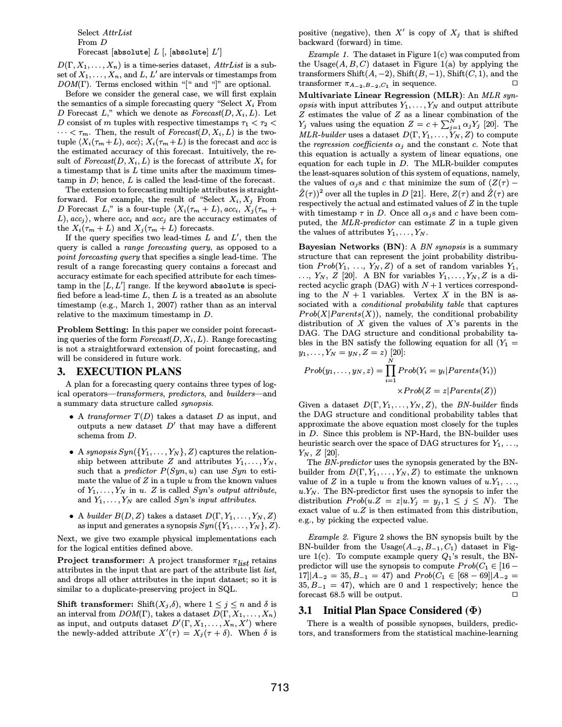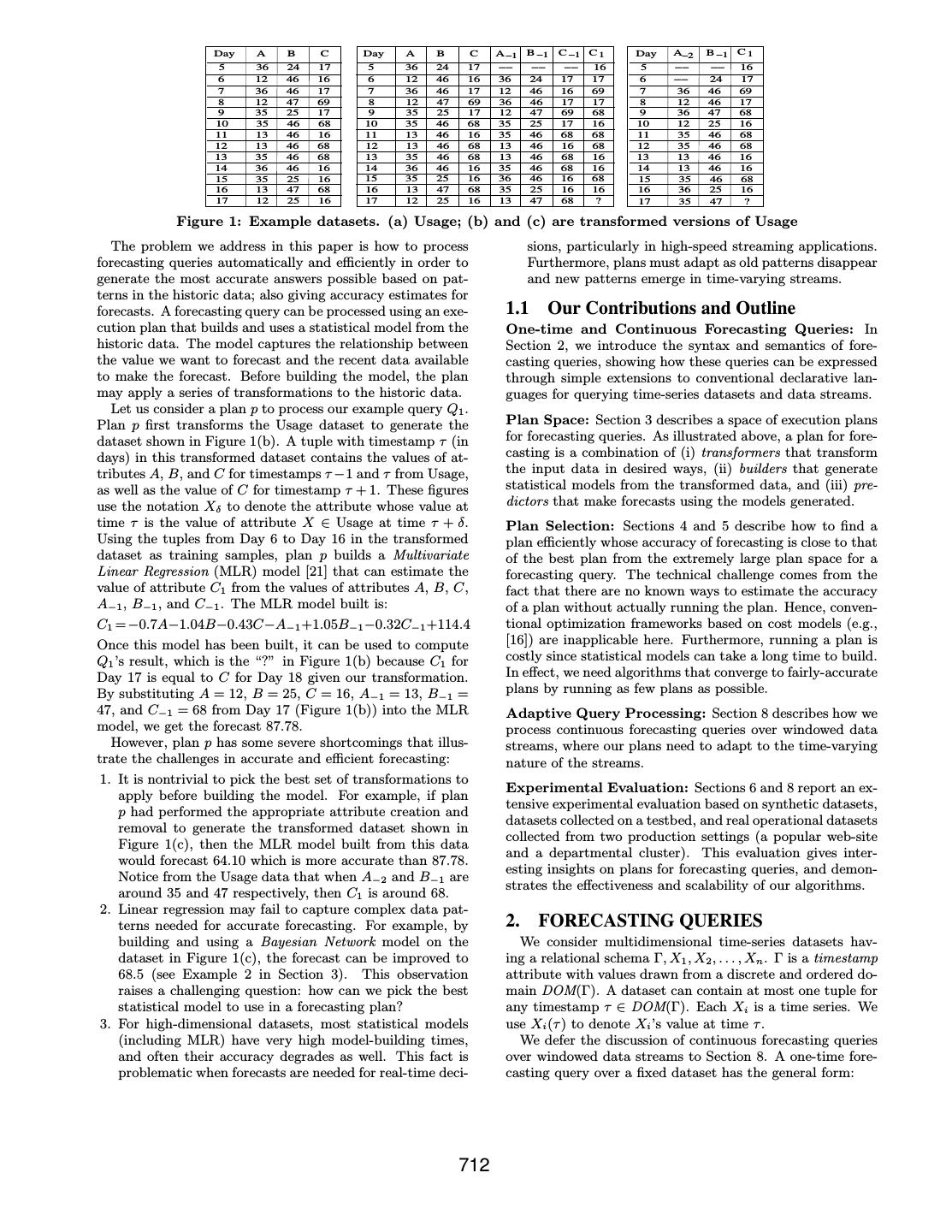 2 . Day A B C Day A B C A −1 B −1 C −1 C 1 Day A−2 B −1 C1 5 36 24 17 5 36 24 17 −− −− −− 16 5 −− −− 16 6 12 46 16 6 12 46 16 36 24 17 17 6 −− 24 17 7 36 46 17 7 36 46 17 12 46 16 69 7 36 46 69 8 12 47 69 8 12 47 69 36 46 17 17 8 12 46 17 9 35 25 17 9 35 25 17 12 47 69 68 9 36 47 68 10 35 46 68 10 35 46 68 35 25 17 16 10 12 25 16 11 13 46 16 11 13 46 16 35 46 68 68 11 35 46 68 12 13 46 68 12 13 46 68 13 46 16 68 12 35 46 68 13 35 46 68 13 35 46 68 13 46 68 16 13 13 46 16 14 36 46 16 14 36 46 16 35 46 68 16 14 13 46 16 15 35 25 16 15 35 25 16 36 46 16 68 15 35 46 68 16 13 47 68 16 13 47 68 35 25 16 16 16 36 25 16 17 12 25 16 17 12 25 16 13 47 68 ? 17 35 47 ? Figure 1: Example datasets. (a) Usage; (b) and (c) are transformed versions of Usage The problem we address in this paper is how to process sions, particularly in high-speed streaming applications. forecasting queries automatically and efficiently in order to Furthermore, plans must adapt as old patterns disappear generate the most accurate answers possible based on pat- and new patterns emerge in time-varying streams. terns in the historic data; also giving accuracy estimates for forecasts. A forecasting query can be processed using an exe- 1.1 Our Contributions and Outline cution plan that builds and uses a statistical model from the One-time and Continuous Forecasting Queries: In historic data. The model captures the relationship between Section 2, we introduce the syntax and semantics of fore- the value we want to forecast and the recent data available casting queries, showing how these queries can be expressed to make the forecast. Before building the model, the plan through simple extensions to conventional declarative lan- may apply a series of transformations to the historic data. guages for querying time-series datasets and data streams. Let us consider a plan p to process our example query Q1 . Plan p first transforms the Usage dataset to generate the Plan Space: Section 3 describes a space of execution plans dataset shown in Figure 1(b). A tuple with timestamp τ (in for forecasting queries. As illustrated above, a plan for fore- days) in this transformed dataset contains the values of at- casting is a combination of (i) transformers that transform tributes A, B, and C for timestamps τ −1 and τ from Usage, the input data in desired ways, (ii) builders that generate as well as the value of C for timestamp τ + 1. These figures statistical models from the transformed data, and (iii) pre- use the notation Xδ to denote the attribute whose value at dictors that make forecasts using the models generated. time τ is the value of attribute X ∈ Usage at time τ + δ. Plan Selection: Sections 4 and 5 describe how to find a Using the tuples from Day 6 to Day 16 in the transformed plan efficiently whose accuracy of forecasting is close to that dataset as training samples, plan p builds a Multivariate of the best plan from the extremely large plan space for a Linear Regression (MLR) model [21] that can estimate the forecasting query. The technical challenge comes from the value of attribute C1 from the values of attributes A, B, C, fact that there are no known ways to estimate the accuracy A−1 , B−1 , and C−1 . The MLR model built is: of a plan without actually running the plan. Hence, conven- C1 = −0.7A−1.04B−0.43C−A−1 +1.05B−1 −0.32C−1 +114.4 tional optimization frameworks based on cost models (e.g., Once this model has been built, it can be used to compute [16]) are inapplicable here. Furthermore, running a plan is Q1 ’s result, which is the “?” in Figure 1(b) because C1 for costly since statistical models can take a long time to build. Day 17 is equal to C for Day 18 given our transformation. In effect, we need algorithms that converge to fairly-accurate By substituting A = 12, B = 25, C = 16, A−1 = 13, B−1 = plans by running as few plans as possible. 47, and C−1 = 68 from Day 17 (Figure 1(b)) into the MLR Adaptive Query Processing: Section 8 describes how we model, we get the forecast 87.78. process continuous forecasting queries over windowed data However, plan p has some severe shortcomings that illus- streams, where our plans need to adapt to the time-varying trate the challenges in accurate and efficient forecasting: nature of the streams. 1. It is nontrivial to pick the best set of transformations to Experimental Evaluation: Sections 6 and 8 report an ex- apply before building the model. For example, if plan tensive experimental evaluation based on synthetic datasets, p had performed the appropriate attribute creation and datasets collected on a testbed, and real operational datasets removal to generate the transformed dataset shown in collected from two production settings (a popular web-site Figure 1(c), then the MLR model built from this data and a departmental cluster). This evaluation gives inter- would forecast 64.10 which is more accurate than 87.78. esting insights on plans for forecasting queries, and demon- Notice from the Usage data that when A−2 and B−1 are strates the effectiveness and scalability of our algorithms. around 35 and 47 respectively, then C1 is around 68. 2. Linear regression may fail to capture complex data pat- terns needed for accurate forecasting. For example, by 2. FORECASTING QUERIES building and using a Bayesian Network model on the We consider multidimensional time-series datasets hav- dataset in Figure 1(c), the forecast can be improved to ing a relational schema Γ, X1 , X2 , . . . , Xn . Γ is a timestamp 68.5 (see Example 2 in Section 3). This observation attribute with values drawn from a discrete and ordered do- raises a challenging question: how can we pick the best main DOM(Γ). A dataset can contain at most one tuple for statistical model to use in a forecasting plan? any timestamp τ ∈ DOM(Γ). Each Xi is a time series. We 3. For high-dimensional datasets, most statistical models use Xi (τ ) to denote X