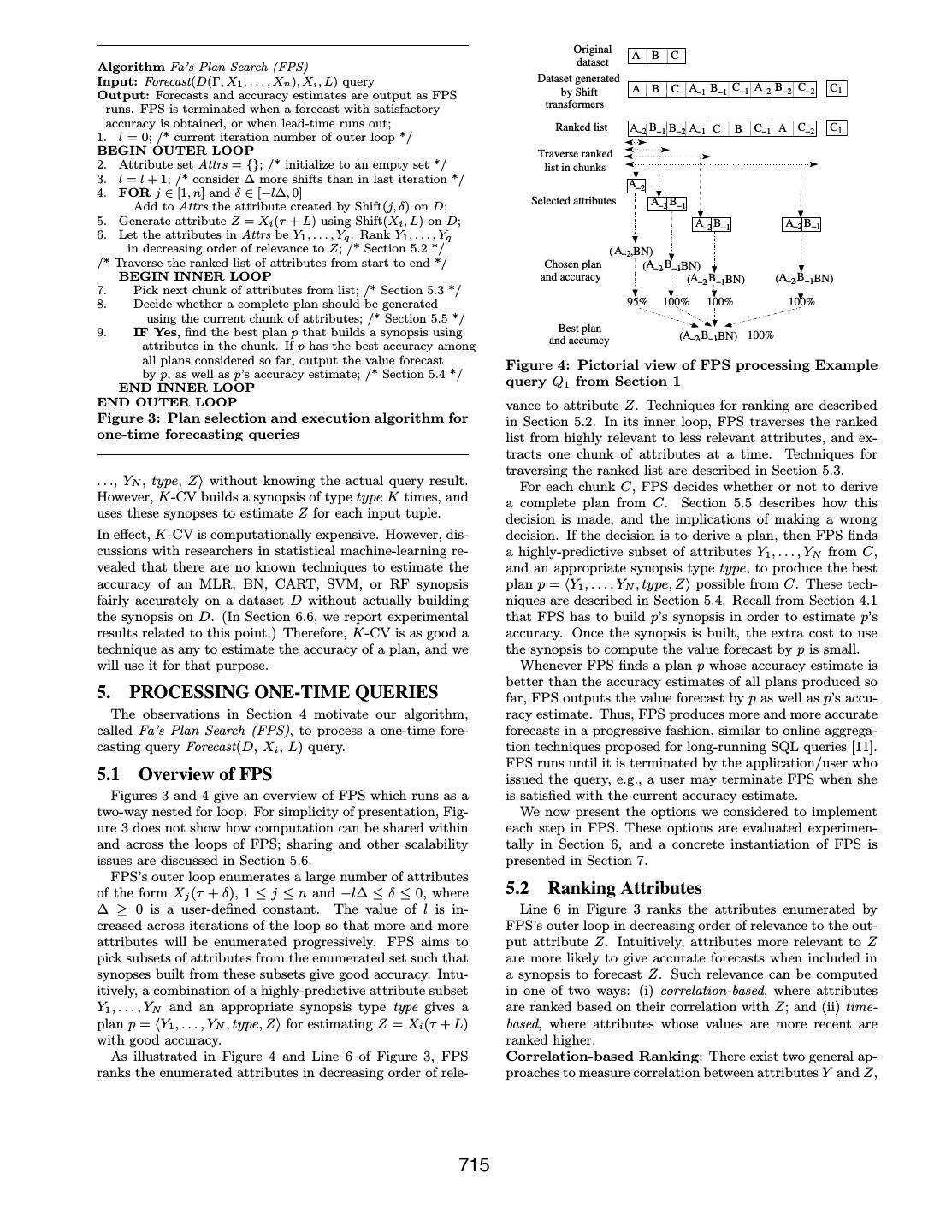 5 . Original A B C dataset Algorithm Fa’s Plan Search (FPS) Input: Forecast(D(Γ, X1 , . . . , Xn ), Xi , L) query Dataset generated by Shift A B C A−1 B−1 C−1 A−2 B−2 C−2 C1 Output: Forecasts and accuracy estimates are output as FPS runs. FPS is terminated when a forecast with satisfactory transformers accuracy is obtained, or when lead-time runs out; Ranked list A−2 B−1 B−2 A−1 C B C−1 A C−2 C1 1. l = 0; /* current iteration number of outer loop */ BEGIN OUTER LOOP Traverse ranked 2. Attribute set Attrs = {}; /* initialize to an empty set */ list in chunks 3. l = l + 1; /* consider ∆ more shifts than in last iteration */ A−2 4. FOR j ∈ [1, n] and δ ∈ [−l∆, 0] Selected attributes A−2 B−1 Add to Attrs the attribute created by Shift(j, δ) on D; 5. Generate attribute Z = Xi (τ + L) using Shift(Xi , L) on D; A−2 B−1 A−2 B−1 6. Let the attributes in Attrs be Y1 , . . . , Yq . Rank Y1 , . . . , Yq in decreasing order of relevance to Z; /* Section 5.2 */ ( A−2,BN) /* Traverse the ranked list of attributes from start to end */ Chosen plan (A−2, B−1,BN) BEGIN INNER LOOP and accuracy (A−2, B−1,BN) (A−2, B−1,BN) 7. Pick next chunk of attributes from list; /* Section 5.3 */ 8. Decide whether a complete plan should be generated 95% 100% 100% 100% using the current chunk of attributes; /* Section 5.5 */ 9. IF Yes, find the best plan p that builds a synopsis using Best plan and accuracy (A−2, B−1,BN) 100% attributes in the chunk. If p has the best accuracy among all plans considered so far, output the value forecast Figure 4: Pictorial view of FPS processing Example by p, as well as p’s accuracy estimate; /* Section 5.4 */ END INNER LOOP query Q1 from Section 1 END OUTER LOOP vance to attribute Z. Techniques for ranking are described Figure 3: Plan selection and execution algorithm for in Section 5.2. In its inner loop, FPS traverses the ranked one-time forecasting queries list from highly relevant to less relevant attributes, and ex- tracts one chunk of attributes at a time. Techniques for traversing the ranked list are described in Section 5.3. . . ., YN , type, Z without knowing the actual query result. For each chunk C, FPS decides whether or not to derive However, K-CV builds a synopsis of type type K times, and a complete plan from C. Section 5.5 describes how this uses these synopses to estimate Z for each input tuple. decision is made, and the implications of making a wrong In effect, K-CV is computationally expensive. However, dis- decision. If the decision is to derive a plan, then FPS finds cussions with researchers in statistical machine-learning re- a highly-predictive subset of attributes Y1 , . . . , YN from C, vealed that there are no known techniques to estimate the and an appropriate synopsis type type, to produce the best accuracy of an MLR, BN, CART, SVM, or RF synopsis plan p = Y1 , . . . , YN , type, Z possible from C. These tech- fairly accurately on a dataset D without actually building niques are described in Section 5.4. Recall from Section 4.1 the synopsis on D. (In Section 6.6, we report experimental that FPS has to build p’s synopsis in order to estimate p’s results related to this point.) Therefore, K-CV is as good a accuracy. Once the synopsis is built, the extra cost to use technique as any to estimate the accuracy of a plan, and we the synopsis to compute the value forecast by p is small. will use it for that purpose. Whenever FPS finds a plan p whose accuracy estimate is better than the accuracy estimates of all plans produced so 5. PROCESSING ONE-TIME QUERIES far, FPS outputs the value forecast by p as well as p’s accu- The observations in Section 4 motivate our algorithm, racy estimate. Thus, FPS produces more and more accurate called Fa’s Plan Search (FPS), to process a one-time fore- forecasts in a progressive fashion, similar to online aggrega- casting query Forecast(D, Xi , L) query. tion techniques proposed for long-running SQL queries [11]. FPS runs until it is terminated by the application/user who 5.1 Overview of FPS issued the query, e.g., a user may terminate FPS when she Figures 3 and 4 give an overview of FPS which runs as a is satisfied with the current accuracy estimate. two-way nested for loop. For simplicity of presentation, Fig- We now present the options we considered to implement ure 3 does not show how computation can be shared within each step in FPS. These options are evaluated experimen- and across the loops of FPS; sharing and other scalability tally in Section 6, and a concrete instantiation of FPS is issues are discussed in Section 5.6. presented in Section 7. FPS’s outer loop enumerates a large number of attributes of the form Xj (τ + δ), 1 ≤ j ≤ n and −l∆ ≤ δ ≤ 0, where 5.2 Ranking Attributes ∆ ≥ 0 is a user-defined constant. The value of l is in- Line 6 in Figure 3 ranks the attributes enumerated by creased across iterations of the loop so that more and more FPS’s outer loop in decreasing order of relevance to the out- attributes will be enumerated progressively. FPS aims to put attribute Z. Intuitively, attributes more relevant to Z pick subsets of attributes from the enumerated set such that are more likely to give accurate forecasts when included in synopses built from these subsets give good accuracy. Intu- a synopsis to forecast Z. Such relevance can be computed itively, a combination of a highly-predictive attribute subset in one of two ways: (i) correlation-based, where attributes Y1 , . . . , YN and an appropriate synopsis type type gives a are ranked based on their correlation with Z; and (ii) time- plan p = Y1 , . . . , YN , type, Z for estimating Z = Xi (τ + L) based, where attributes whose values are more recent are with good accuracy. ranked higher. As illustrated in Figure 4 and Line 6 of Figure 3, FPS Correlation-based Ranking: There exist two general ap- ranks the enumerated attributes in decreasing order of rele- proa