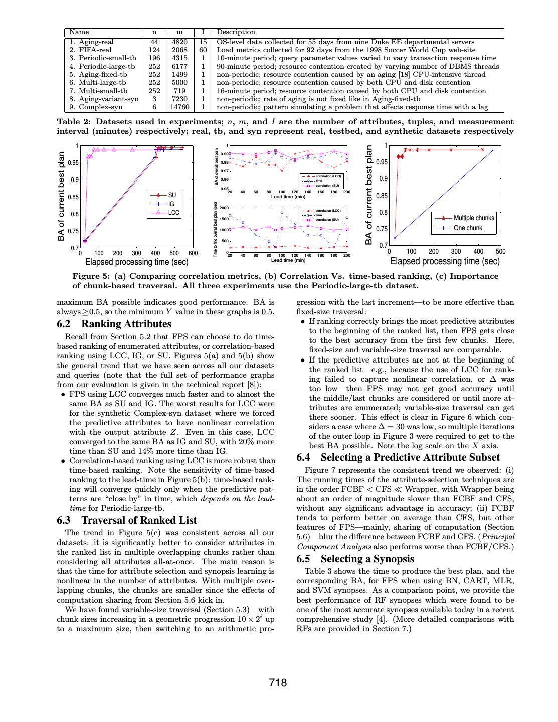 8 . Name n m I Description 1. Aging-real 44 4820 15 OS-level data collected for 55 days from nine Duke EE departmental servers 2. FIFA-real 124 2068 60 Load metrics collected for 92 days from the 1998 Soccer World Cup web-site 3. Periodic-small-tb 196 4315 1 10-minute period; query parameter values varied to vary transaction response time 4. Periodic-large-tb 252 6177 1 90-minute period; resource contention created by varying number of DBMS threads 5. Aging-fixed-tb 252 1499 1 non-periodic; resource contention caused by an aging [18] CPU-intensive thread 6. Multi-large-tb 252 5000 1 non-periodic; resource contention caused by both CPU and disk contention 7. Multi-small-tb 252 719 1 16-minute period; resource contention caused by both CPU and disk contention 8. Aging-variant-syn 3 7230 1 non-periodic; rate of aging is not fixed like in Aging-fixed-tb 9. Complex-syn 6 14760 1 non-periodic; pattern simulating a problem that affects response time with a lag Table 2: Datasets used in experiments; n, m, and I are the number of attributes, tuples, and measurement interval (minutes) respectively; real, tb, and syn represent real, testbed, and synthetic datasets respectively 1 1 1 BA of current best plan BA of overall best plan BA of current best plan 0.99 0.95 0.98 0.95 0.97 correlation (LCC) 0.9 0.96 time 0.9 correlation (SU) 0.95 20 40 60 80 100 120 140 160 180 200 0.85 SU Lead time (min) 0.85 IG Time to find overall best plan (sec) 2000 0.8 LCC correlation (LCC) time 0.8 1500 correlation (SU) Multiple chunks 0.75 1000 0.75 One chunk 500 0.7 0.7 0 100 200 300 400 500 600 0 20 40 60 80 100 120 140 160 180 200 0 100 200 300 400 500 Elapsed processing time (sec) Lead time (min) Elapsed processing time (sec) Figure 5: (a) Comparing correlation metrics, (b) Correlation Vs. time-based ranking, (c) Importance of chunk-based traversal. All three experiments use the Periodic-large-tb dataset. maximum BA possible indicates good performance. BA is gression with the last increment—to be more effective than always ≥ 0.5, so the minimum Y value in these graphs is 0.5. fixed-size traversal: 6.2 Ranking Attributes • If ranking correctly brings the most predictive attributes to the beginning of the ranked list, then FPS gets close Recall from Section 5.2 that FPS can choose to do time- to the best accuracy from the first few chunks. Here, based ranking of enumerated attributes, or correlation-based fixed-size and variable-size traversal are comparable. ranking using LCC, IG, or SU. Figures 5(a) and 5(b) show • If the predictive attributes are not at the beginning of the general trend that we have seen across all our datasets the ranked list—e.g., because the use of LCC for rank- and queries (note that the full set of performance graphs ing failed to capture nonlinear correlation, or ∆ was from our evaluation is given in the technical report [8]): too low—then FPS may not get good accuracy until • FPS using LCC converges much faster and to almost the the middle/last chunks are considered or until more at- same BA as SU and IG. The worst results for LCC were tributes are enumerated; variable-size traversal can get for the synthetic Complex-syn dataset where we forced there sooner. This effect is clear in Figure 6 which con- the predictive attributes to have nonlinear correlation siders a case where ∆ = 30 was low, so multiple iterations with the output attribute Z. Even in this case, LCC of the outer loop in Figure 3 were required to get to the converged to the same BA as IG and SU, with 20% more best BA possible. Note the log scale on the X axis. time than SU and 14% more time than IG. • Correlation-based ranking using LCC is more robust than 6.4 Selecting a Predictive Attribute Subset time-based ranking. Note the sensitivity of time-based Figure 7 represents the consistent trend we observed: (i) ranking to the lead-time in Figure 5(b): time-based rank- The running times of the attribute-selection techniques are ing will converge quickly only when the predictive pat- in the order FCBF < CFS Wrapper, with Wrapper being terns are “close by” in time, which depends on the lead- about an order of magnitude slower than FCBF and CFS, time for Periodic-large-tb. without any significant advantage in accuracy; (ii) FCBF 6.3 Traversal of Ranked List tends to perform better on average than CFS, but other features of FPS—mainly, sharing of computation (Section The trend in Figure 5(c) was consistent across all our 5.6)—blur the difference between FCBF and CFS. (Principal datasets: it is significantly better to consider attributes in Component Analysis also performs worse than FCBF/CFS.) the ranked list in multiple overlapping chunks rather than considering all attributes all-at-once. The main reason is 6.5 Selecting a Synopsis that the time for attribute selection and synopsis learning is Table 3 shows the time to produce the best plan, and the nonlinear in the number of attributes. With multiple over- corresponding BA, for FPS when using BN, CART, MLR, lapping chunks, the chunks are smaller since the effects of and SVM synopses. As a comparison point, we provide the computation sharing from Section 5.6 kick in. best performance of RF synopses which were found to be We have found variable-size traversal (Section 5.3)—with one of the most accurate synopses available today in a recent chunk sizes increasing in a geometric progression 10 × 2i up comprehensive study [4]. (More detailed comparisons with to a maximum size, then switching to an arithmetic pro- RFs are provided in Section 7.) 718