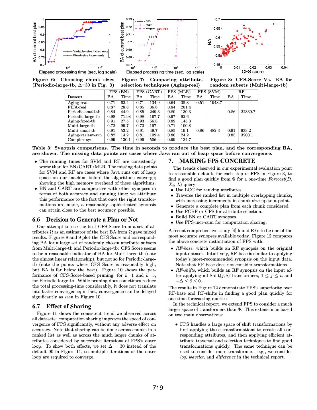 9 . 1 0.73 0.7 CFS BA of current best plan BA of current best plan FCBF 0.95 0.72 Wrapper 0.65 0.9 0.71 0.6 BA 0.85 0.7 0.55 0.8 0.69 Variable−size increments Fixed−size increments 0.5 0.75 0.68 0.7 0.67 0.45 2 3 1 2 3 4 10 10 10 10 10 10 0 0.01 0.02 0.03 0.04 Elapsed processing time (sec, log scale) Elapsed processing time (sec, log scale) CFS score Figure 6: Choosing chunk sizes Figure 7: Comparing attribute- Figure 8: CFS-Score Vs. BA for (Periodic-large-tb, ∆=30 in Fig. 3) selection techniques (Aging-real) random subsets (Multi-large-tb) FPS (BN) FPS (CART) FPS (MLR) FPS (SVM) RF Dataset BA Time BA Time BA Time BA Time BA Time Aging-real 0.71 62.4 0.71 134.9 0.64 35.8 0.51 1948.7 FIFA-real 0.87 28.8 0.85 36.6 0.84 201.4 Periodic-small-tb 0.84 44.9 0.85 249.3 0.80 130.3 0.86 22339.7 Periodic-large-tb 0.98 71.98 0.98 167.7 0.97 92.6 Aging-fixed-tb 0.91 27.5 0.93 56.8 0.89 145.3 Multi-large-tb 0.72 99.7 0.73 197 0.71 100.8 Multi-small-tb 0.91 53.2 0.91 49.7 0.85 19.1 0.86 482.3 0.91 933.2 Aging-variant-syn 0.82 14.2 0.81 109.4 0.80 24.2 0.85 3200.1 Complex-syn 0.99 130.1 0.99 506.4 0.99 134.7 Table 3: Synopsis comparisons. The time in seconds to produce the best plan, and the corresponding BA, are shown. The missing data points are cases where Java ran out of heap space before convergence. • The running times for SVM and RF are consistently 7. MAKING FPS CONCRETE worse than for BN/CART/MLR. The missing data points The trends observed in our experimental evaluation point for SVM and RF are cases where Java runs out of heap to reasonable defaults for each step of FPS in Figure 3, to space on our machine before the algorithms converge; find a good plan quickly from Φ for a one-time Forecast(D, showing the high memory overhead of these algorithms. Xi , L) query: • BN and CART are competitive with other synopses in • Use LCC for ranking attributes. terms of both accuracy and running time; we attribute • Traverse the ranked list in multiple overlapping chunks, this performance to the fact that once the right transfor- with increasing increments in chunk size up to a point. mations are made, a reasonably-sophisticated synopsis • Generate a complete plan from each chunk considered. can attain close to the best accuracy possible. • Use FCBF or CFS for attribute selection. • Build BN or CART synopses. 6.6 Decision to Generate a Plan or Not • Use FPS-incr-cum for computation sharing. Our attempt to use the best CFS Score from a set of at- tributes Ω as an estimator of the best BA from Ω gave mixed A recent comprehensive study [4] found RFs to be one of the results. Figures 8 and 9 plot the CFS Score and correspond- most accurate synopses available today. Figure 12 compares ing BA for a large set of randomly chosen attribute subsets the above concrete instantiation of FPS with: from Multi-large-tb and Periodic-large-tb: CFS Score seems • RF-base, which builds an RF synopsis on the original to be a reasonable indicator of BA for Multi-large-tb (note input dataset. Intuitively, RF-base is similar to applying the almost linear relationship), but not so for Periodic-large- today’s most-recommended synopsis on the input data. tb (note the points where CFS Score is reasonably high, Note that RF-base does not consider transformations. but BA is far below the best). Figure 10 shows the per- • RF-shifts, which builds an RF synopsis on the input af- formance of CFS-Score-based pruning, for k=1 and k=5, ter applying all Shift(j, δ) transformers, 1 ≤ j ≤ n and for Periodic-large-tb. While pruning does sometimes reduce −∆ ≤ δ ≤ 0. the total processing-time considerably, it does not translate The results in Figure 12 demonstrate FPS’s superiority over into faster convergence; in fact, convergence can be delayed RF-base and RF-shifts in finding a good plan quickly for significantly as seen in Figure 10. one-time forecasting queries. In the technical report, we extend FPS to consider a much 6.7 Effect of Sharing larger space of transformers than Φ. This extension is based Figure 11 shows the consistent trend we observed across on two main observations: all datasets: computation sharing improves the speed of con- vergence of FPS significantly, without any adverse effect on • FPS handles a large space of shift transformations by accuracy. Note that sharing can be done across chunks in a first applying these transformations to create all cor- ranked list as well as across the much larger chunks of at- responding attributes, and then applying efficient at- tributes considered by successive iterations of FPS’s outer tribute traversal and selection techniques to find good loop. To show both effects, we set ∆ = 30 instead of the transformations quickly. The same technique can be default 90 in Figure 11, so multiple iterations of the outer used to consider more transformers, e.g., we consider loop are required to converge. log, wavelet, and difference in the technical report. 719