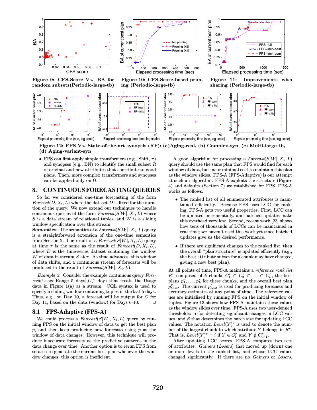 10 . 1 1 1 BA of current best plan BA of current best plan 0.9 0.95 0.95 BA 0.8 0.9 0.9 0.7 0.85 No pruning 0.85 FPS−full Pruning (k5) 0.6 0.8 Pruning (k1) 0.8 FPS−incr−best FPS−incr−cum 0.5 0.75 0.75 0.4 0.7 0.7 0 0.02 0.04 0.06 0.08 0.1 0 100 200 300 400 500 600 0 500 1000 1500 CFS score Elapsed processing time (sec) Elapsed processing time (sec) Figure 9: CFS-Score Vs. BA for Figure 10: CFS-Score-based prun- Figure 11: Improvements with random subsets(Periodic-large-tb) ing (Periodic-large-tb) sharing (Periodic-large-tb) BA of current best plan BA of current best plan BA of current best plan BA of current best plan 0.66 0.75 FPS FPS RF−base 0.7 RF−base 0.8 0.64 0.95 FPS RF−shifts RF−shifts FPS RF−base 0.65 RF−base 0.62 RF−shifts 0.7 RF−shifts 0.9 0.6 0.6 0.6 0.55 0.58 0.85 0 1 2 3 0.5 0.5 0 1 2 3 0 1 2 3 4 0 1 2 10 10 10 10 10 10 10 10 10 10 10 10 10 10 10 10 Elapsed processing time (sec, log scale) Elapsed processing time (sec, log scale) Elapsed processing time (sec, log scale) Elapsed processing time (sec, log scale) Figure 12: FPS Vs. State-of-the-art synopsis (RF): (a)Aging-real, (b) Complex-syn, (c) Multi-large-tb, (d) Aging-variant-syn • FPS can first apply simple transformers (e.g., Shift, π) A good algorithm for processing a Forecast(S[W ], Xi , L) and synopses (e.g., BN) to identify the small subset Ω query should use the same plan that FPS would find for each of original and new attributes that contribute to good window of data, but incur minimal cost to maintain this plan plans. Then, more complex transformers and synopses as the window slides. FPS-A (FPS-Adaptive) is our attempt can be applied only on Ω. at such an algorithm. FPS-A exploits the structure (Figure 4) and defaults (Section 7) we established for FPS. FPS-A 8. CONTINUOUS FORECASTING QUERIES works as follows: So far we considered one-time forecasting of the form • The ranked list of all enumerated attributes is main- Forecast(D, Xi , L) where the dataset D is fixed for the dura- tained efficiently. Because FPS uses LCC for rank- tion of the query. We now extend our techniques to handle ing, FPS-A gets two useful properties. First, LCC can continuous queries of the form Forecast(S[W ], Xi , L) where be updated incrementally, and batched updates make S is a data stream of relational tuples, and W is a sliding this overhead very low. Second, recent work [23] shows window specification over this stream. how tens of thousands of LCCs can be maintained in Semantics: The semantics of a Forecast(S[W ], Xi , L) query real-time; we haven’t used this work yet since batched is a straightforward extension of the one-time semantics updates give us the desired performance. from Section 2. The result of a Forecast(S[W ], Xi , L) query at time τ is the same as the result of Forecast(D, Xi , L), • If there are significant changes to the ranked list, then where D is the time-series dataset containing the window the overall “plan structure” is updated efficiently (e.g., W of data in stream S at τ . As time advances, this window the best attribute subset for a chunk may have changed, of data shifts, and a continuous stream of forecasts will be giving a new best plan). produced in the result of Forecast(S[W ], Xi , L). At all points of time, FPS-A maintains a reference rank list Example 3. Consider the example continuous query Fore- Rr composed of k chunks C1r ⊂ C2r ⊂ · · · ⊂ Ckr , the best cast(Usage[Range 5 days],C,1 day) that treats the Usage plans pr1 , . . . , prk for these chunks, and the overall best plan data in Figure 1(a) as a stream. CQL syntax is used to prbest . The current prbest is used for producing forecasts and specify a sliding window containing tuples in the last 5 days. accuracy estimates at any point of time. The reference val- Thus, e.g., on Day 10, a forecast will be output for C for ues are initialized by running FPS on the initial window of Day 11, based on the data (window) for Days 6-10. ✷ tuples. Figure 13 shows how FPS-A maintains these values as the window slides over time. FPS-A uses two user-defined 8.1 FPS-Adaptive (FPS-A) thresholds: α for detecting significant changes in LCC val- We could process a Forecast(S[W ], Xi , L) query by run- ues, and β that determines the batch size for updating LCC ning FPS on the initial window of data to get the best plan values. The notation Level(Y )r is used to denote the num- p, and then keep producing new forecasts using p as the ber of the largest chunk to which attribute Y belongs in Rr . window of data changes. However, this technique will pro- That is, Level(Y )r = i if Y ∈ Cir and Y ∈ r / Ci+1 . duce inaccurate forecasts as the predictive patterns in the After updating LCC scores, FPS-A computes two sets data change over time. Another option is to rerun FPS from of attributes: Gainers (Losers) that moved up (down) one scratch to generate the current best plan whenever the win- or more levels in the ranked list, and whose LCC values dow changes; this option is inefficient. changed significantly. If there are no Gainers or Losers, 720