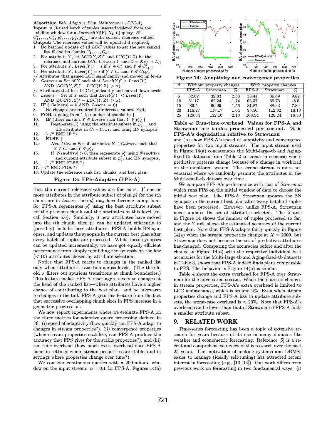 11 . 1 1 Algorithm Fa’s Adaptive Plan Maintenance (FPS-A) FPS−A(batch=10) BA of current best plan BA of current best plan Strawman Input: A β-sized batch of tuples inserted/deleted from the 0.9 0.9 sliding window for a Forecast(S[W ], Xi , L) query. Rr , 0.8 0.8 C1r , . . . , Ckr , pr1 , . . . , prk , prbest are the current reference values; Output: The reference values will be updated if required; 0.7 0.7 1. Do batched update of all LCC values to get the new ranked 0.6 0.6 list R and its chunks C1 , . . . , Ck ; 2. For attribute Y , let LCC(Y, Z)r and LCC(Y, Z) be the 0.5 0.5 FPS−A(batch=10) Strawman reference and current LCC between Y and Z = Xi (τ + L); 0.4 3. For attribute Y , Level(Y )r = i if Y ∈ Cir and Y ∈ r ; / Ci+1 0.4 0 1000 2000 3000 4000 5000 0 500 1000 1500 2000 2500 4. For attribute Y , Level(Y ) = i if Y ∈ Ci and Y ∈ / Ci+1 ; Number of tuples processed so far Number of tuples processed so far // Attributes that gained LCC significantly and moved up levels Figure 14: Adaptivity and convergence properties 5. Gainers = Set of Y such that Level(Y )r > Level(Y ) AND |LCC(Y, Z)r − LCC(Y, Z)| > α); β Without property changes With property changes // Attributes that lost LCC significantly and moved down levels FPS-A Strawman % FPS-A Strawman % 6. Losers = Set of Y such that Level(Y )r < Level(Y ) 5 32.02 32.83 2.53 33.41 36.69 9.82 AND |LCC(Y, Z)r − LCC(Y, Z)| > α); 10 61.17 62.24 1.74 66.37 60.73 -8.5 7. IF (|Gainers| = 0 AND |Losers| = 0) 15 89.5 90.99 1.56 81.87 88.33 7.89 8. No changes are required for reference values. Exit; 20 116.27 118.17 1.64 95.50 112.82 18.13 9. FOR (i going from 1 to number of chunks k) { 25 129.34 132.10 2.13 108.54 126.24 16.30 10. IF (there exists a Y ∈ Losers such that Y ∈ pri ) { 11. Regenerate pri using the attribute subset in pri−1 and Table 4: Run-time overhead. Values for FPS-A and the attributes in Ci − Ci−1 , and using BN synopsis; Strawman are tuples processed per second. % is 12. } /* END IF */ FPS-A’s degradation relative to Strawman 13. ELSE { and (b) show FPS-A’s speed of adaptivity and convergence 14. N ewAttrs = Set of attributes Y ∈ Gainers such that properties for two input streams. The input stream used Y ∈ Ci and Y ∈ / pri ; 15. If |N ewAttrs| > 0, then regenerate pri using N ewAttrs in Figure 14(a) concatenates the Multi-large-tb and Aging- and current attribute subset in pri , and BN synopsis; fixed-tb datasets from Table 2 to create a scenario where 16. } /* END ELSE */ predictive patterns change because of a change in workload 17. } /* END FOR */ on the monitored system. The second stream is more ad- 18. Update the reference rank list, chunks, and best plan; versarial where we randomly permute the attributes in the Figure 13: FPS-Adaptive (FPS-A) Multi-small-tb dataset over time. We compare FPS-A’s performance with that of Strawman then the current reference values are fine as is. If one or which runs FPS on the initial window of data to choose the more attributes in the attribute subset of plan pri for the ith initial best plan. Like FPS-A, Strawman updates the BN chunk are in Losers, then pri may have become suboptimal. synopsis in the current best plan after every batch of tuples So, FPS-A regenerates pri using the best attribute subset have been processed. However, unlike FPS-A, Strawman for the previous chunk and the attributes at this level (re- never updates the set of attributes selected. The X-axis call Section 5.6). Similarly, if new attributes have moved in Figure 14 shows the number of tuples processed so far, into the ith chunk, then pri can be updated efficiently to and the Y axis shows the estimated accuracy of the current (possibly) include these attributes. FPS-A builds BN syn- best plan. Note that FPS-A adapts fairly quickly in Figure opses, and updates the synopsis in the current best plan after 14(a) when the stream properties change at X = 2000, but every batch of tuples are processed. While these synopses Strawman does not because the set of predictive attributes can be updated incrementally, we have got equally efficient has changed. Comparing the accuracies before and after the performance from simply rebuilding the synopsis on the few change in Figure 14(a) with the respective individual best (< 10) attributes chosen by attribute selection. accuracies for the Multi-large-tb and Aging-fixed-tb datasets Notice that FPS-A reacts to changes in the ranked list in Table 3, shows that FPS-A indeed finds plans comparable only when attributes transition across levels. (The thresh- to FPS. The behavior in Figure 14(b) is similar. old α filters out spurious transitions at chunk boundaries.) Table 4 shows the extra overhead for FPS-A over Straw- This feature makes FPS-A react aggressively to changes at man for the adversarial stream. When there are no changes the head of the ranked list—where attributes have a higher in stream properties, FPS-A’s extra overhead is limited to chance of contributing to the best plan—and be lukewarm LCC maintenance; which is around 2%. Even when stream to changes in the tail. FPS-A gets this feature from the fact properties change and FPS-A has to update attribute sub- that successive overlapping chunk sizes in FPS increase in a sets, the worst-case overhead is < 20%. Note that FPS-A’s geometric progression. overhead can be lower than that of Strawman if FPS-A finds We now report experiments where we evaluate FPS-A on a smaller attribute subset. the three metrics for adaptive query processing defined in [3]: (i) speed of adaptivity (how quickly can FPS-A adapt to 9. RELATED WORK changes in stream properties?), (ii) convergence properties Time-series forecasting has been a topic of extensive re- (when stream properties stabilize, can FPS-A produce the search for years because of its use in many domains like accuracy that FPS gives for the stable properties?), and (iii) weather and econometric forecasting. Reference [5] is a re- ru