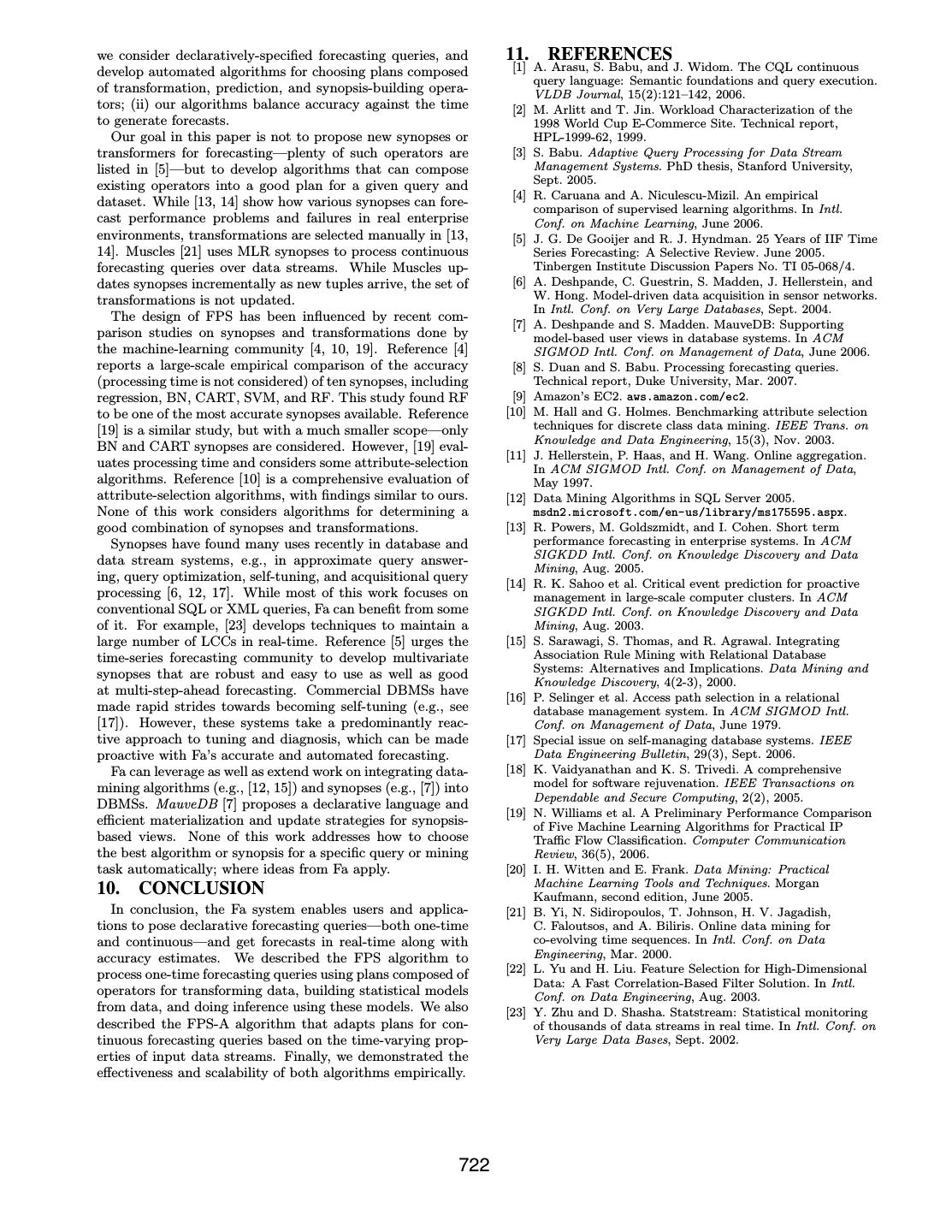 12 .we consider declaratively-specified forecasting queries, and 11. REFERENCES develop automated algorithms for choosing plans composed [1] A. Arasu, S. Babu, and J. Widom. The CQL continuous query language: Semantic foundations and query execution. of transformation, prediction, and synopsis-building opera- VLDB Journal, 15(2):121–142, 2006. tors; (ii) our algorithms balance accuracy against the time [2] M. Arlitt and T. Jin. Workload Characterization of the to generate forecasts. 1998 World Cup E-Commerce Site. Technical report, Our goal in this paper is not to propose new synopses or HPL-1999-62, 1999. transformers for forecasting—plenty of such operators are [3] S. Babu. Adaptive Query Processing for Data Stream listed in [5]—but to develop algorithms that can compose Management Systems. PhD thesis, Stanford University, existing operators into a good plan for a given query and Sept. 2005. [4] R. Caruana and A. Niculescu-Mizil. An empirical dataset. While [13, 14] show how various synopses can fore- comparison of supervised learning algorithms. In Intl. cast performance problems and failures in real enterprise Conf. on Machine Learning, June 2006. environments, transformations are selected manually in [13, [5] J. G. De Gooijer and R. J. Hyndman. 25 Years of IIF Time 14]. Muscles [21] uses MLR synopses to process continuous Series Forecasting: A Selective Review. June 2005. forecasting queries over data streams. While Muscles up- Tinbergen Institute Discussion Papers No. TI 05-068/4. dates synopses incrementally as new tuples arrive, the set of [6] A. Deshpande, C. Guestrin, S. Madden, J. Hellerstein, and transformations is not updated. W. Hong. Model-driven data acquisition in sensor networks. In Intl. Conf. on Very Large Databases, Sept. 2004. The design of FPS has been influenced by recent com- [7] A. Deshpande and S. Madden. MauveDB: Supporting parison studies on synopses and transformations done by model-based user views in database systems. In ACM the machine-learning community [4, 10, 19]. Reference [4] SIGMOD Intl. Conf. on Management of Data, June 2006. reports a large-scale empirical comparison of the accuracy [8] S. Duan and S. Babu. Processing forecasting queries. (processing time is not considered) of ten synopses, including Technical report, Duke University, Mar. 2007. regression, BN, CART, SVM, and RF. This study found RF [9] Amazon’s EC2. aws.amazon.com/ec2. to be one of the most accurate synopses available. Reference [10] M. Hall and G. Holmes. Benchmarking attribute selection [19] is a similar study, but with a much smaller scope—only techniques for discrete class data mining. IEEE Trans. on Knowledge and Data Engineering, 15(3), Nov. 2003. BN and CART synopses are considered. However, [19] eval- [11] J. Hellerstein, P. Haas, and H. Wang. Online aggregation. uates processing time and considers some attribute-selection In ACM SIGMOD Intl. Conf. on Management of Data, algorithms. Reference [10] is a comprehensive evaluation of May 1997. attribute-selection algorithms, with findings similar to ours. [12] Data Mining Algorithms in SQL Server 2005. None of this work considers algorithms for determining a msdn2.microsoft.com/en-us/library/ms175595.aspx. good combination of synopses and transformations. [13] R. Powers, M. Goldszmidt, and I. Cohen. Short term Synopses have found many uses recently in database and performance forecasting in enterprise systems. In ACM data stream systems, e.g., in approximate query answer- SIGKDD Intl. Conf. on Knowledge Discovery and Data Mining, Aug. 2005. ing, query optimization, self-tuning, and acquisitional query [14] R. K. Sahoo et al. Critical event prediction for proactive processing [6, 12, 17]. While most of this work focuses on management in large-scale computer clusters. In ACM conventional SQL or XML queries, Fa can benefit from some SIGKDD Intl. Conf. on Knowledge Discovery and Data of it. For example, [23] develops techniques to maintain a Mining, Aug. 2003. large number of LCCs in real-time. Reference [5] urges the [15] S. Sarawagi, S. Thomas, and R. Agrawal. Integrating time-series forecasting community to develop multivariate Association Rule Mining with Relational Database synopses that are robust and easy to use as well as good Systems: Alternatives and Implications. Data Mining and Knowledge Discovery, 4(2-3), 2000. at multi-step-ahead forecasting. Commercial DBMSs have [16] P. Selinger et al. Access path selection in a relational made rapid strides towards becoming self-tuning (e.g., see database management system. In ACM SIGMOD Intl. [17]). However, these systems take a predominantly reac- Conf. on Management of Data, June 1979. tive approach to tuning and diagnosis, which can be made [17] Special issue on self-managing database systems. IEEE proactive with Fa’s accurate and automated forecasting. Data Engineering Bulletin, 29(3), Sept. 2006. Fa can leverage as well as extend work on integrating data- [18] K. Vaidyanathan and K. S. Trivedi. A comprehensive mining algorithms (e.g., [12, 15]) and synopses (e.g., [7]) into model for software rejuvenation. IEEE Transactions on Dependable and Secure Computing, 2(2), 2005. DBMSs. MauveDB [7] proposes a declarative language and [19] N. Williams et al. A Preliminary Performance Comparison efficient materialization and update strategies for synopsis- of Five Machine Learning Algorithms for Practical IP based views. None of this work addresses how to choose Traffic Flow Classification. Computer Communication the best algorithm or synopsis for a specific query or mining Review, 36(5), 2006. task automatically; where ideas from Fa apply. [20] I. H. Witten and E. Frank. Data Mining: Practical Machine Learning Tools and Techniques. Morgan 10. CONCLUSION Kaufmann, second edition, June 2005. In conclusion, the Fa system enables users and applica- [21] B. Yi, N. Sidiropoulos, T. Johnson, H. V. Jagadish, tions to pose declarative forecasting queries—both one-time C. Falouts