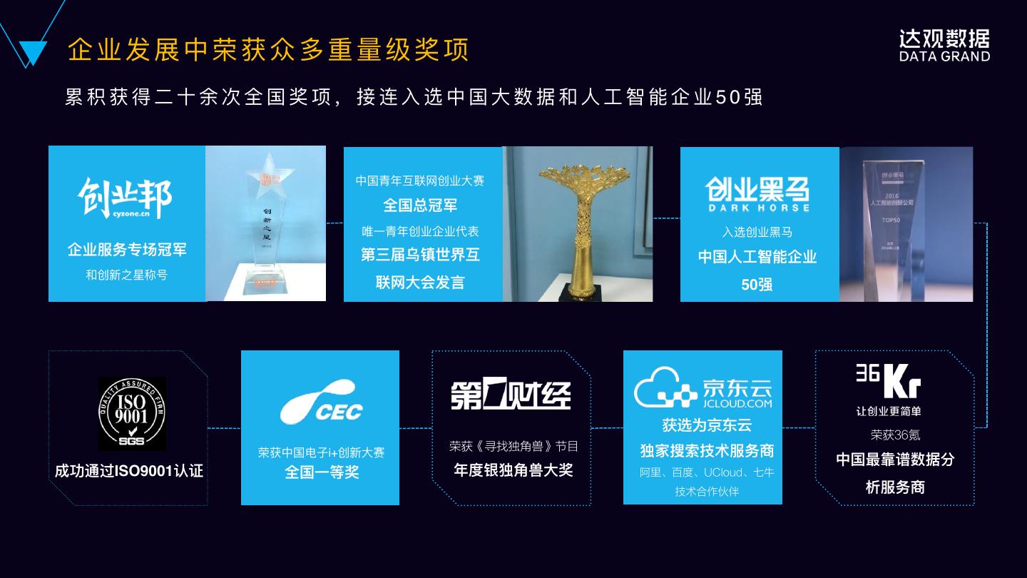 6 . 企 业 发 展 中 荣 获 众 多 重 量量 级 奖 项 累 积 获 得 ⼆二 ⼗十 余 次 全 国 奖 项 , 接 连 ⼊入 选 中 国 ⼤大 数 据 和 ⼈人 ⼯工 智 能 企 业 5 0 强 中国⻘青年年互联⽹网创业⼤大赛 全国总冠军 唯⼀一⻘青年年创业企业代表 ⼊入选创业⿊黑⻢马 企业服务专场冠军 第三届乌镇世界互 中国⼈人⼯工智能企业 和创新之星称号 联⽹网⼤大会发⾔言 50强 获选为京东云 荣获36氪 荣获《寻找独角兽》节目 独家搜索技术服务商 荣获中国电⼦子i+创新⼤大赛 中国最靠谱数据分 成功通过ISO9001认证 全国⼀一等奖 年年度银独⻆角兽⼤大奖 阿里、百度、UCloud、七牛 技术合作伙伴 析服务商