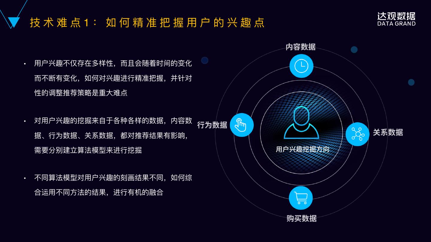 16 . 技 术 难 点 1 : 如 何 精 准 把 握 ⽤用 户 的 兴 趣 点 ● ⽤用户兴趣不不仅存在多样性,⽽而且会随着时间的变化 ⽽而不不断有变化,如何对兴趣进⾏行行精准把握,并针对 性的调整推荐策略略是重⼤大难点 ● 对⽤用户兴趣的挖掘来⾃自于各种各样的数据,内容数 据、⾏行行为数据、关系数据,都对推荐结果有影响, 需要分别建⽴立算法模型来进⾏行行挖掘 ● 不不同算法模型对⽤用户兴趣的刻画结果不不同,如何综 合运⽤用不不同⽅方法的结果,进⾏行行有机的融合