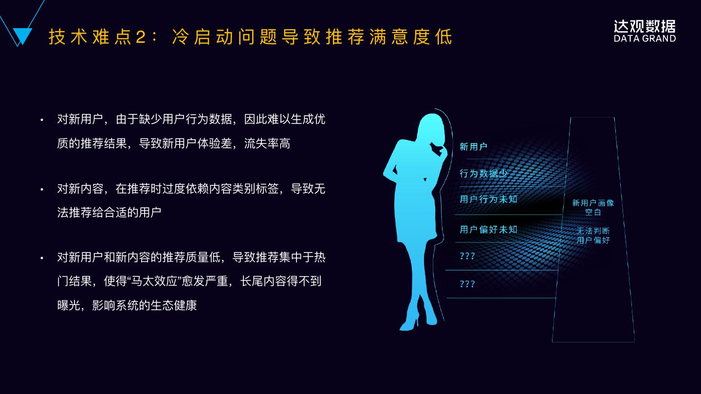 17 . 技术难点2:冷启动问题导致推荐满意度低 ● 对新⽤用户,由于缺少⽤用户⾏行行为数据,因此难以⽣生成优 质的推荐结果,导致新⽤用户体验差,流失率⾼高 ● 对新内容,在推荐时过度依赖内容类别标签,导致⽆无 法推荐给合适的⽤用户 ● 对新⽤用户和新内容的推荐质量量低,导致推荐集中于热 ⻔门结果,使得“⻢马太效应”愈发严重,⻓长尾内容得不不到 曝光,影响系统的⽣生态健康