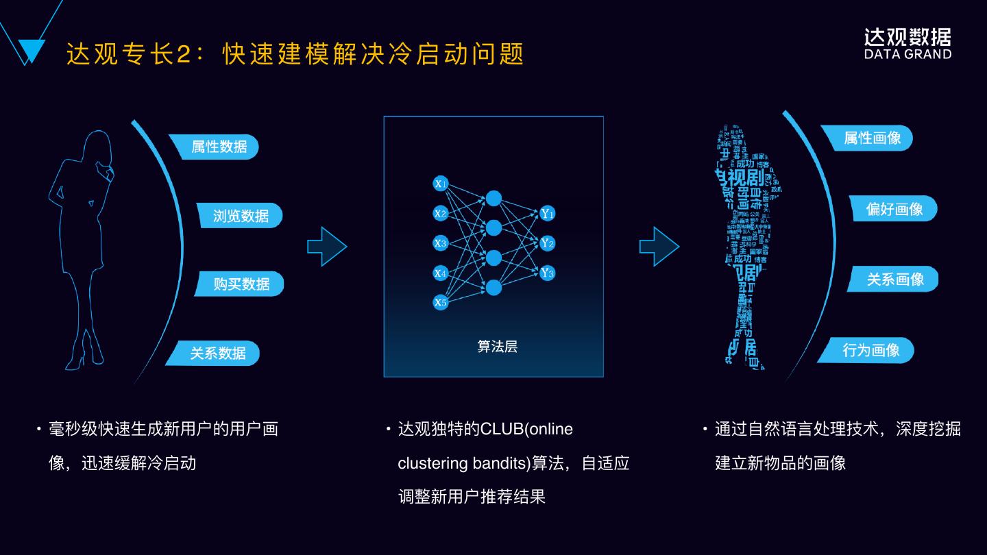 21 . 达 观 专 ⻓长 2 : 快 速 建 模 解 决 冷 启 动 问 题 • 毫秒级快速⽣生成新⽤用户的⽤用户画 • 达观独特的CLUB(online • 通过⾃自然语⾔言处理理技术,深度挖掘 像,迅速缓解冷启动 clustering bandits)算法,⾃自适应 建⽴立新物品的画像 调整新⽤用户推荐结果