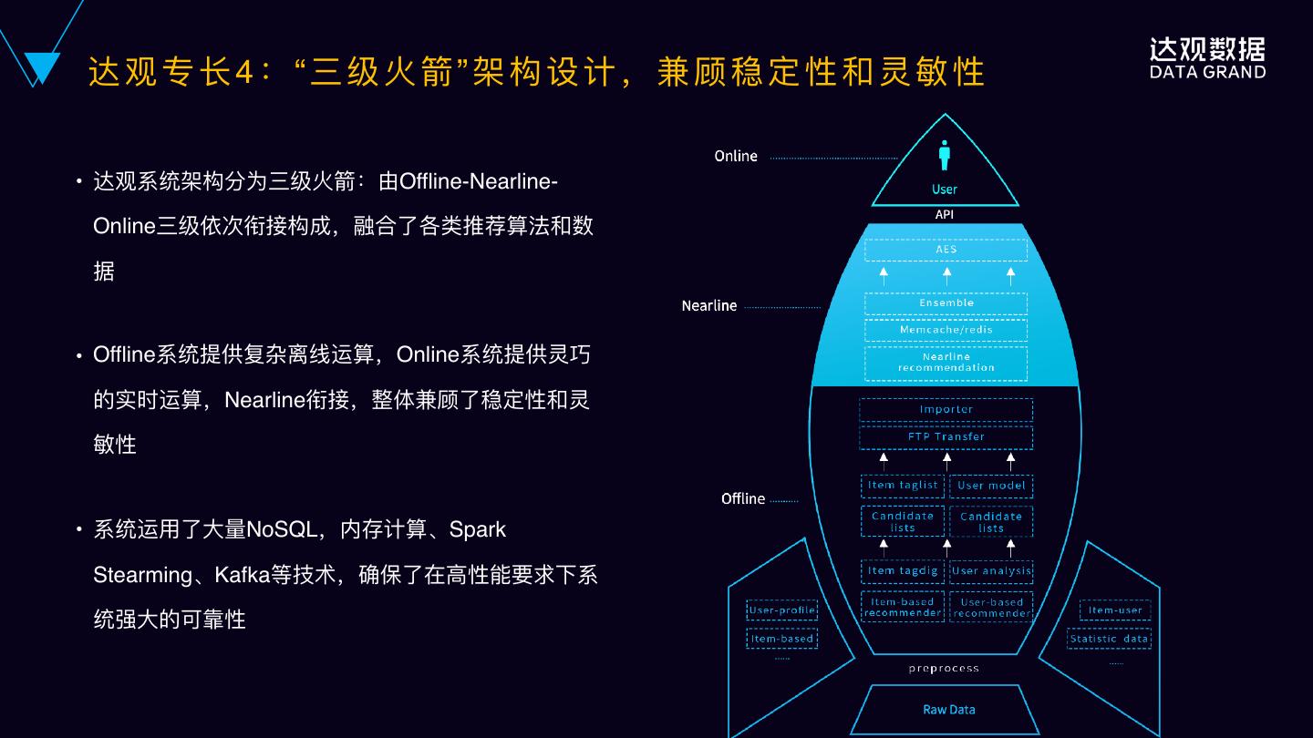 23 .达 观 专 ⻓长 4 : “ 三 级 ⽕火 箭 ” 架 构 设 计 , 兼 顾 稳 定 性 和 灵 敏敏 性 • 达观系统架构分为三级⽕火箭:由Offline-Nearline- Online三级依次衔接构成,融合了了各类推荐算法和数 据 • Offline系统提供复杂离线运算,Online系统提供灵巧 的实时运算,Nearline衔接,整体兼顾了了稳定性和灵 敏敏性 • 系统运⽤用了了⼤大量量NoSQL,内存计算、Spark Stearming、Kafka等技术,确保了了在⾼高性能要求下系 统强⼤大的可靠性