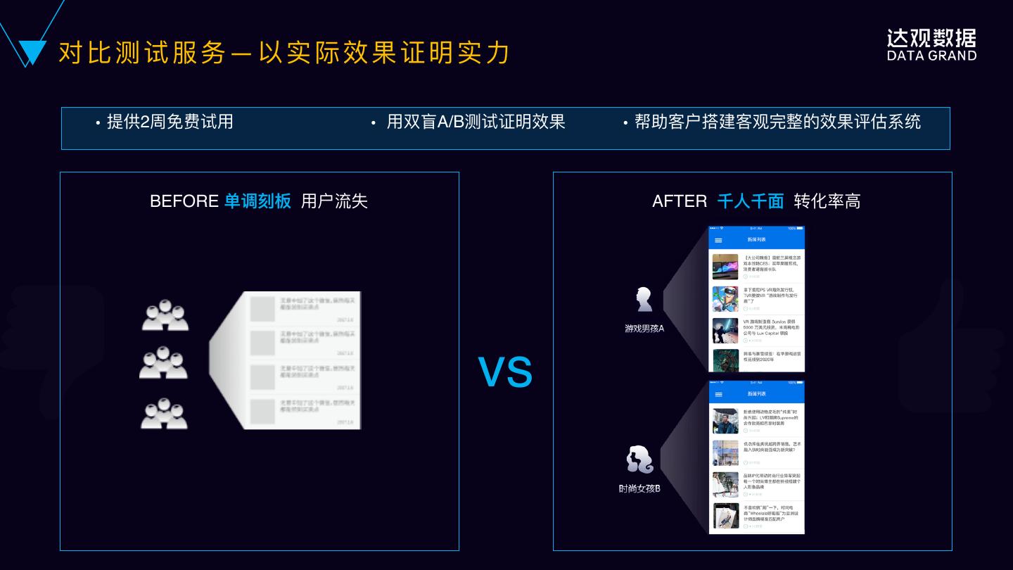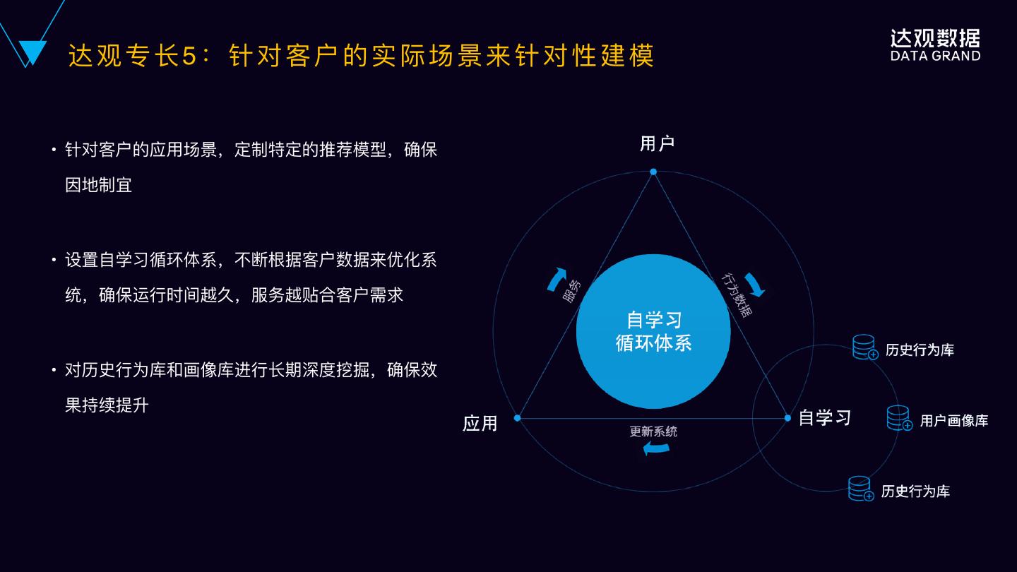 24 . 达 观 专 ⻓长 5 : 针 对 客 户 的 实 际 场 景 来 针 对 性 建 模 • 针对客户的应⽤用场景,定制特定的推荐模型,确保 因地制宜 • 设置⾃自学习循环体系,不不断根据客户数据来优化系 统,确保运⾏行行时间越久,服务越贴合客户需求 • 对历史⾏行行为库和画像库进⾏行行⻓长期深度挖掘,确保效 果持续提升