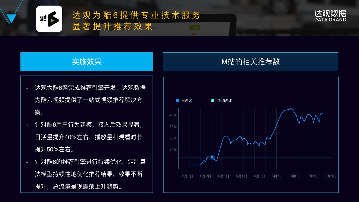 28 . 达观为酷6提供专业技术服务 显著提升推荐效果 实施效果 M站的相关推荐数 ● 达观为酷6⽹网完成推荐引擎开发,达观数据 为酷六视频提供了了⼀一站式视频推荐解决⽅方 案。 ● 针对酷6⽤用户⾏行行为建模,接⼊入后效果显著, ⽇日活量量提升40%左右,播放量量和观看时⻓长 提升50%左右。 ● 针对酷6的推荐引擎进⾏行行持续优化,定制算 法模型持续性地优化推荐结果,效果不不断 提升,总流量量呈现震荡上升趋势。