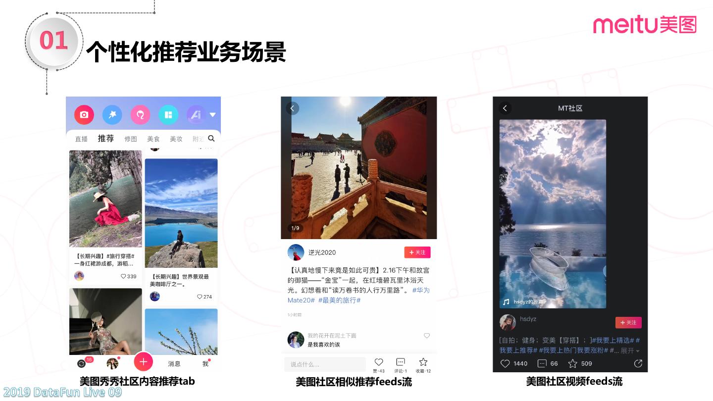 3 .01 个性化推荐业务场景 美图秀秀社区内容推荐tab 美图社区相似推荐feeds流 美图社区视频feeds流