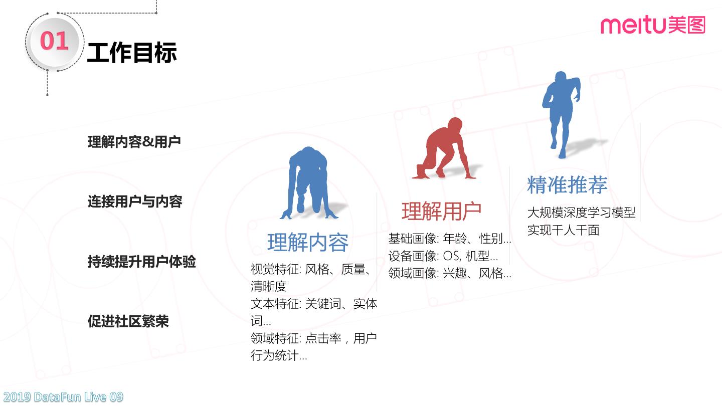 4 .01 工作目标 理解内容&用户 精准推荐 连接用户与内容 理解用户 大规模深度学习模型 实现千人千面 理解内容 基础画像: 年龄、性别… 设备画像: OS, 机型… 持续提升用户体验 视觉特征: 风格、质量、 领域画像: 兴趣、风格… 清晰度 文本特征: 关键词、实体 促进社区繁荣 词… 领域特征: 点击率,用户 行为统计…