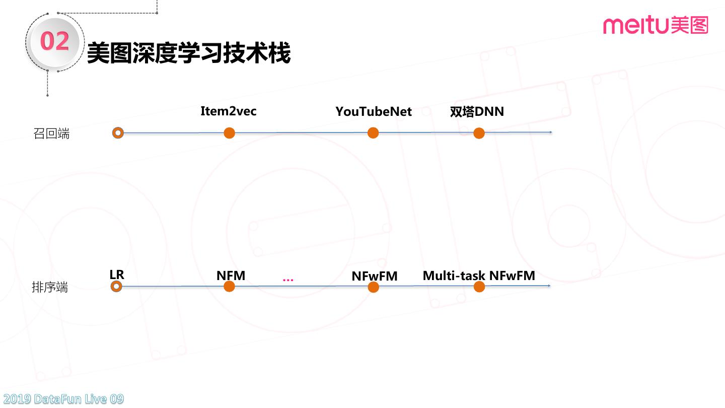 6 .02 美图深度学习技术栈 Item2vec YouTubeNet 双塔DNN 召回端 LR NFM … NFwFM Multi-task NFwFM 排序端