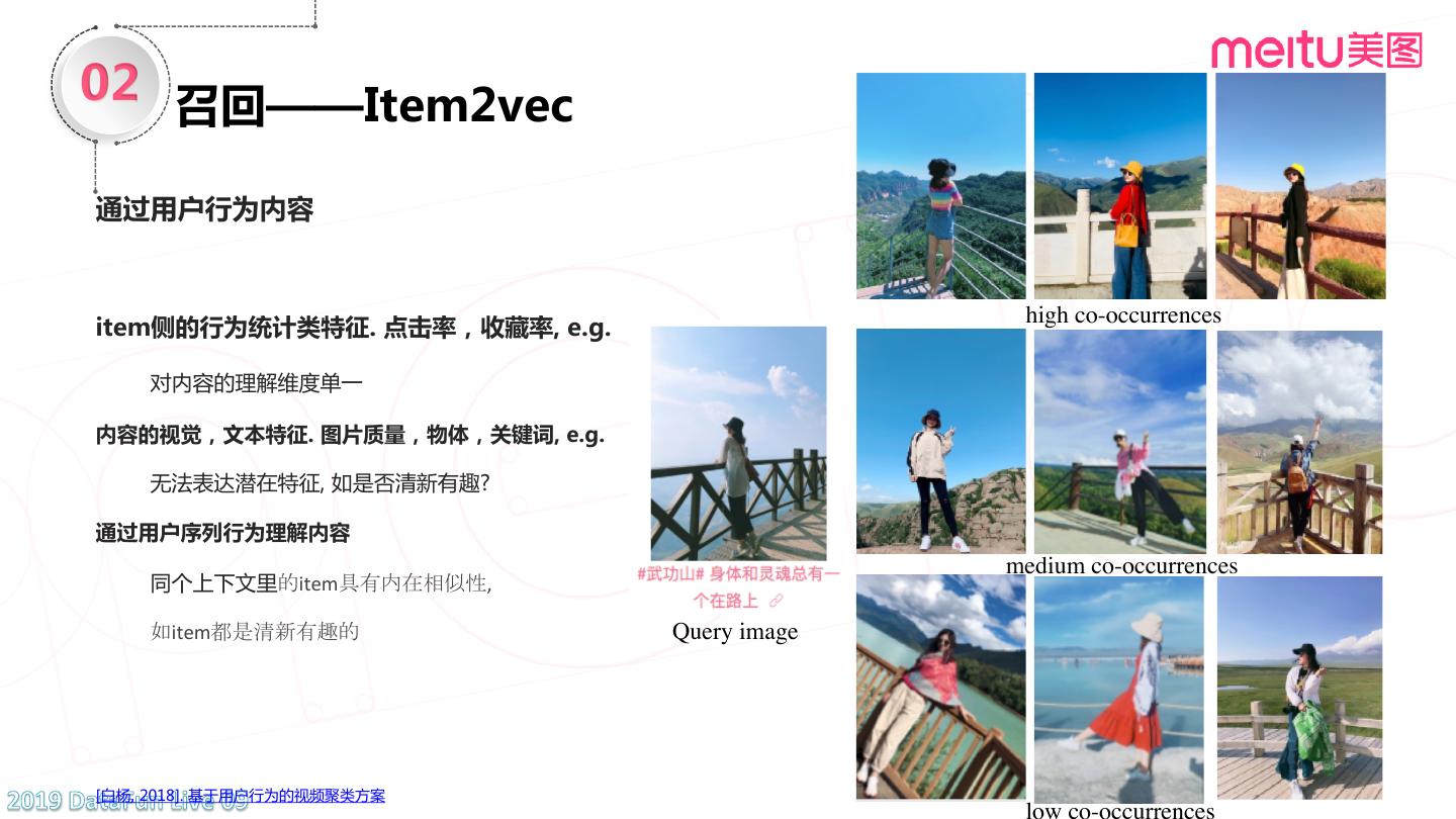 7 .02 召回——Item2vec 通过用户行为内容 high co-occurrences item侧的行为统计类特征. 点击率,收藏率, e.g. 对内容的理解维度单一 内容的视觉,文本特征. 图片质量,物体,关键词, e.g. 无法表达潜在特征, 如是否清新有趣? 通过用户序列行为理解内容 medium co-occurrences 同个上下文里的item具有内在相似性, 如item都是清新有趣的 Query image [白杨, 2018]. 基于用户行为的视频聚类方案