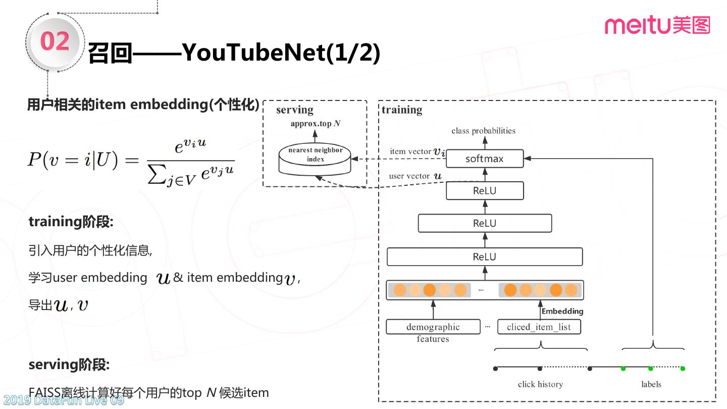 9 . 02 召回——YouTubeNet(1/2) 用户相关的item embedding(个性化) training阶段: 引入用户的个性化信息, 学习user embedding & item embedding , 导出 , serving阶段: FAISS离线计算好每个用户的top N 候选item