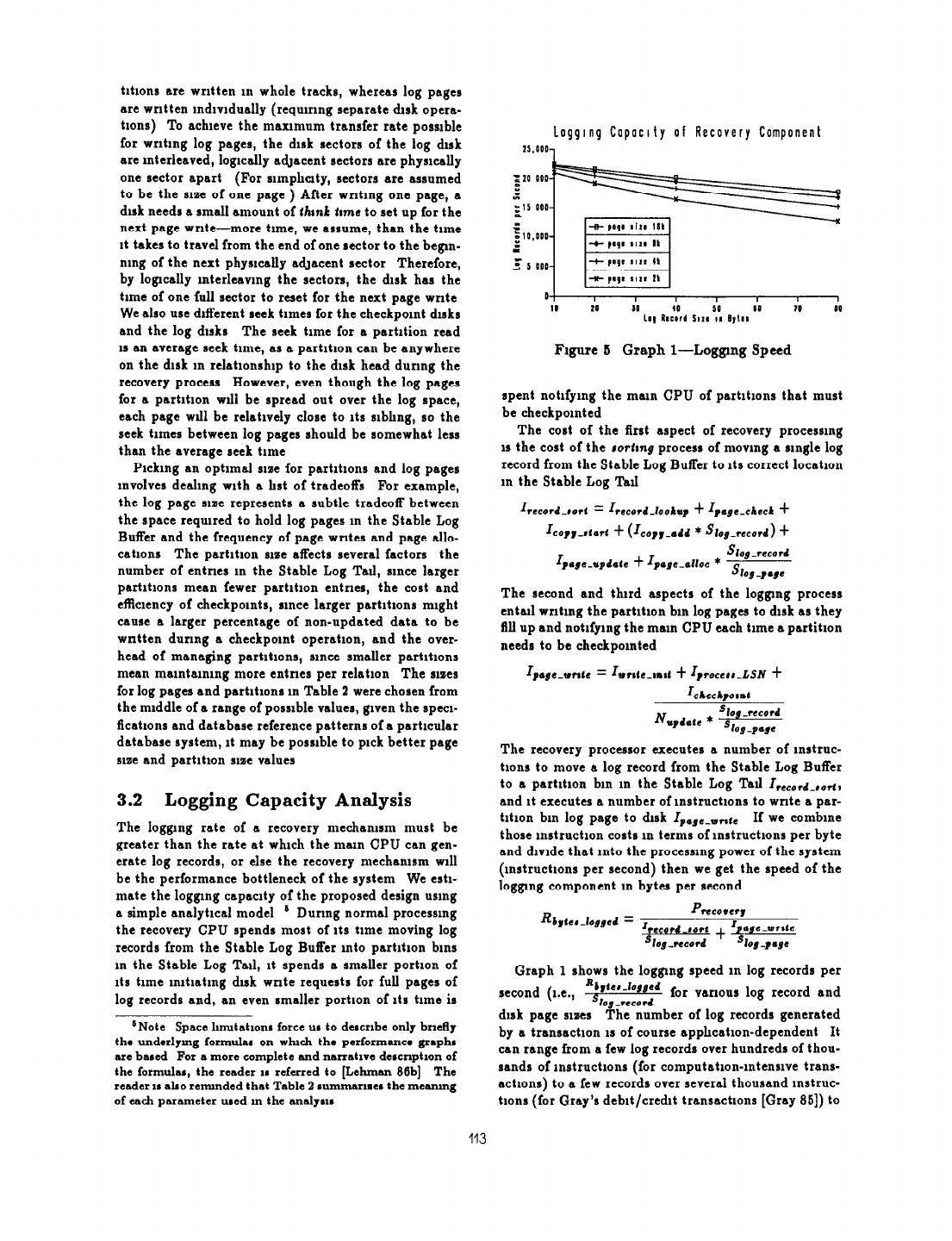 9 . Name Explanatron Value and Umts I recordJookup Read one log record and determme mdex of proper log bm 20 Instructrons / Record I copyAar4 Startup cost of copymg a stnng of bytes 3 Instructrons / Copy I cop, -add Addrtronal cost per byte of copymg a string of bytes 0 125 Instructrons / Byte I wrdc-1nd Cost of rmtlating a disk wnte of a full log bm page 500 Instructions / Page Wrote IpJdl@C Cost of allocating a new log bin page and releasmg the old 100 Instructrons / Page Wnte one Ipage-update Cost of updating the log bm page mformatron 10 Instructrons / Record Ip.pc-ekcck Cost of checking the exrstence of a log brn page 10 Instructrons / Log Record lpvoccrr-LSN Cost of mamtammg the LSN count and checking for pos- 40 Instructrons / Page Wrote sable checkpomts I ckcckpord Cost of srgnalmg the main CPU to start a checkpomt trans- 40 Instructrons / Checkpornt action I record-ror: Total cost of the record sorting process (Calculated) Instructrons / Record Ipp-Wt’it. Total cost of wrrtmg a page from the SLT to the log drsk (Calculated) Instructions / Page Slo,-record Average sme of a log record 24 Bytes / Record Sro* -pep Siae of a log page 8 Kilobytes / Page s peritt1or Siee of a partition 48 Krlobytes / Partrtron N upd& The number of log records that a partltron can accumulate 1000 Log Records / Partition before a checkpomt 1s triggered N~o~-~c~cr Average number of log pages for a partition (Calculated) Log Pages / Partition Rbyic,~~oyps(: Byte rate of the loggng component (Calculated) Bytes / Second R~c,&,-~Osscd Record rate of the loggmg component (Calculated) Log Records / Second Rckcckpod Frequency of checkpomts (Calculated) Checkpomts / Second Preeo+cry MIPS power of the recovery CPU 1 0 M&on Instructrons / Second Table 2 Parameter Deacrrptrons checkpoint transactions IS calculated for various log- complexrty of making It stable and &able ’ gng rates, and the overhead imposed by checkpointmg Instructron counts per operatron are estimated (this transactions 1s calculated as a percentage of the total recovery scheme has not yet been Implemented) and number of transactrons that are running Fmally, the overheads produced by procedure calls, process swrtch- process of post-crash recovery IS outlmed for an mdlvrd- mg and operatmg system mteractron have been some- ual partrtron and performance issues are discussed, and what accounted for by padding the instructron counts then the performance advantage of partrtron-level re- for the operatrons Complrcated microcoded rnstruc- covery is demonstrated by comparing rt with database- trons such as the block move rnstructron are represented level recovery as multrple mstructrons A gencrsc mstructron executed on the recovery processor 1s assumed to execute m one microsecond and a memory reference IS assumed to ex- 3.1 Logging, Checkpointing, and ecute m about one rmcrosecond The reader should Recovery Parameters keep m nund that the mstructron count numbers ap- pear smaller than normal system numbers The recov- Before we begm the analysrs, we introduce the param- ery component IS highly specrahaed and requires only eters that wrll be used throughout this section Table 1 a minrmal operating system, and rt has sole control of grves the conventrons that we use for the names of the the log disks when they are actrvely recervrng log infor- parameters, and Table 2 hsts each parameter of interest matron (The recovery component releases control of along with rts meamng, value (determined as described a log disk when that disk IS transferred to the archive below), and units component to role the contents of the disk onto tape ) The environment used to generate these figures 1s The disk parameters rn Table 2 are based on a two- based on a mrdsmed mainframe with a 6 MIP uniproces- head per surface high-performance disk drive It uses sor for the mam CPU and a smaller 1 MIP umprocessor two read/write heads per surface, so rt has relatively for the recovery CPU ’ The stable r&able memory for low seek times The transfer rate for a track of data the recovery CPU 1s composed of the faster mamframe IS double the transfer rate for mdrvrdual pages, par- memory chrps, but rt 1s four times slower due to the ‘The cost and performance figurer of thts stable memory ‘The speed of the mam CPU 1s not used m any of the are proJected from current technology Ths memory II not cslculatronr presented here, but we mention It to put the available today, but WC b&eve It WIU be widely ardable reader m the proper frame of mmd w&in the next decade 112