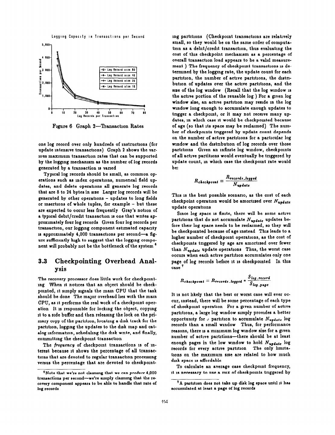 11 . Loqglng Capaclly III TransactIons per Second mg partrtrons (Checkpomt transactrons are relatively small, so they would be on the same order of computa- tion as a debit/credit transactron, thus evaluatrng the cost of this checkpoint mechamsm as a percentage of overall transactron load appears to be a valid measure- ment ) The frequency of checkpomt transactrons 1s de- -S- Loq Record termined by the logging rate, the update count for each + Lmq Record + L,q Rorrrd nizn 20 partrtron, the number of active partrtrons, the drstrr- +I- L,q Record butron of updates over the active partrtrons, and the size of the log window (Recall that the log window 1s the active portion of the reusable log ) For a pven log window size, an active partrtron may reside m the log window long enough to accumulate enough updates to tngger a checkpornt, or it may not receive many up- dates, m whrch case rt would be checkpomted because Fqure 6 Graph 2-Transactron Rates of age (so that Its space may be reclaimed) The num- ber of checkpomts triggered by update count depends on the number of active partrtrons for a particular log one log record over only hundreds of rnstructrons (for window and the drstrrbutron of log records over those update mtensrve transsctrons) Graph 2 shows the var- partrtrons Given an rnilmte log window, checkpomts IOUSmaxrmum transactron rates that can be supported of all active partitrons would eventually be triggered by by the loggmg mechamsm as the number of log records update count, m which case the checkpomt rate would generated by a transaction IS varred be: Typrcal log records should be small, as common op- R tccovdn-logged erations such as mdex operatrons, numerical field up- R checkpod = N update dates, and delete operatrons all generate log records that are 8 to 24 bytes in size Larger log records will be This 1s the best possrble scenano, as the cost of each generated by other operatrons - updates to long fields checkpoint operation would be amortrzed over Nupdale or msertrons of whole tuples, for example - but these update operatrons are expected to occur less frequently Gray’s notron of Since log space IS finite, there will be some actrve a typmal debrt/credrt transactron 1s one that wrrtes ap- partrtrons that do not accumulate N,,&(e updates be- proxrmately four log records Given four log records per fore their log spaceneeds to be reclarmed, so they wrll transactron, our loggmg component estimated capacrty be checkpornted because of age instead This leads to a IS approxrmately 4,000 transactlone per second-a fig higher number of checkpomt operatrons, as the cost of ure sufflcrently high to suggest that the logging compo- checkpomts tnggered by age are amortrzed over fewer nent will probably not be the bottleneck of the system s than N,+& update operatrons Thus, the worst case occurs when each active partrtron accumulates only one 3.3 Checkpointing Overhead Anal- page of log records before rt 1s checkpornted In thus ysis case 7 The recovery processor does little work for checkpomt- S log-record Rchtxkpotnc = Rrrcordc-loJged * mg When rt notices that an obJect should be check- s log-pap pornted, rt srmply signals the mam CPU that the task should be done The maJor overhead lies with the main It 1s not likely that the best or worst case wrll ever oc- CPU, as it performs the real work of a checkpornt oper- cur, instead, there wrll be some percentage of each type ation It 1s responsrble for locking the obJect, copying of checkpomt operatron For a grven number of actrve rt to a side buffer and then releasing the lock on the pri- partrtrons, a large log window srmply provrdes a better mary copy of the partrtron, locating a disk track for the opportunity for ti partition to accumulate N,,z,jcle log partrtron, logging the updates to the disk map and cat- records than a small wrndow Thus, for performance alog mformatron, schedulmg the drsk write, and finally, reasons, there IS a mmrmum log window size for a given commrttmg the checkpomt transactron number of active partitions-there should be at least The frequency of checkpornt transactions IS of m- enough pages in the low window to hold NSpd,,(e log records for every active partrtron The only lrmrta- terest because rt shows the percentage of all transac- trons that are devoted to regular transactron processmg trons on the maxrmum srae are related to how much versus the percentage that are devoted to checkpomt- disk space IS affordable To calculate an average case checkpomt frequency, eNote that we’re not clamung that we cm produce 4,000 rt 1s necessary to use a nux of checkpomts trrggered by transactions per second- we’re sunply clslrmng that the re- covery component sppcars to be able to handle that rate of 7A partrtlon does not take up disk log space until It has log records accumulated at least a page of log records 114