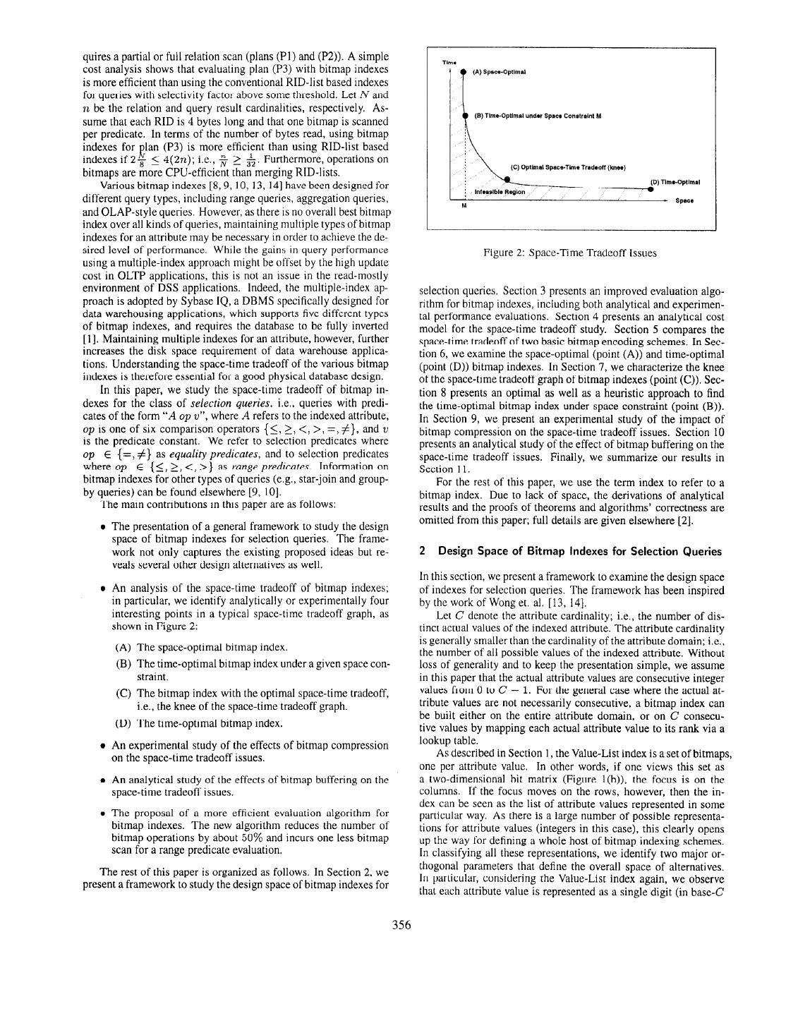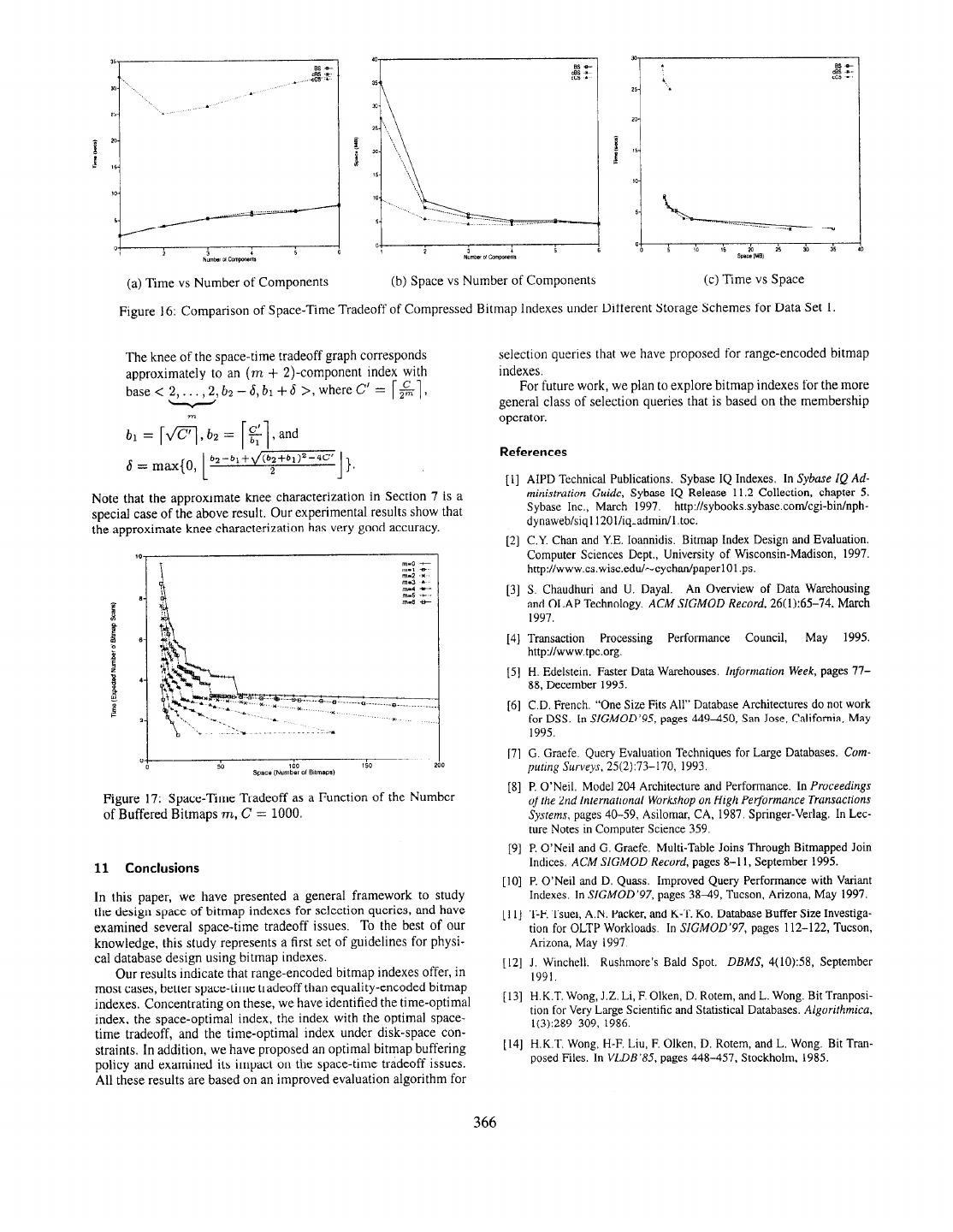 12 . (a) Time vs Number of Components (b) Space vs Number of Components (c) Time vs Space Figure 16: Comparison of Space-Time Tradeoff of Compressed Bitmap Indexes under Different Storage Schemes for Data Set 1. The knee of the space-time tradeoff graph corresponds selection queries that we have proposed for range-encoded bitmap approximately to an (m + 2)-component index with indexes. base<2 ,..., 2,bs--J,bi+S>,whereC’= [$I, For future work, we plan to explore bitmap indexes for the more general class of selection queries that is based on the membership operator. , bz-bl+ (bz+b1)2-4C’ References 6 = max{O, 2 1, [I] AIPD Technical Publications. SybaseIQ Indexes. In Sybuse IQ Ad- Note that the approximate knee characterization in Section 7 is a ministration Guide, Sybase IQ Release 11.2 Collection, chapter 5. special case of the above result. Our experimental results show that Sybase Inc., March 1997. http://sybooks.sybase.com/cgi-bin/nph- dynaweb/siql120l/iq~admin/l.toc. the approximate knee characterization has very good accuracy. [2] C.Y. Chan and Y.E. Ioannidis. Bitmap Index Design and Evaluation. Computer SciencesDept., University of Wisconsin-Madison, 1997. http:Nwww.cs.wisc.edu/~cychan/paperl0l.ps. [3] S. Chaudhuri and U. Dayal. An Overview of Data Warehousing and OLAP Technology. ACM SlGMOD Record, 26( 1):65-74, March 1997. [4] Transaction Processing Performance Council, May 1995. http://www.tpc.org. [5] H. Edelstein. FasterData Warehouses,information Week, pages77- 88, December 1995. [6] C.D. French. “One Size Fits All” DatabaseArchitecturesdo not work for DSS. In SfGMOD’95, pages449-450, San Jose,California, May 1995. [7] G. Graefe. Query Evaluation Techniquesfor Large Databases.Com- puting Surveys, 25(2):73-170, 1993. [8] P.O’Neil. Model 204 Architecture and Performance.In Proceedings Figure 17: Space-Time Tradeoff as a Function of the Number of the 2nd lnlernarional Workshop on High Performance Transactions of Buffered Bitmaps m, C = 1000. Systems, pages40-59, Asilomar, CA, 1987.Springer-Verlag. In Lec- ture Notes in ComputerScience359. [9] P.O’Neil and G. Graefe. Multi-Table Joins Through Bitmapped Join 11 Conclusions Indices. ACM SIGMOD Record, pages8-l 1, September1995. [lo] P. O’Neil and D. Quass. Improved Query Performancewith Variant In this paper, we have presented a general framework to study Indexes. In SlGMOD’97, pages38849,Tucson,Arizona, May 1997. the design space of bitmap indexes for selection queries, and have [ 1l] T-E Tsuei, A.N. Packer,and K-T. Ko. DatabaseBuffer Size Investiga- examined several space-time tradeoff issues. To the best of our tion for OLTP Workloads. In SIGMOD’97, pages 112-122, Tucson, knowledge, this study represents a first set of guidelines for physi- Arizona, May 1997. cal database design using bitmap indexes. [12] J. Winchell. Rushmore’sBald Spot, DBMS, 4(10):58, September Our results indicate that range-encoded bitmap indexes offer, in 1991. most cases, better space-time tradeoff than equality-encoded bitmap indexes. Concentrating on these, we have identified the time-optimal [ 131 H.K.T. Wong,J.Z. Li, F. Olken, D. Rotem,and L. Wong. Bit Tranposi- tion for Very Large Scientific and Statistical Databases.Algarithmica, index, the space-optimal index, the index with the optimal space- 1(3):289-309,1986. time tradeoff, and the time-optimal index under disk-space con- straints. In addition, we have proposed an optimal bitmap buffering [14] H.K.T. Wong, H-F. Liu, F. Olken, D. Rotem, and L. Wong. Bit Tran- policy and examined its impact on the space-time tradeoff issues, posedFiles. In VLDE’85, pages448-457, Stockholm, 1985. All these results are based on an improved evaluation algorithm for 366