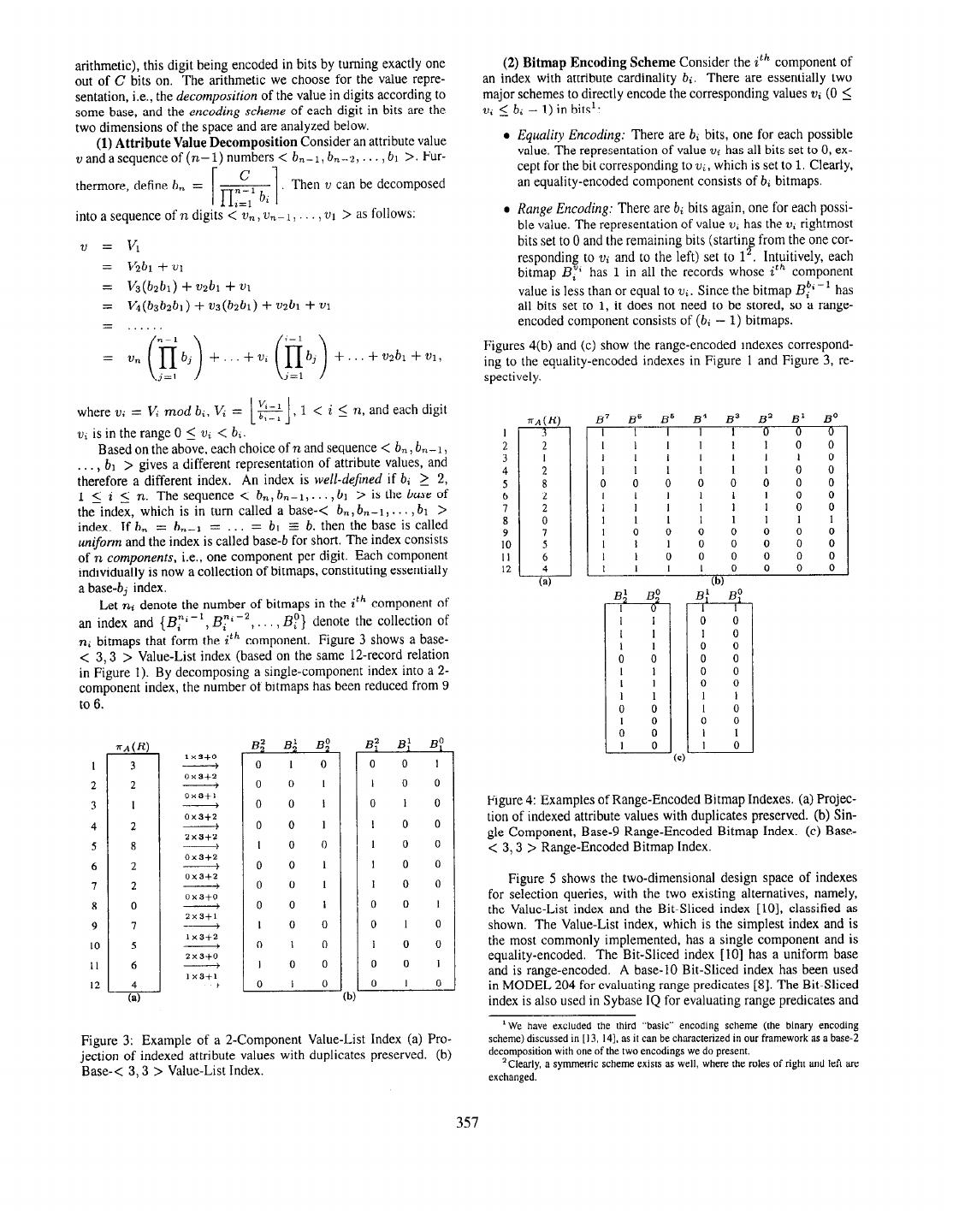 3 .arithmetic), this digit being encoded in bits by turning exactly one (2) Bitmap Encoding Scheme Consider the ith component of out of C bits on. The arithmetic we choose for the value repre- an index with attribute cardinality bi. There are essentially two sentation, i.e., the decomposition of the value in digits according to major schemes to directly encode the corresponding values v; (0 5 some base, and the encoding scheme of each digit in bits are the 5 bi - 1) in bits’: two dimensions of the space and are analyzed below. (1) Attribute Value Decomposition Consider an attribute value l Equality Encoding: There are bi bits, one for each possible vandasequenceof(n-l)numbers< b,-l,b,-2, . . ..bl >. Fur- value. The representation of value ‘ui has all bits set to 0, ex- cept for the bit corresponding to v;, which is set to 1. Clearly, thermore, define b, = an equality-encoded component consists of bi bitmaps. l Range Encoding: There are b; bits again, one for each possi- =Vl ?J = fib1 fvl ble value. The representation of value U; has the vi rightmost bits set to 0 and the remaining bits (starting from the one cor- responding to o; and to the left) set to 1 Intuitively, each bitmap ByI has 1 in all the records whose ith component = &(bzbl) + vzbl + v~ value is less than or equal to ‘ui. Since the bitmap Bf’-’ has = K(bxbzbl) + vs(bzbl) + vzbl + vl all bits set to 1, it does not need to be stored, so a range- = encoded component consists of (bi - 1) bitmaps. /n-l \ /z-l \ Figures 4(b) and (c) show the range-encoded indexes correspond- = w, (Ebj) +...+v, (gb3) +...+vzbl+vl, ing to the equality-encoded indexes in Figure 1 and Figure 3, re- spectively. where v; = V; mod bi, V; = 2 , 1 < i 5 n, and each digit L 1 ~a(@ 8’ B6 B5 B4 B3 8’ B’ B” vz is in the range 0 5 wi < b,. I I 1 I I 1 0 0 0 Based on the above, each choice of n and sequence < b,, b,-1 , 2 I I I I I I 0 0 3 1 I I I I I 1 0 bl > gives a different representation of attribute values, and 4 I I I I I I 0 0 the;efore a different index. An index is well-dejned if bi 2 2, 5 0 0 0 0 0 0 0 0 1 <i <TX. Thesequence< b,,b,-l,...,bl >isthebaseof 6 I I 1 I 1 I 0 0 the-index, which is in turn called a base-< b,, b,,-1, . . . , bl > 7 I 1 I I 1 I 0 0 index, If b, = b,-1 = = bl z b, then the base is called 8 1 I I I I I 1 I 9 I 0 0 0 0 0 0 0 uniform and the index is called base-b for short. The index consists IO I I I 0 0 0 0 0 of n components, i.e., one component per digit. Each component II I 1 0 0 0 0 0 0 individually is now a collection of bitmaps, constituting essentially 12 I I I I 0 0 0 0 a base-bj index. (b) Let ni denote the number of bitmaps in the ith component of an index and {B” - ‘, BrZ -‘, . , BP} denote the collection of ni bitmaps that form the ith component. Figure 3 shows a base- < 3,3 > Value-List index (based on the same 12-record relation in Figure 1). By decomposing a single-component index into a 2- component index. the number of bitmaps has been reduced from 9 to 6. na(R) B; B; B!j Bf B; By 1x3+0 I 3 - 0 I 0 0 0 I 0X3+2 2 2 - 0 0 I I 0 0 0x3+1 3 I - 0 0 I 0 I 0 Figure 4: Examples of Range-Encoded Bitmap Indexes. (a) Projec- 0x3+2 tion of indexed attribute values with duplicates preserved. (b) Sin- 4 2 - 0 0 I I 0 0 2x3+2 gle Component, Base-9 Range-Encoded Bitmap Index. (c) Base- 5 8 I 0 0 I 0 0 < 3,3 > Range-Encoded Bitmap Index. 0x3+2 6 2 - 0 0 I I 0 0 0x3+2 7 2 - 0 0 I I 0 0 Figure 5 shows the two-dimensional design space of indexes 0x3+0 for selection queries, with the two existing alternatives, namely, 8 0 - 0 0 I 0 0 I 2x3+1 the Value-List index and the Bit-Sliced index [lo], classified as 9 I I 0 0 0 I 0 shown, The Value-List index, which is the simplest index and is 1.X3+2 IO 5 - 0 I 0 I 0 0 the most commonly implemented, has a single component and is 2x3+0 equality-encoded. The Bit-Sliced index [lo] has a uniform base II 6 I 0 0 0 0 1 1x3+1 and is range-encoded. A base-10 Bit-Sliced index has been used 12 0 I 0 0 I 0 in MODEL 204 for evaluating range predicates [8]. The Bit-Sliced index is also used in Sybase IQ for evaluating range predicates and 1 We have excluded the third “basic” encoding scheme (the binary encoding Figure 3: Example of a 2-Component Value-List Index (a) Pro- scheme) discussed in [13, 141, as it can be characterized in our framework asa base-2 jection of indexed attribute values with duplicates preserved. (b) decomposition with one of the two encodings we do present. ‘Clearly, a symmetric scheme exists as well, where the roles of right and left are Base-< 3,3 > Value-List Index. exchanged. 357