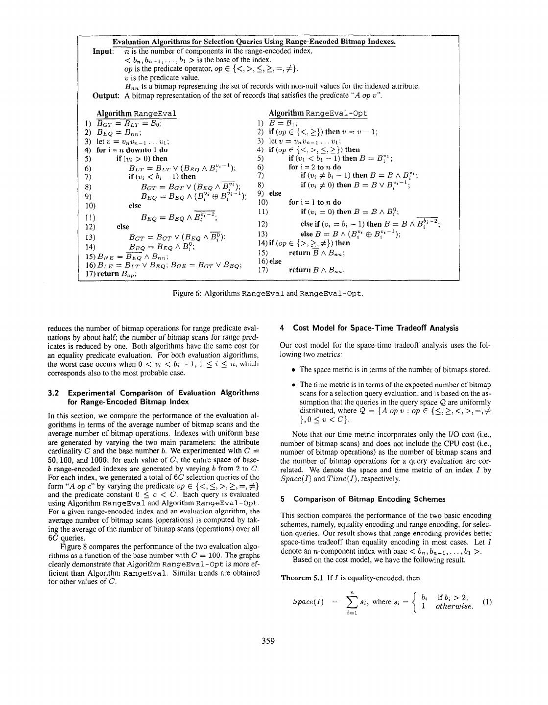 5 . Evaluation Algorithms for Selection Queries Using Range-Encoded Bitmap Indexes. Input: n is the number of components in the range-encoded index. <bn,bn-I,..., bl > is the base of the index. op is the predicate operator, op E {<, >, <,>, =, #}. II is the predicate value. B,, is a bitmap representing the set of records with non-null values for the indexed attribute. Output: A bitmap representation of the set of records that satisfies the predicate “A op v”. Algorithm RangeEval Algorithm RangeEval -Opt I) BGT = BLT = 80; 1) B=B,, 2) BEQ = B,,; 2) if(opE{<,>})thenv=v-1; 3) letv=v,v,-l...vt; 3) let v = 1)~2)~-1 .211; 4) for i = R.downto 1 do 4) if(opE {<,>,<,>})then 5) if (v, > 0) then 5) if (VI < bl - 1) then B = By’ ; BL~ = BLT v (BEG A B;‘-‘); 6) for i = 2 to 71do I;; if (w, < b, - 1) then 7) if (v; # bi - 1) then B = B A By’; 8) BGT = BGT V (BEQ A B1y’); 8) if(ui#O)thenB=BVBY*-‘; BEQ = BEQ A (By’ $ BF’-l); 9) else 9) else 10) for i = 1 to n do 10) 11) if(u;=O)thenB=BABF; 11) BEQ = BEQ A Bf’-‘; 12) else 12) elseif(v;=b;-1)thenB=BAB~‘c2; BGT = BGT V (BEQ A @); 13) elseB=BA(BY’@By’-I); 13) BEQ = BEQ A BP; 14)if(opE {>,>,#})then 14) 15) return % A B,,; 15) BNE = BEQ A B,,; 16) BLE = BLT V BEQ; BGE = BGT V BEQ; 16) else 17) return B,,; 17) return B A B,,,; Figure 6: Algorithms RangeEval and RangeEval-Opt. reduces the number of bitmap operations for range predicate eval- 4 Cost Model for Space-Time Tradeoff Analysis uations by about half; the number of bitmap scans for range pred- icates is reduced by one. Both algorithms have the same cost for Our cost model for the space-time tradeoff analysis uses the fol- an equality predicate evaluation. For both evaluation algorithms, lowing two metrics: the worst case occurs when 0 < w2 < b; - 1, 1 < i 5 n, which corresponds also to the most probable case. l The space metric is in terms of the number of bitmaps stored. l The time metric is in terms of the expected number of bitmap 3.2 Experimental Comparison of Evaluation Algorithms scans for a selection query evaluation, and is based on the as- for Range-Encoded Bitmap Index sumption that the queries in the query space & are uniformly distributed, where Q = {A op IJ : op E (5, 2, <, >, =, # In this section, we compare the performance of the evaluation al- },O 5 w < C}. gorithms in terms of the average number of bitmap scans and the average number of bitmap operations. Indexes with uniform base Note that our time metric incorporates only the I/O cost (i.e., are generated by varying the two main parameters: the attribute number of bitmap scans) and does not include the CPU cost (i.e., cardinality C and the base number b. We experimented with C = number of bitmap operations) as the number of bitmap scans and 50, 100, and 1000; for each value of C, the entire space of base- the number of bitmap operations for a query evaluadon are cor- b range-encoded indexes are generated by varying b from 2 to C. related. We denote the space and time metric of an index I by For each index, we generated a total of 6C selection queries of the Space(l) and Time(l), respectively. form “A op c” by varying the predicate op E { <, 5, >, 2, =, #} and the predicate constant 0 <_ c < C. Each query is evaluated 5 Comparison of Bitmap Encoding Schemes using Algorithm RangeEval and Algorithm RangeEval-Opt. For a given range-encoded index and an evaluation algorithm, the This section compares the performance of the two basic encoding average number of bitmap scans (operations) is computed by tak- schemes, namely, equality encoding and range encoding, for selec- ing the average of the number of bitmap scans (operations) over all tion queries. Our result shows that range encoding provides better 6C queries. space-time tradeoff than equality encoding in most cases. Let I Figure 8 compares the performance of the two evaluation algo- denote an n-component index with base < b,, b,- 1, . . . , bl >. rithms as a function of the base number with C = 100. The graphs Based on the cost model, we have the following result. clearly demonstrate that Algorithm RangeEval-Opt is more ef- ficient than Algorithm RangeEval. Similar trends are obtained for other values of C. Theorem 5.1 If I is equality-encoded, then bi if b; > 2, Space(l) = 25-i, where s; = (1) 1 otherwise. i=l 359