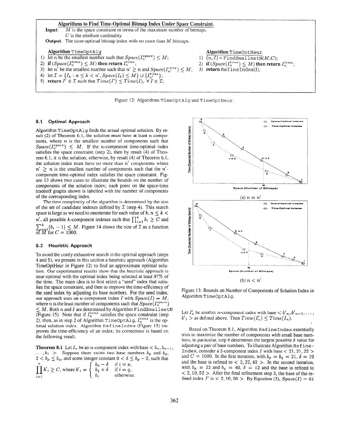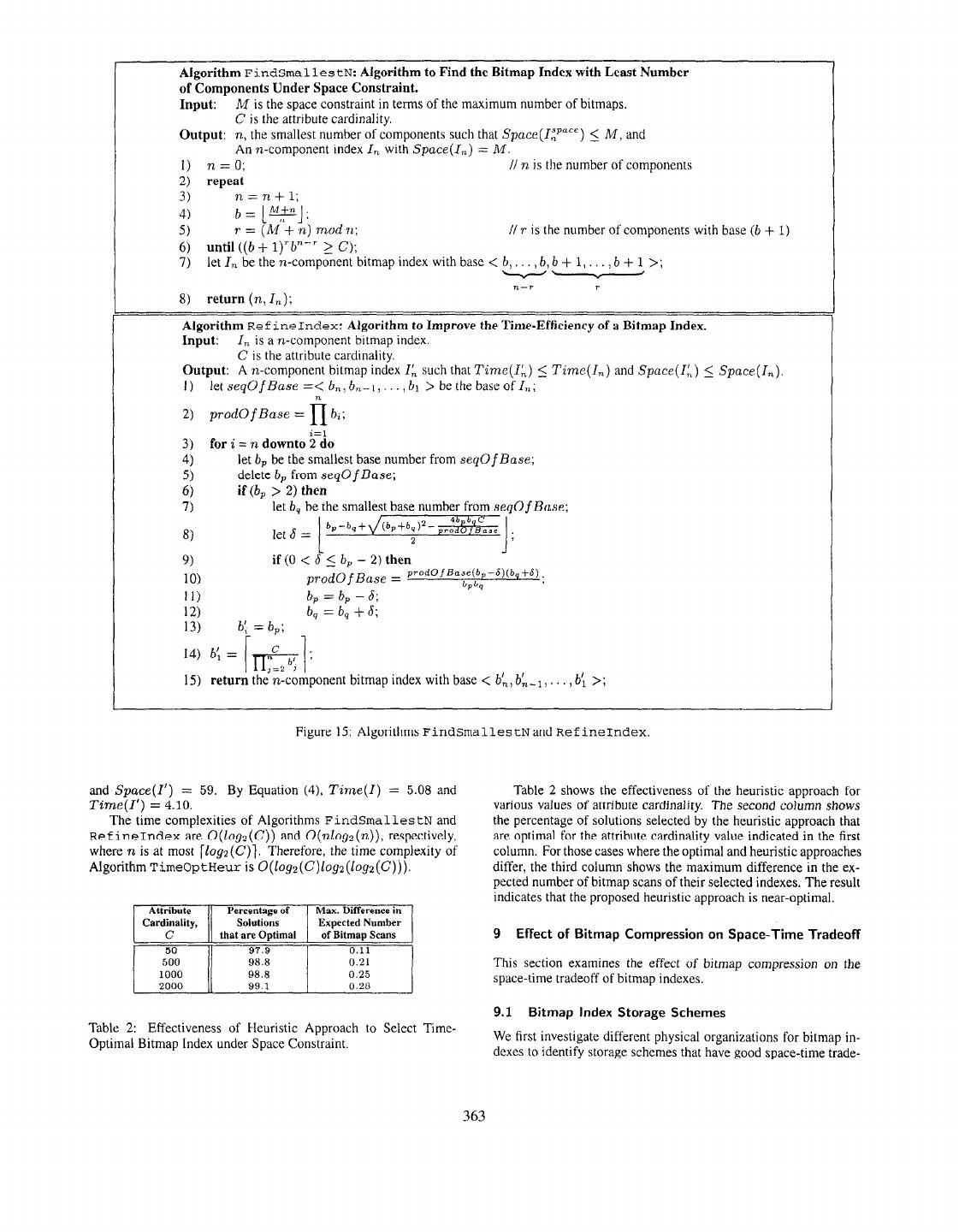 9 . Algorithm FindSmal les tN: Algorithm to Find the Bitmap Index with Least Number of Components Under Space Constraint. 1 Input: M is the space constraint in terms of the maximum number of bitmaps. C is the attribute cardinality. Output: n, the smallest number of components such that Space(l~Pace) < M, and An n-component index I, with Space(I,,) = M. 1) n=o; // n is the number of components 2) repeat 3) n=n+l; 4) b= +j; 5) r= i M+n)modr~; //r is the number of components with base (b + 1) 6) until ((b + l)Tbn-’ > C); 7) let I, be the n-component bitmap index with base < b, . , b, b + 1,. . . , b + 1 >; -- n--r 7 8) return (n, I,); Algorithm Ref ineIndex: Algorithm to Improve the Time-Efficiency of a Bitmap Index. Input: I, is a ,n-component bitmap index. C is the attribute cardinality. Output: A n-component bitmap index IL such that Time 5 Time(I,) and Space(I:,) I: Space(I,). I) letseqOfBase=<b,,b,-I,...,bl >bethebaseofI,; 2) prodOfBase = fi bi; i=l 3) for i = n downto 2 do 4) let b, be the smallest base number from seqOf Base; 5) delete b, from seqOf Base; 6) if (bp > 2) then 7) let b, be the smallest base number from seq0 f Buse; bb b-b,+&,+bd2-p?,#& 8) let 6 = 2 L J1 9) if (0 < 6 5 b, - 2) then 10) prodOfBase = prodOjBasbep~~-6)(b1+6); 11) b, = b, - 6; 12) b, = b, + 6; 13) b’, = b,; 14) b; = 15) return the n-component bitmap index with base < b’,, b’,- 1, . . , b; >; Figure 15: Algorithms FindSmallestN and Ref ineIndex. and Space(I’) = 59. By Equation (4), Time(I) = 5.08 and Table 2 shows the effectiveness of the heuristic approach for Time(l’) = 4.10. various values of attribute cardinality. The second column shows The time complexities of Algorithms FindSmal les tN and the percentage of solutions selected by the heuristic approach that Ref ineIndex are O(log:,(C)) and O(nlogz(n)), respectively, are optimal for the attribute cardinality value indicated in the first where n is at most [logz(C)l. Therefore, the time complexity of column. For those cases where the optimal and heuristic approaches Algorithm TimeOptHeur is o(logz(C)logz(log:!(C))). differ, the third column shows the maximum difference in the ex- pected number of bitmap scans of their selected indexes. The result indicates that the proposed heuristic approach is near-optimal. Max. Difference in Expected Number 9 Effect of Bitmap Compression on Space-Time Tradeoff 50 500 This section examines the effect of bitmap compression on the 1000 space-time tradeoff of bitmap indexes. [_-I 2000 9.1 Bitmap Index Storage Schemes Table 2: Effectiveness of Heuristic Approach to Select Time- We first investigate different physical organizations for bitmap in- Optimal Bitmap Index under Space Constraint. dexes to identify storage schemes that have good space-time trade- 363