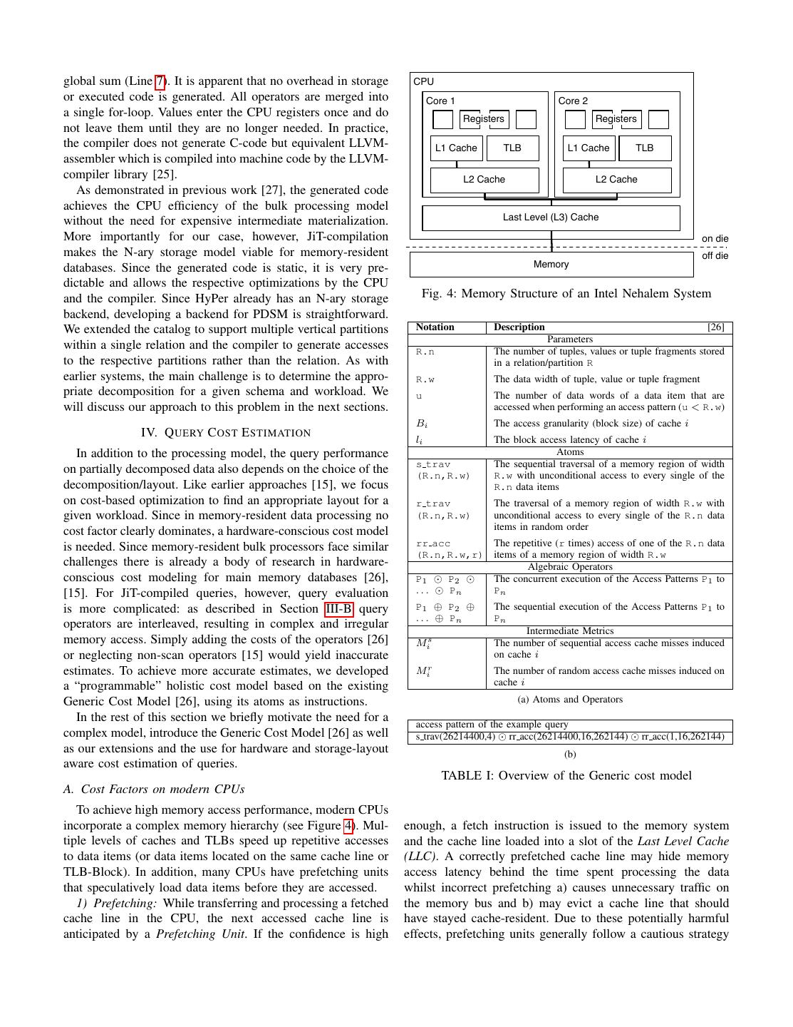 4 .global sum (Line 7). It is apparent that no overhead in storage CPU or executed code is generated. All operators are merged into Core 1 Core 2 a single for-loop. Values enter the CPU registers once and do Registers Registers not leave them until they are no longer needed. In practice, the compiler does not generate C-code but equivalent LLVM- L1 Cache TLB L1 Cache TLB assembler which is compiled into machine code by the LLVM- compiler library [25]. L2 Cache L2 Cache As demonstrated in previous work [27], the generated code achieves the CPU efficiency of the bulk processing model without the need for expensive intermediate materialization. Last Level (L3) Cache More importantly for our case, however, JiT-compilation on die makes the N-ary storage model viable for memory-resident off die databases. Since the generated code is static, it is very pre- Memory dictable and allows the respective optimizations by the CPU and the compiler. Since HyPer already has an N-ary storage Fig. 4: Memory Structure of an Intel Nehalem System backend, developing a backend for PDSM is straightforward. We extended the catalog to support multiple vertical partitions Notation Description [26] Parameters within a single relation and the compiler to generate accesses R.n The number of tuples, values or tuple fragments stored to the respective partitions rather than the relation. As with in a relation/partition R earlier systems, the main challenge is to determine the appro- R.w The data width of tuple, value or tuple fragment priate decomposition for a given schema and workload. We u The number of data words of a data item that are will discuss our approach to this problem in the next sections. accessed when performing an access pattern (u < R.w) Bi The access granularity (block size) of cache i IV. Q UERY C OST E STIMATION li The block access latency of cache i In addition to the processing model, the query performance Atoms s trav The sequential traversal of a memory region of width on partially decomposed data also depends on the choice of the (R.n,R.w) R.w with unconditional access to every single of the decomposition/layout. Like earlier approaches [15], we focus R.n data items on cost-based optimization to find an appropriate layout for a r trav The traversal of a memory region of width R.w with given workload. Since in memory-resident data processing no (R.n,R.w) unconditional access to every single of the R.n data cost factor clearly dominates, a hardware-conscious cost model items in random order is needed. Since memory-resident bulk processors face similar rr acc The repetitive (r times) access of one of the R.n data (R.n,R.w,r) items of a memory region of width R.w challenges there is already a body of research in hardware- Algebraic Operators conscious cost modeling for main memory databases [26], P1 P2 The concurrent execution of the Access Patterns P1 to [15]. For JiT-compiled queries, however, query evaluation ... Pn Pn is more complicated: as described in Section III-B query P1 ⊕ P2 ⊕ The sequential execution of the Access Patterns P1 to . . . ⊕ Pn Pn operators are interleaved, resulting in complex and irregular Intermediate Metrics memory access. Simply adding the costs of the operators [26] Mis The number of sequential access cache misses induced or neglecting non-scan operators [15] would yield inaccurate on cache i estimates. To achieve more accurate estimates, we developed Mir The number of random access cache misses induced on a “programmable” holistic cost model based on the existing cache i Generic Cost Model [26], using its atoms as instructions. (a) Atoms and Operators In the rest of this section we briefly motivate the need for a access pattern of the example query complex model, introduce the Generic Cost Model [26] as well s trav(26214400,4) rr acc(26214400,16,262144) rr acc(1,16,262144) as our extensions and the use for hardware and storage-layout (b) aware cost estimation of queries. TABLE I: Overview of the Generic cost model A. Cost Factors on modern CPUs To achieve high memory access performance, modern CPUs incorporate a complex memory hierarchy (see Figure 4). Mul- enough, a fetch instruction is issued to the memory system tiple levels of caches and TLBs speed up repetitive accesses and the cache line loaded into a slot of the Last Level Cache to data items (or data items located on the same cache line or (LLC). A correctly prefetched cache line may hide memory TLB-Block). In addition, many CPUs have prefetching units access latency behind the time spent processing the data that speculatively load data items before they are accessed. whilst incorrect prefetching a) causes unnecessary traffic on 1) Prefetching: While transferring and processing a fetched the memory bus and b) may evict a cache line that should cache line in the CPU, the next accessed cache line is have stayed cache-resident. Due to these potentially harmful anticipated by a Prefetching Unit. If the confidence is high effects, prefetching units generally follow a cautious strategy
