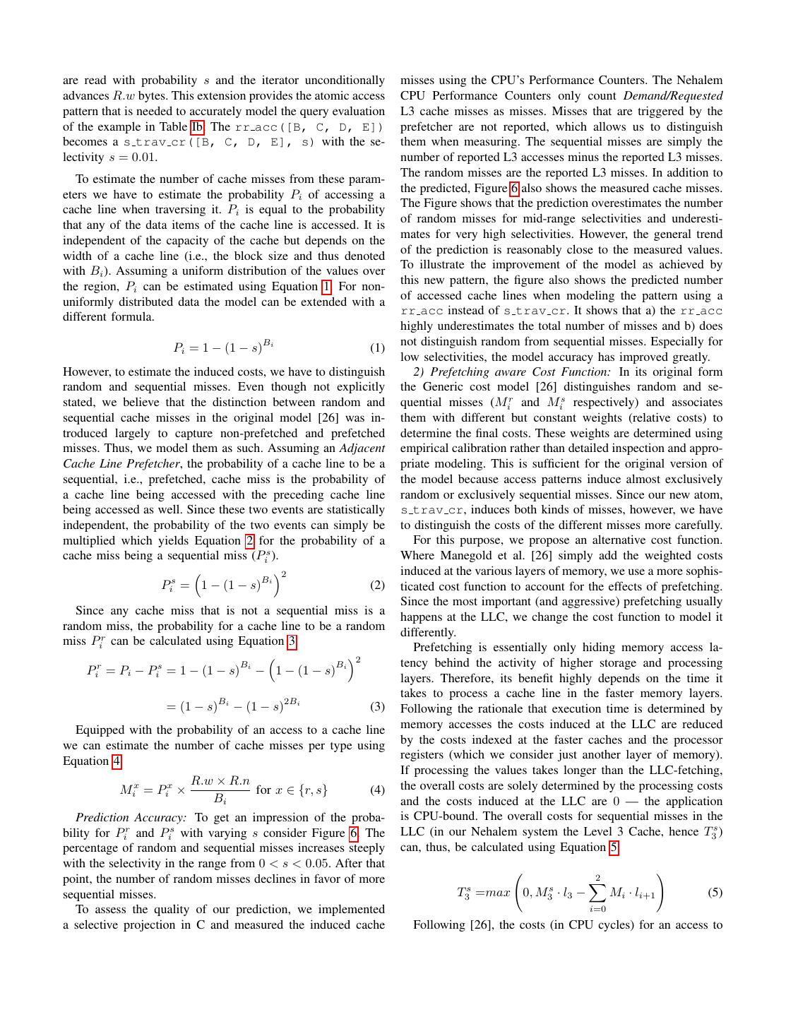 6 .are read with probability s and the iterator unconditionally misses using the CPU’s Performance Counters. The Nehalem advances R.w bytes. This extension provides the atomic access CPU Performance Counters only count Demand/Requested pattern that is needed to accurately model the query evaluation L3 cache misses as misses. Misses that are triggered by the of the example in Table Ib: The rr acc([B, C, D, E]) prefetcher are not reported, which allows us to distinguish becomes a s trav cr([B, C, D, E], s) with the se- them when measuring. The sequential misses are simply the lectivity s = 0.01. number of reported L3 accesses minus the reported L3 misses. To estimate the number of cache misses from these param- The random misses are the reported L3 misses. In addition to eters we have to estimate the probability Pi of accessing a the predicted, Figure 6 also shows the measured cache misses. cache line when traversing it. Pi is equal to the probability The Figure shows that the prediction overestimates the number that any of the data items of the cache line is accessed. It is of random misses for mid-range selectivities and underesti- independent of the capacity of the cache but depends on the mates for very high selectivities. However, the general trend width of a cache line (i.e., the block size and thus denoted of the prediction is reasonably close to the measured values. with Bi ). Assuming a uniform distribution of the values over To illustrate the improvement of the model as achieved by the region, Pi can be estimated using Equation 1. For non- this new pattern, the figure also shows the predicted number uniformly distributed data the model can be extended with a of accessed cache lines when modeling the pattern using a different formula. rr acc instead of s trav cr. It shows that a) the rr acc highly underestimates the total number of misses and b) does Pi = 1 − (1 − s) Bi (1) not distinguish random from sequential misses. Especially for low selectivities, the model accuracy has improved greatly. However, to estimate the induced costs, we have to distinguish 2) Prefetching aware Cost Function: In its original form random and sequential misses. Even though not explicitly the Generic cost model [26] distinguishes random and se- stated, we believe that the distinction between random and quential misses (Mir and Mis respectively) and associates sequential cache misses in the original model [26] was in- them with different but constant weights (relative costs) to troduced largely to capture non-prefetched and prefetched determine the final costs. These weights are determined using misses. Thus, we model them as such. Assuming an Adjacent empirical calibration rather than detailed inspection and appro- Cache Line Prefetcher, the probability of a cache line to be a priate modeling. This is sufficient for the original version of sequential, i.e., prefetched, cache miss is the probability of the model because access patterns induce almost exclusively a cache line being accessed with the preceding cache line random or exclusively sequential misses. Since our new atom, being accessed as well. Since these two events are statistically s trav cr, induces both kinds of misses, however, we have independent, the probability of the two events can simply be to distinguish the costs of the different misses more carefully. multiplied which yields Equation 2 for the probability of a For this purpose, we propose an alternative cost function. cache miss being a sequential miss (Pis ). Where Manegold et al. [26] simply add the weighted costs 2 induced at the various layers of memory, we use a more sophis- Bi Pis = 1 − (1 − s) (2) ticated cost function to account for the effects of prefetching. Since the most important (and aggressive) prefetching usually Since any cache miss that is not a sequential miss is a happens at the LLC, we change the cost function to model it random miss, the probability for a cache line to be a random differently. miss Pir can be calculated using Equation 3. Prefetching is essentially only hiding memory access la- 2 tency behind the activity of higher storage and processing Bi Bi Pir = Pi − Pis = 1 − (1 − s) − 1 − (1 − s) layers. Therefore, its benefit highly depends on the time it takes to process a cache line in the faster memory layers. Bi 2Bi = (1 − s) − (1 − s) (3) Following the rationale that execution time is determined by Equipped with the probability of an access to a cache line memory accesses the costs induced at the LLC are reduced we can estimate the number of cache misses per type using by the costs indexed at the faster caches and the processor Equation 4. registers (which we consider just another layer of memory). If processing the values takes longer than the LLC-fetching, R.w × R.n the overall costs are solely determined by the processing costs Mix = Pix × for x ∈ {r, s} (4) Bi and the costs induced at the LLC are 0 — the application Prediction Accuracy: To get an impression of the proba- is CPU-bound. The overall costs for sequential misses in the bility for Pir and Pis with varying s consider Figure 6. The LLC (in our Nehalem system the Level 3 Cache, hence T3s ) percentage of random and sequential misses increases steeply can, thus, be calculated using Equation 5. with the selectivity in the range from 0 < s < 0.05. After that point, the number of random misses declines in favor of more 2 sequential misses. T3s =max 0, M3s · l3 − Mi · li+1 (5) To assess the quality of our prediction, we implemented i=0 a selective projection in C and measured the induced cache Following [26], the costs (in CPU cycles) for an access to