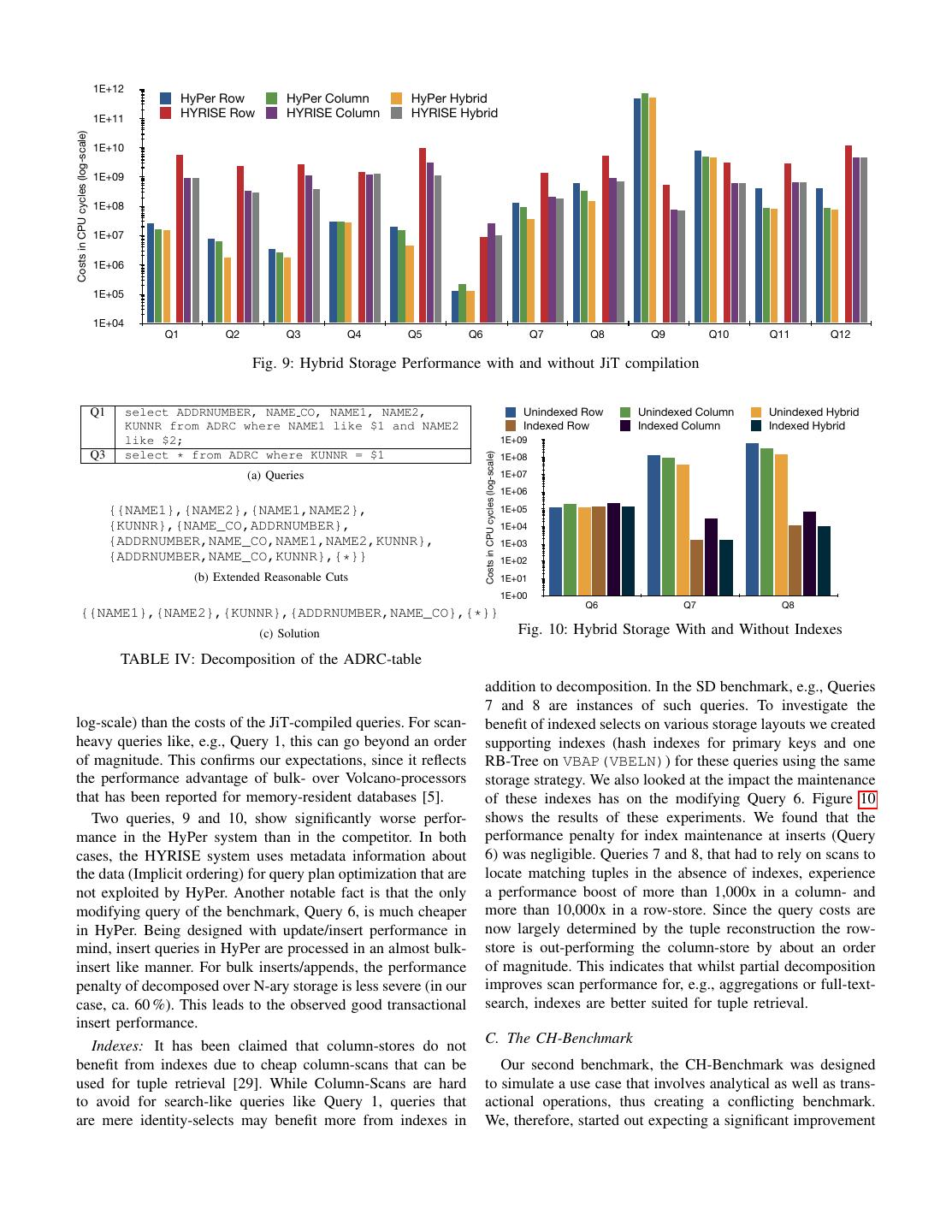 10 . 1E+12 HyPer Row HyPer Column HyPer Hybrid 1E+11 HYRISE Row HYRISE Column HYRISE Hybrid Costs in CPU cycles (log-scale) 1E+10 1E+09 1E+08 1E+07 1E+06 1E+05 1E+04 Q1 Q2 Q3 Q4 Q5 Q6 Q7 Q8 Q9 Q10 Q11 Q12 Fig. 9: Hybrid Storage Performance with and without JiT compilation Q1 select ADDRNUMBER, NAME CO, NAME1, NAME2, Unindexed Row Unindexed Column Unindexed Hybrid KUNNR from ADRC where NAME1 like $1 and NAME2 Indexed Row Indexed Column Indexed Hybrid like $2; 1E+09 Q3 select * from ADRC where KUNNR = $1 1E+08 Costs in CPU cycles (log-scale) (a) Queries 1E+07 1E+06 {{NAME1},{NAME2},{NAME1,NAME2}, 1E+05 {KUNNR},{NAME_CO,ADDRNUMBER}, 1E+04 {ADDRNUMBER,NAME_CO,NAME1,NAME2,KUNNR}, 1E+03 {ADDRNUMBER,NAME_CO,KUNNR},{*}} 1E+02 (b) Extended Reasonable Cuts 1E+01 1E+00 Q6 Q7 Q8 {{NAME1},{NAME2},{KUNNR},{ADDRNUMBER,NAME_CO},{*}} (c) Solution Fig. 10: Hybrid Storage With and Without Indexes TABLE IV: Decomposition of the ADRC-table addition to decomposition. In the SD benchmark, e.g., Queries 7 and 8 are instances of such queries. To investigate the log-scale) than the costs of the JiT-compiled queries. For scan- benefit of indexed selects on various storage layouts we created heavy queries like, e.g., Query 1, this can go beyond an order supporting indexes (hash indexes for primary keys and one of magnitude. This confirms our expectations, since it reflects RB-Tree on VBAP(VBELN)) for these queries using the same the performance advantage of bulk- over Volcano-processors storage strategy. We also looked at the impact the maintenance that has been reported for memory-resident databases [5]. of these indexes has on the modifying Query 6. Figure 10 Two queries, 9 and 10, show significantly worse perfor- shows the results of these experiments. We found that the mance in the HyPer system than in the competitor. In both performance penalty for index maintenance at inserts (Query cases, the HYRISE system uses metadata information about 6) was negligible. Queries 7 and 8, that had to rely on scans to the data (Implicit ordering) for query plan optimization that are locate matching tuples in the absence of indexes, experience not exploited by HyPer. Another notable fact is that the only a performance boost of more than 1,000x in a column- and modifying query of the benchmark, Query 6, is much cheaper more than 10,000x in a row-store. Since the query costs are in HyPer. Being designed with update/insert performance in now largely determined by the tuple reconstruction the row- mind, insert queries in HyPer are processed in an almost bulk- store is out-performing the column-store by about an order insert like manner. For bulk inserts/appends, the performance of magnitude. This indicates that whilst partial decomposition penalty of decomposed over N-ary storage is less severe (in our improves scan performance for, e.g., aggregations or full-text- case, ca. 60 %). This leads to the observed good transactional search, indexes are better suited for tuple retrieval. insert performance. Indexes: It has been claimed that column-stores do not C. The CH-Benchmark benefit from indexes due to cheap column-scans that can be Our second benchmark, the CH-Benchmark was designed used for tuple retrieval [29]. While Column-Scans are hard to simulate a use case that involves analytical as well as trans- to avoid for search-like queries like Query 1, queries that actional operations, thus creating a conflicting benchmark. are mere identity-selects may benefit more from indexes in We, therefore, started out expecting a significant improvement