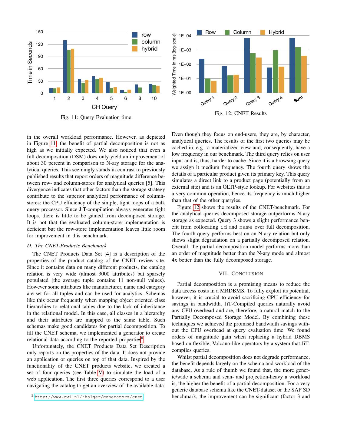 11 . 150 Row Column Hybrid row 1E+04 Weighted Time in ms (log-scale) 120 column Time in Seconds hybrid 1E+03 90 1E+02 60 1E+01 30 0 1E+00 1 2 3 4 5 6 8 10 1 2 3 4 m ery ery ery ery Su Qu Qu Qu Qu CH Query Fig. 12: CNET Results Fig. 11: Query Evaluation time in the overall workload performance. However, as depicted Even though they focus on end-users, they are, by character, in Figure 11, the benefit of partial decomposition is not as analytical queries. The results of the first two queries may be high as we initially expected. We also noticed that even a cached in, e.g., a materialized view and, consequently, have a full decomposition (DSM) does only yield an improvement of low frequency in our benchmark. The third query relies on user about 30 percent in comparison to N-ary storage for the ana- input and is, thus, harder to cache. Since it is a browsing query lytical queries. This seemingly stands in contrast to previously we assign it medium frequency. The fourth query shows the published results that report orders of magnitude difference be- details of a particular product given its primary key. This query tween row- and column-stores for analytical queries [5]. This simulates a direct link to a product page (potentially from an divergence indicates that other factors than the storage strategy external site) and is an OLTP-style lookup. For websites this is contribute to the superior analytical performance of column- a very common operation, hence its frequency is much higher stores: the CPU efficiency of the simple, tight loops of a bulk than that of the other queryies. query processor. Since JiT-compilation always generates tight Figure 12 shows the results of the CNET-benchmark. For loops, there is little to be gained from decomposed storage. the analytical queries decomposed storage outperforms N-ary It is not that the evaluated column-store implementation is storage as expected. Query 3 shows a slight performance ben- deficient but the row-store implementation leaves little room efit from collocating id and name over full decomposition. for improvement in this benchmark. The fourth query performs best on an N-ary relation but only shows slight degradation on a partially decomposed relation. D. The CNET-Products Benchmark Overall, the partial decomposition model performs more than The CNET Products Data Set [4] is a description of the an order of magnitude better than the N-ary mode and almost properties of the product catalog of the CNET review site. 4x better than the fully decomposed storage. Since it contains data on many different products, the catalog relation is very wide (almost 3000 attributes) but sparsely VII. C ONCLUSION populated (the average tuple contains 11 non-null values). However some attributes like manufacturer, name and category Partial decomposition is a promising means to reduce the are set for all tuples and can be used for analytics. Schemas data access costs in a MRDBMS. To fully exploit its potential, like this occur frequently when mapping object oriented class however, it is crucial to avoid sacrificing CPU efficiency for hierarchies to relational tables due to the lack of inheritance savings in bandwidth. JiT-Compiled queries naturally avoid in the relational model. In this case, all classes in a hierarchy any CPU-overhead and are, therefore, a natural match to the and their attributes are mapped to the same table. Such Partially Decomposed Storage Model. By combining these schemas make good candidates for partial decomposition. To techniques we achieved the promised bandwidth savings with- fill the CNET schema, we implemented a generator to create out the CPU overhead at query evaluation time. We found relational data according to the reported properties8 . orders of magnitude gain when replacing a hybrid DBMS Unfortunately, the CNET Products Data Set Description based on flexible, Volcano-like operators by a system that JiT- only reports on the properties of the data. It does not provide compiles queries. an application or queries on top of that data. Inspired by the Whilst partial decomposition does not degrade performance, functionality of the CNET products website, we created a the benefit depends largely on the schema and workload of the set of four queries (see Table V) to simulate the load of a database. As a rule of thumb we found that, the more gener- web application. The first three queries correspond to a user ic/wide a schema and scan- and projection-heavy a workload navigating the catalog to get an overview of the available data. is, the higher the benefit of a partial decomposition. For a very generic database schema like the CNET-dataset or the SAP SD 8 http://www.cwi.nl/˜holger/generators/cnet benchmark, the improvement can be significant (factor 3 and