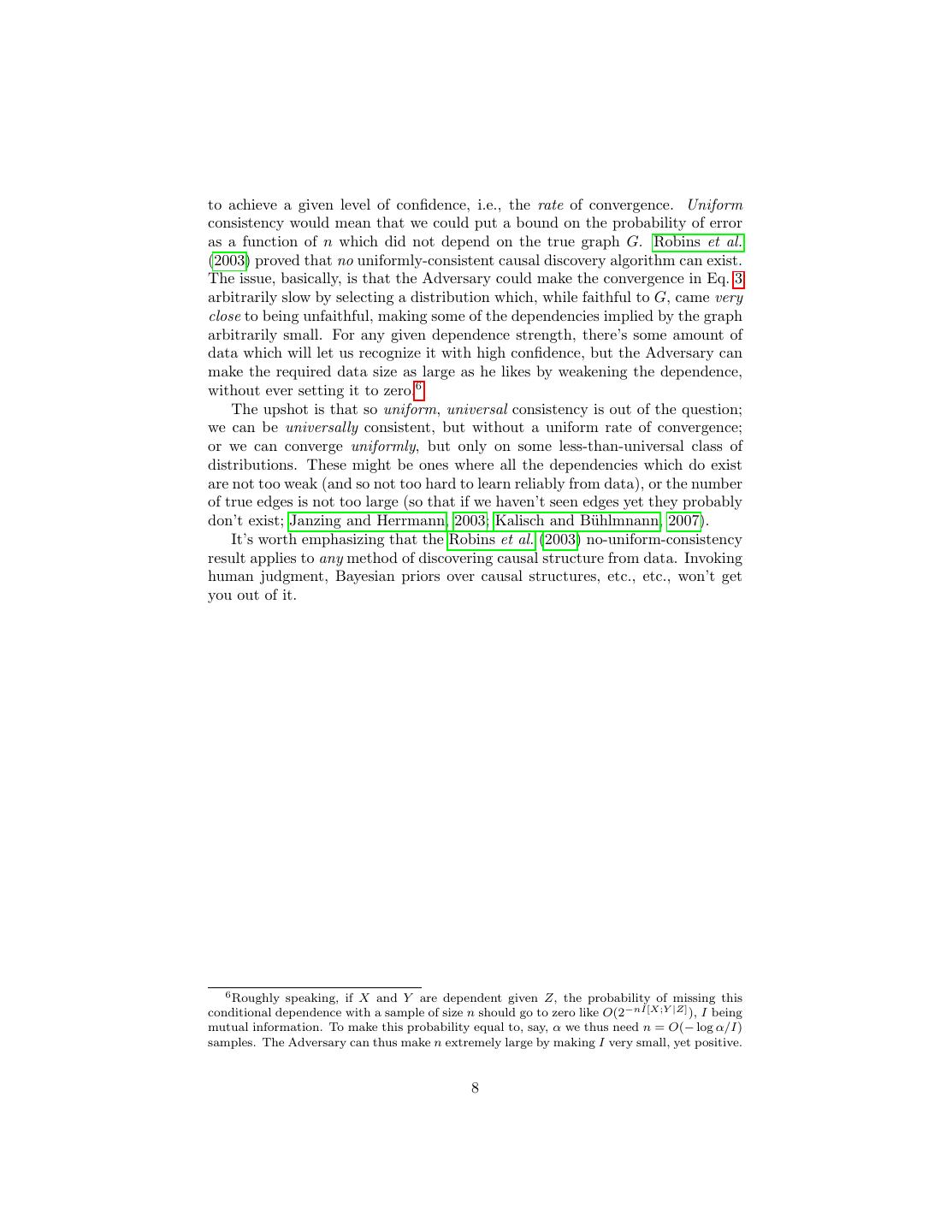 8 .to achieve a given level of confidence, i.e., the rate of convergence. Uniform consistency would mean that we could put a bound on the probability of error as a function of n which did not depend on the true graph G. Robins et al. (2003) proved that no uniformly-consistent causal discovery algorithm can exist. The issue, basically, is that the Adversary could make the convergence in Eq. 3 arbitrarily slow by selecting a distribution which, while faithful to G, came very close to being unfaithful, making some of the dependencies implied by the graph arbitrarily small. For any given dependence strength, there’s some amount of data which will let us recognize it with high confidence, but the Adversary can make the required data size as large as he likes by weakening the dependence, without ever setting it to zero.6 The upshot is that so uniform, universal consistency is out of the question; we can be universally consistent, but without a uniform rate of convergence; or we can converge uniformly, but only on some less-than-universal class of distributions. These might be ones where all the dependencies which do exist are not too weak (and so not too hard to learn reliably from data), or the number of true edges is not too large (so that if we haven’t seen edges yet they probably don’t exist; Janzing and Herrmann, 2003; Kalisch and B¨ uhlmnann, 2007). It’s worth emphasizing that the Robins et al. (2003) no-uniform-consistency result applies to any method of discovering causal structure from data. Invoking human judgment, Bayesian priors over causal structures, etc., etc., won’t get you out of it. 6 Roughly speaking, if X and Y are dependent given Z, the probability of missing this conditional dependence with a sample of size n should go to zero like O(2−nI[X;Y |Z] ), I being mutual information. To make this probability equal to, say, α we thus need n = O(− log α/I) samples. The Adversary can thus make n extremely large by making I very small, yet positive. 8