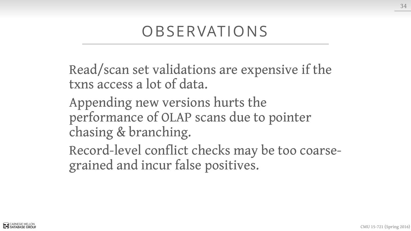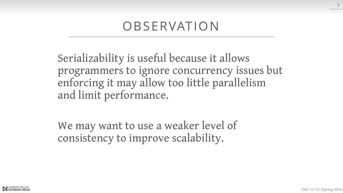 3 . 3 O B S E R VAT I O N Serializability is useful because it allows programmers to ignore concurrency issues but enforcing it may allow too little parallelism and limit performance. We may want to use a weaker level of consistency to improve scalability. CMU 15-721 (Spring 2016)