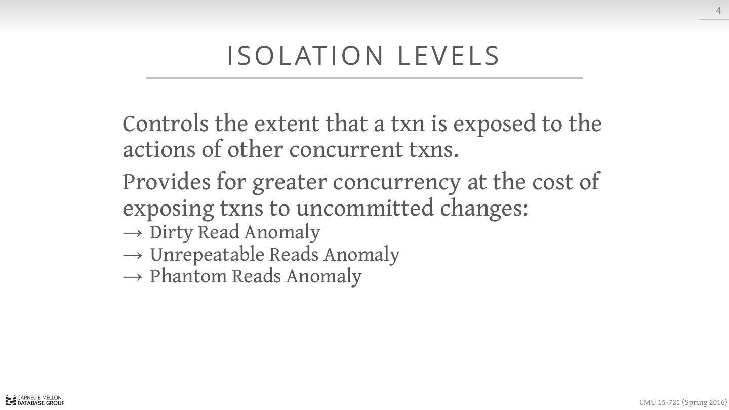 4 . 4 I S O L AT I O N L E V E L S Controls the extent that a txn is exposed to the actions of other concurrent txns. Provides for greater concurrency at the cost of exposing txns to uncommitted changes: → Dirty Read Anomaly → Unrepeatable Reads Anomaly → Phantom Reads Anomaly CMU 15-721 (Spring 2016)