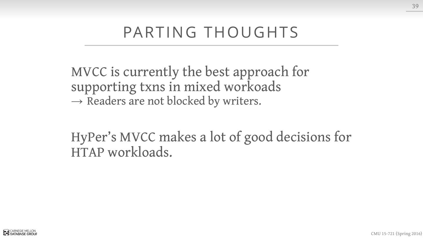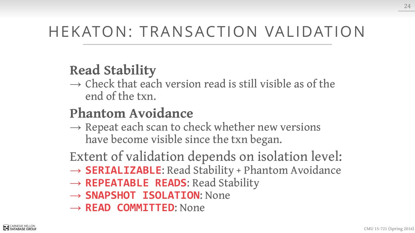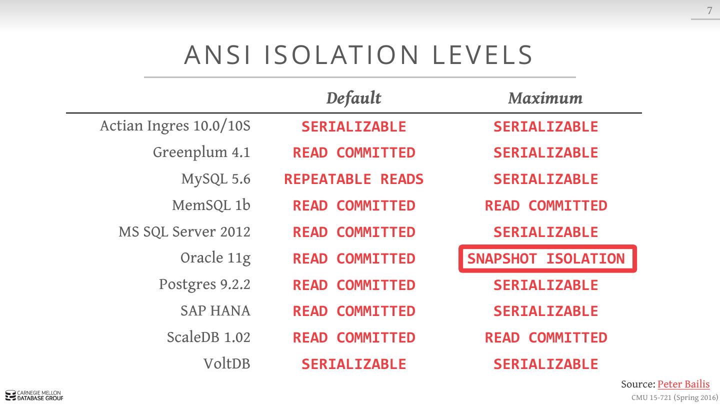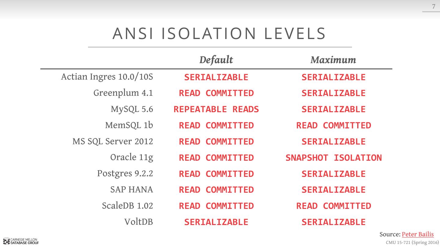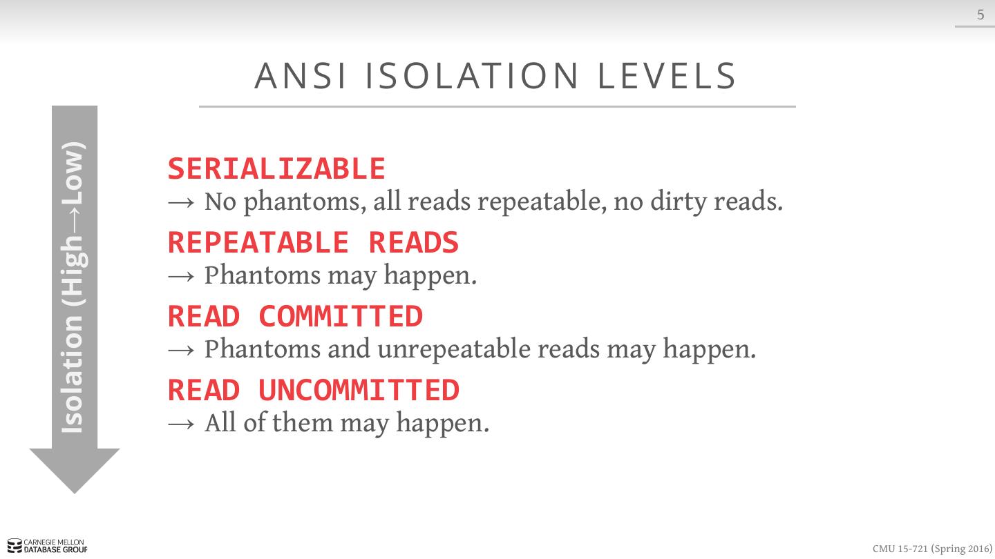 5 . 5 Isolation (High→Low) A N S I I S O L AT I O N L E V E L S SERIALIZABLE → No phantoms, all reads repeatable, no dirty reads. REPEATABLE READS → Phantoms may happen. READ COMMITTED → Phantoms and unrepeatable reads may happen. READ UNCOMMITTED → All of them may happen. CMU 15-721 (Spring 2016)