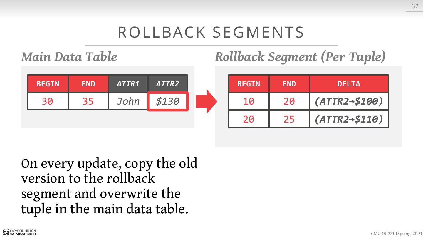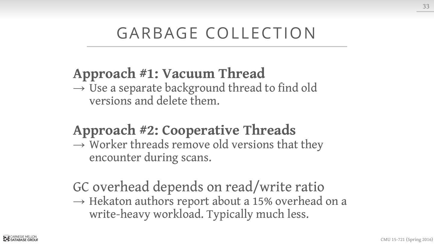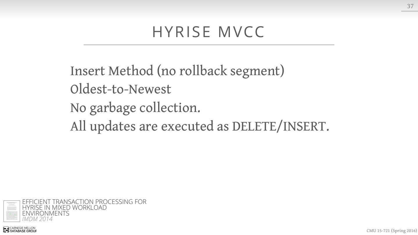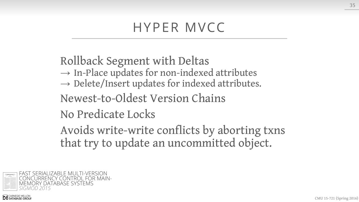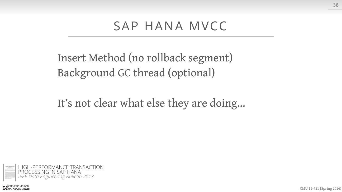 5 . 5 Isolation (High→Low) A N S I I S O L AT I O N L E V E L S SERIALIZABLE → No phantoms, all reads repeatable, no dirty reads. REPEATABLE READS → Phantoms may happen. READ COMMITTED → Phantoms and unrepeatable reads may happen. READ UNCOMMITTED → All of them may happen. CMU 15-721 (Spring 2016)