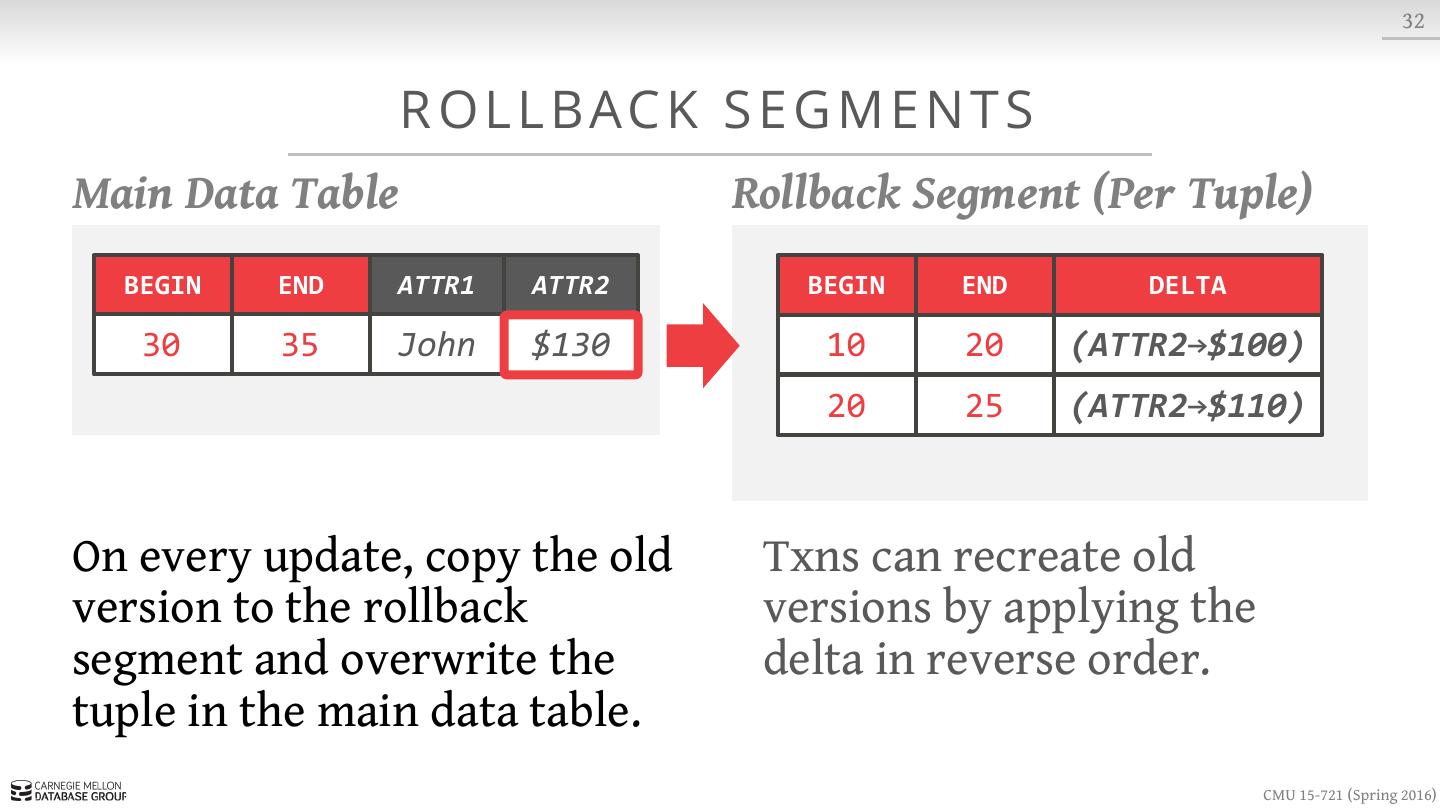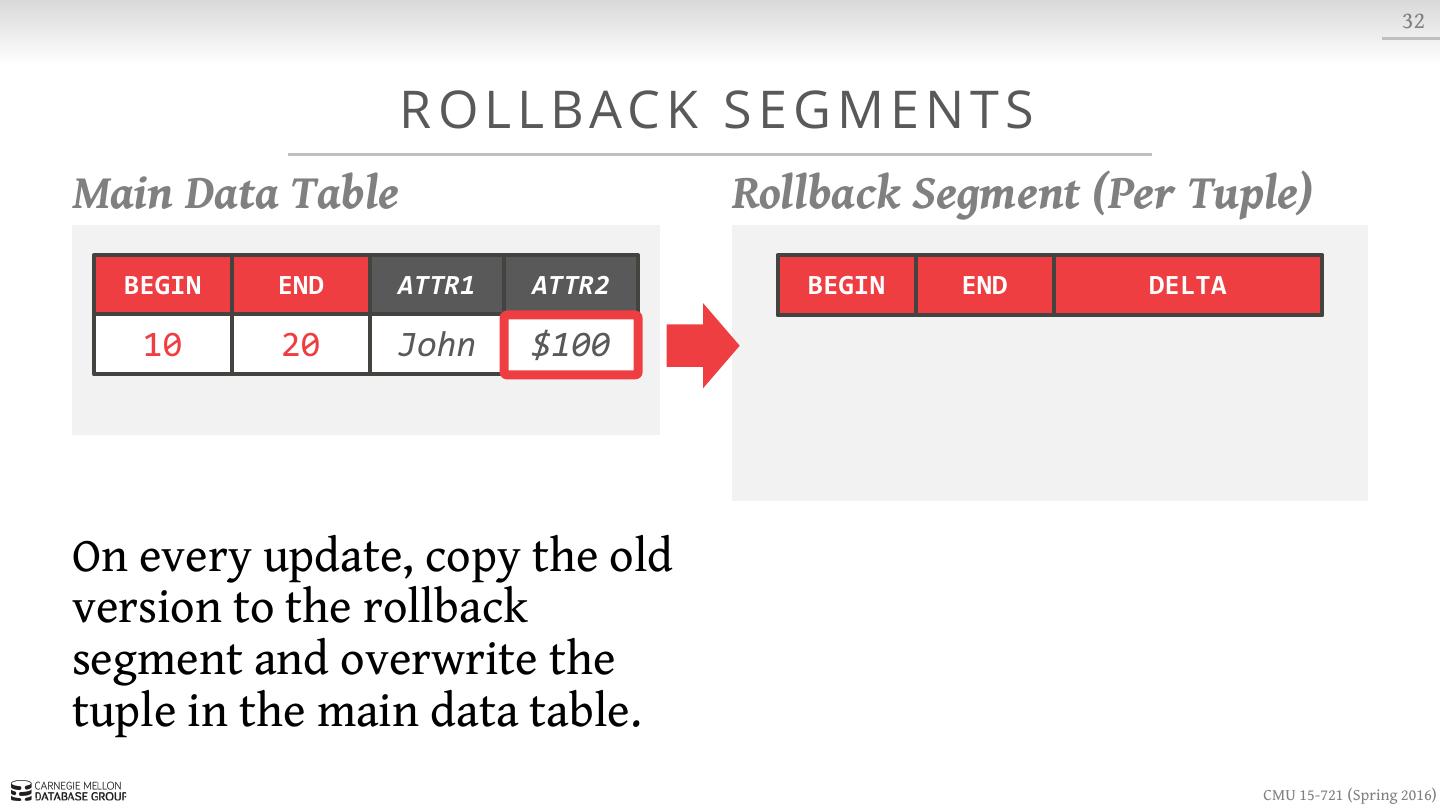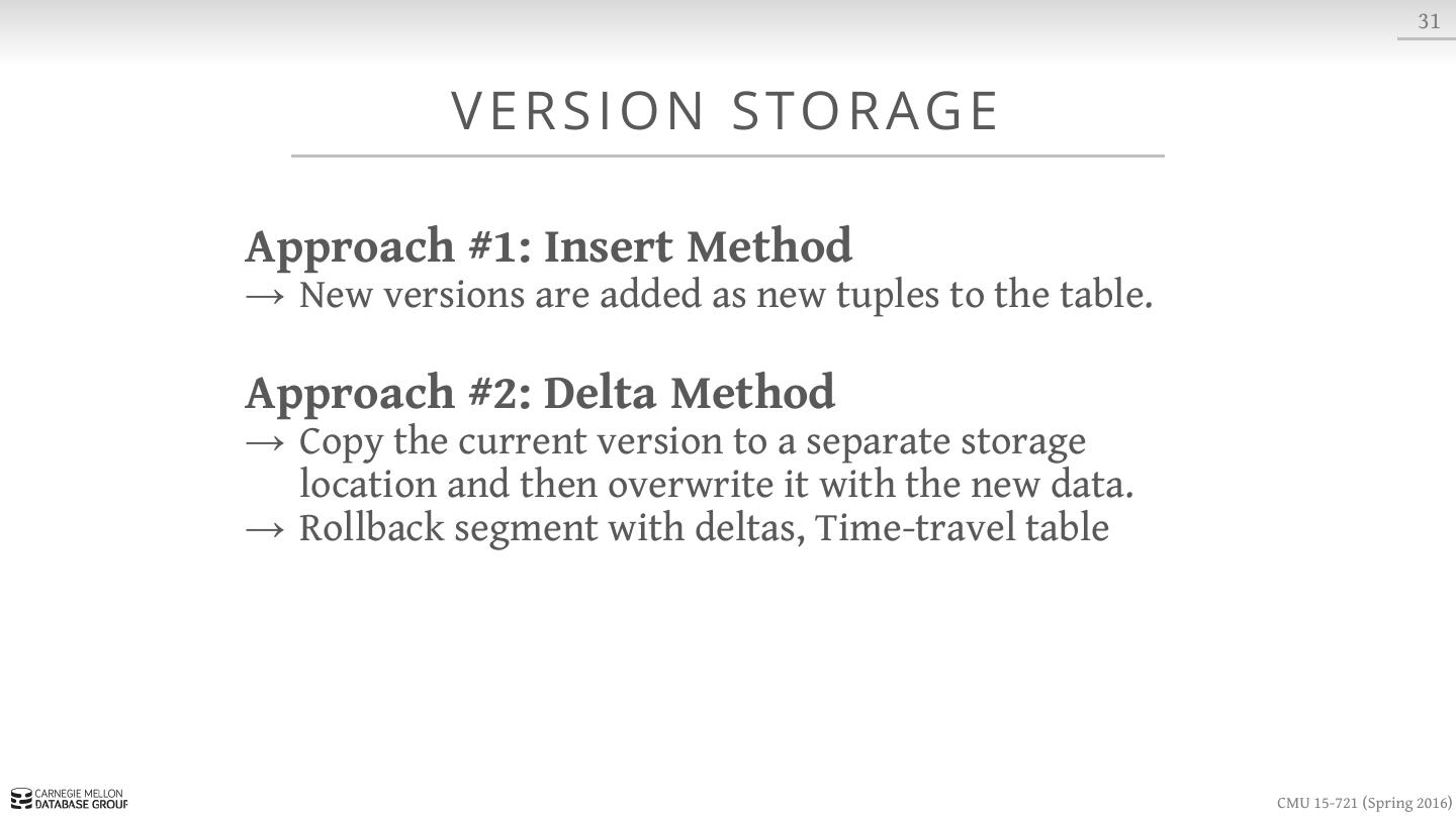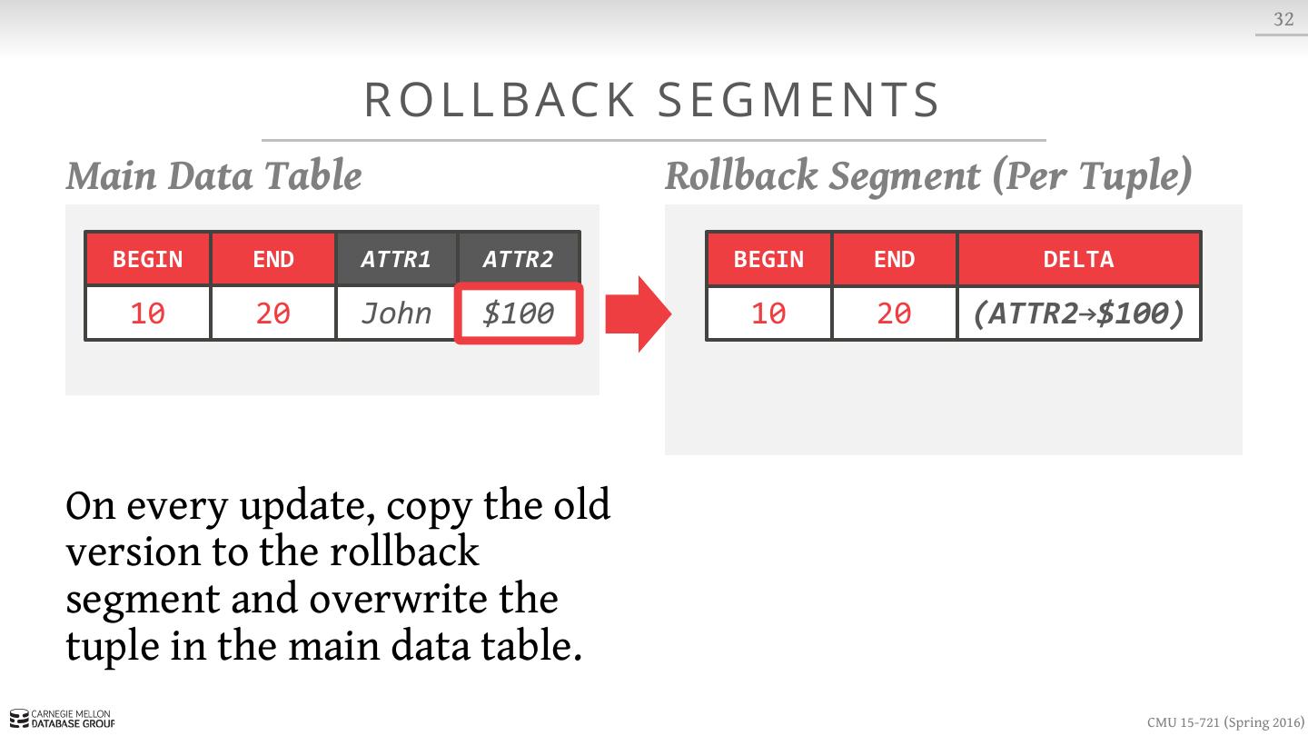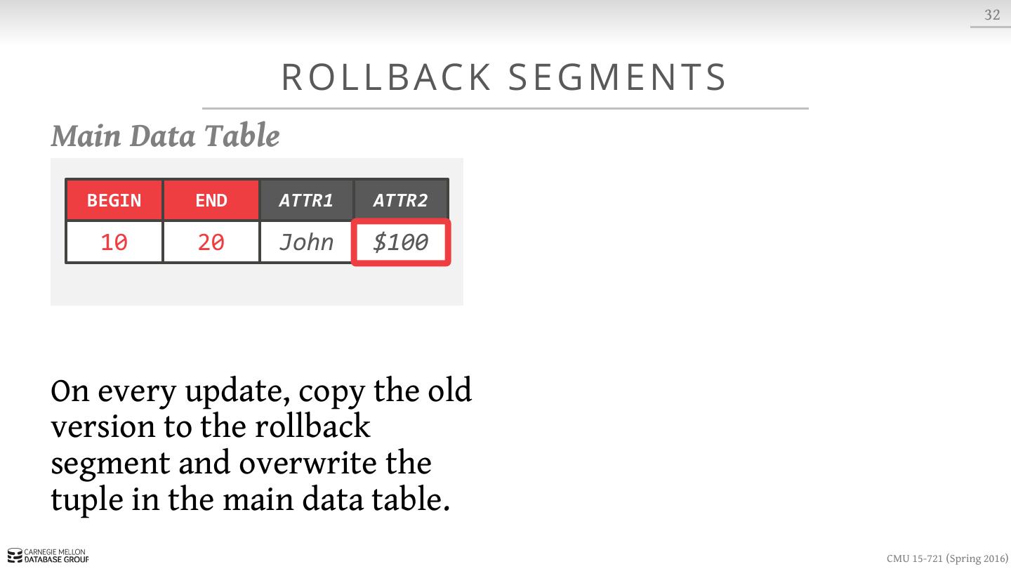 5 . 5 Isolation (High→Low) A N S I I S O L AT I O N L E V E L S SERIALIZABLE → No phantoms, all reads repeatable, no dirty reads. REPEATABLE READS → Phantoms may happen. READ COMMITTED → Phantoms and unrepeatable reads may happen. READ UNCOMMITTED → All of them may happen. CMU 15-721 (Spring 2016)