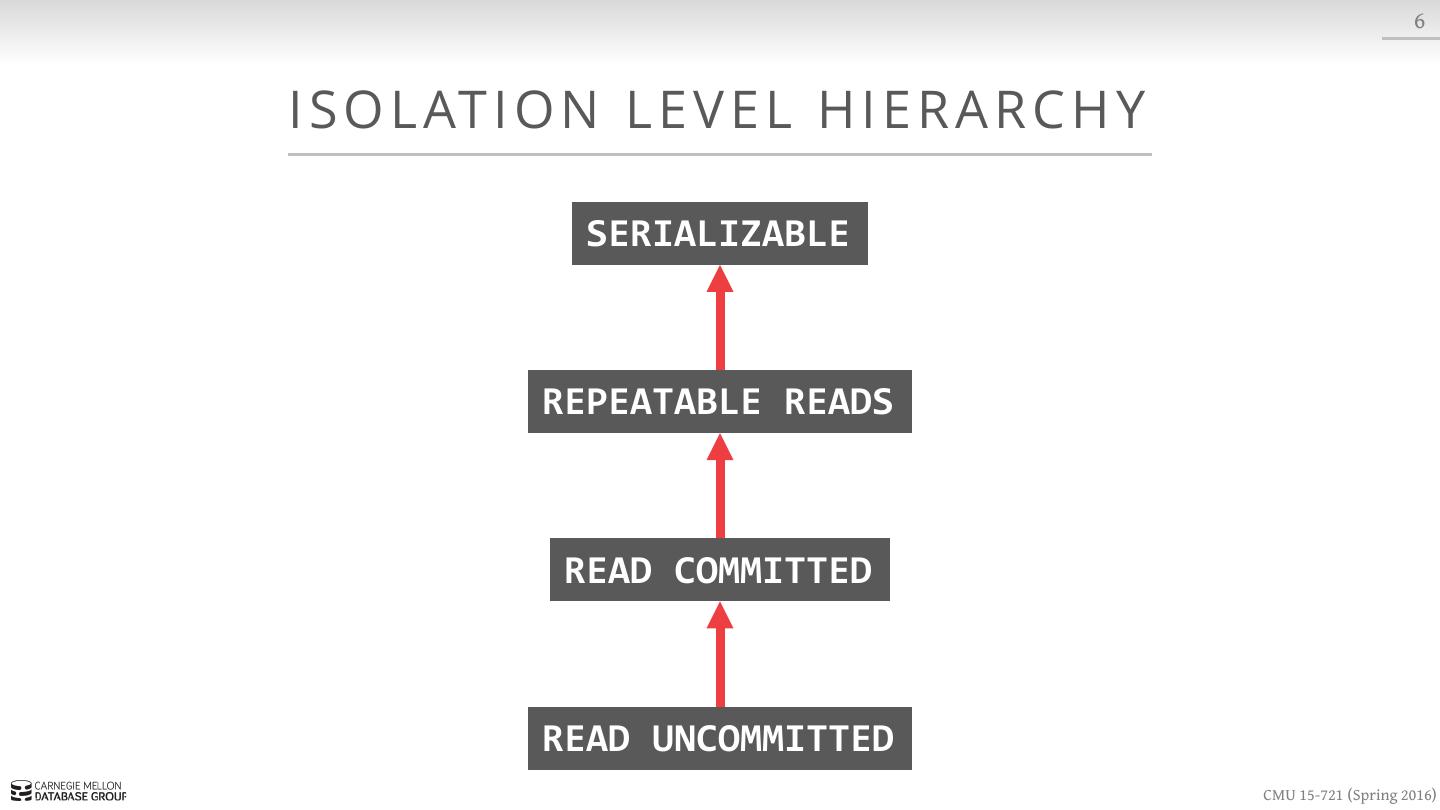 6 . 6 I S O L AT I O N L E V E L H I E R A R C H Y SERIALIZABLE REPEATABLE READS READ COMMITTED READ UNCOMMITTED CMU 15-721 (Spring 2016)