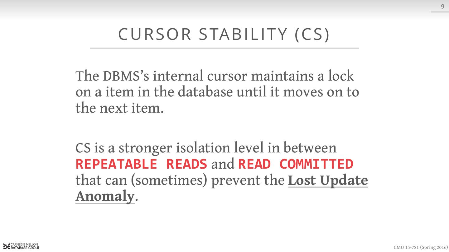 10 . 9 C U R S O R S TA B I L I T Y ( C S ) The DBMS’s internal cursor maintains a lock on a item in the database until it moves on to the next item. CS is a stronger isolation level in between REPEATABLE READS and READ COMMITTED that can (sometimes) prevent the Lost Update Anomaly. CMU 15-721 (Spring 2016)